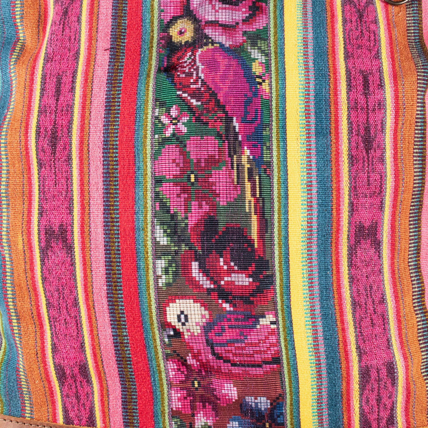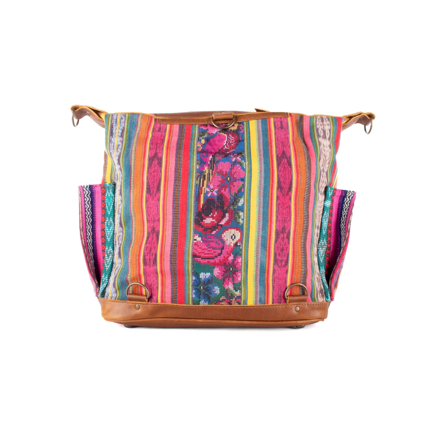 Many unique Maya symbols can be found in our One of a Kind Collection. The fabric we use for this collection is made from upcycled vintage huipiles (traditional attire worn by women in Guatemala) that were handwoven by Artisans up to 10 years ago, and they have lived a full life before being incorporated into your leather bag!
