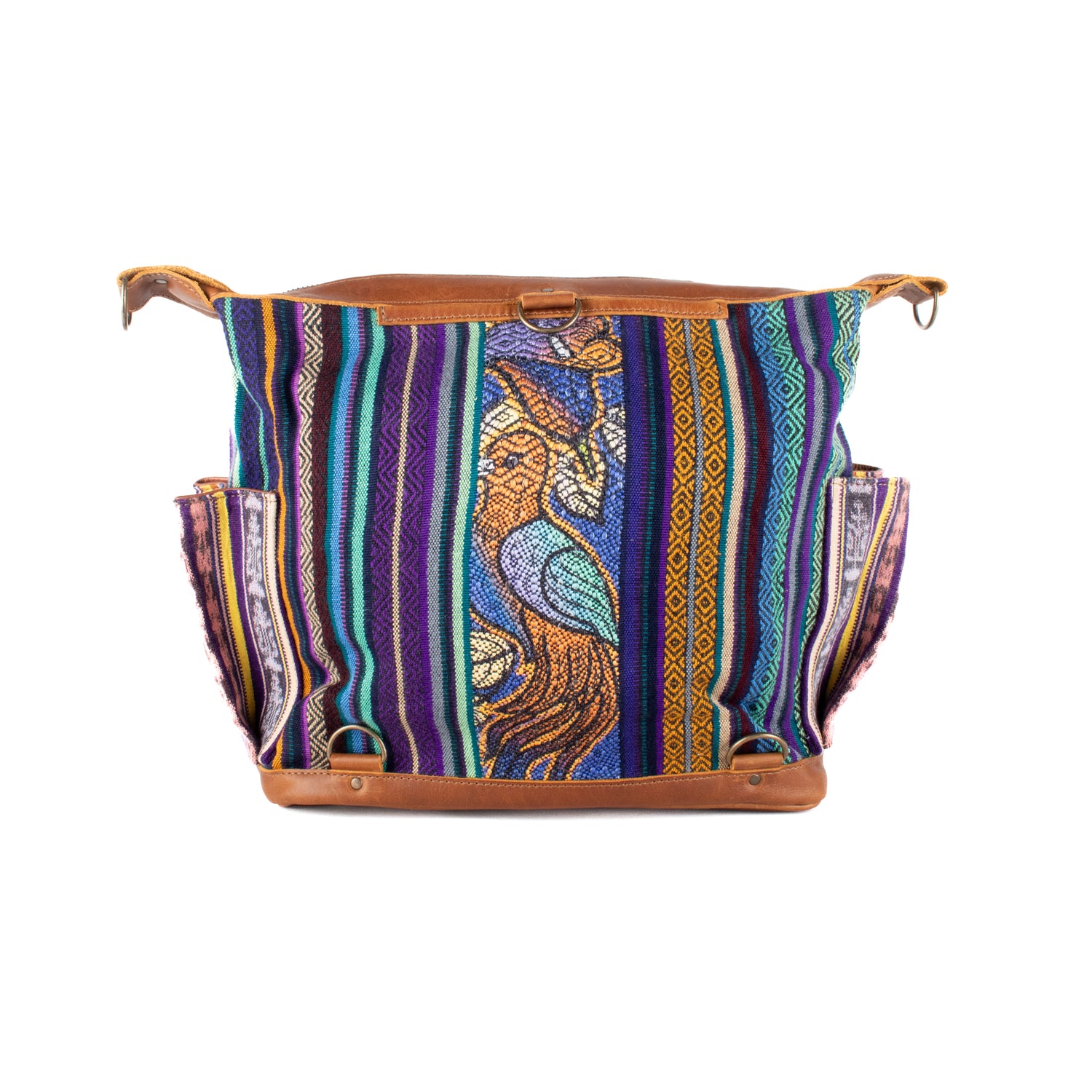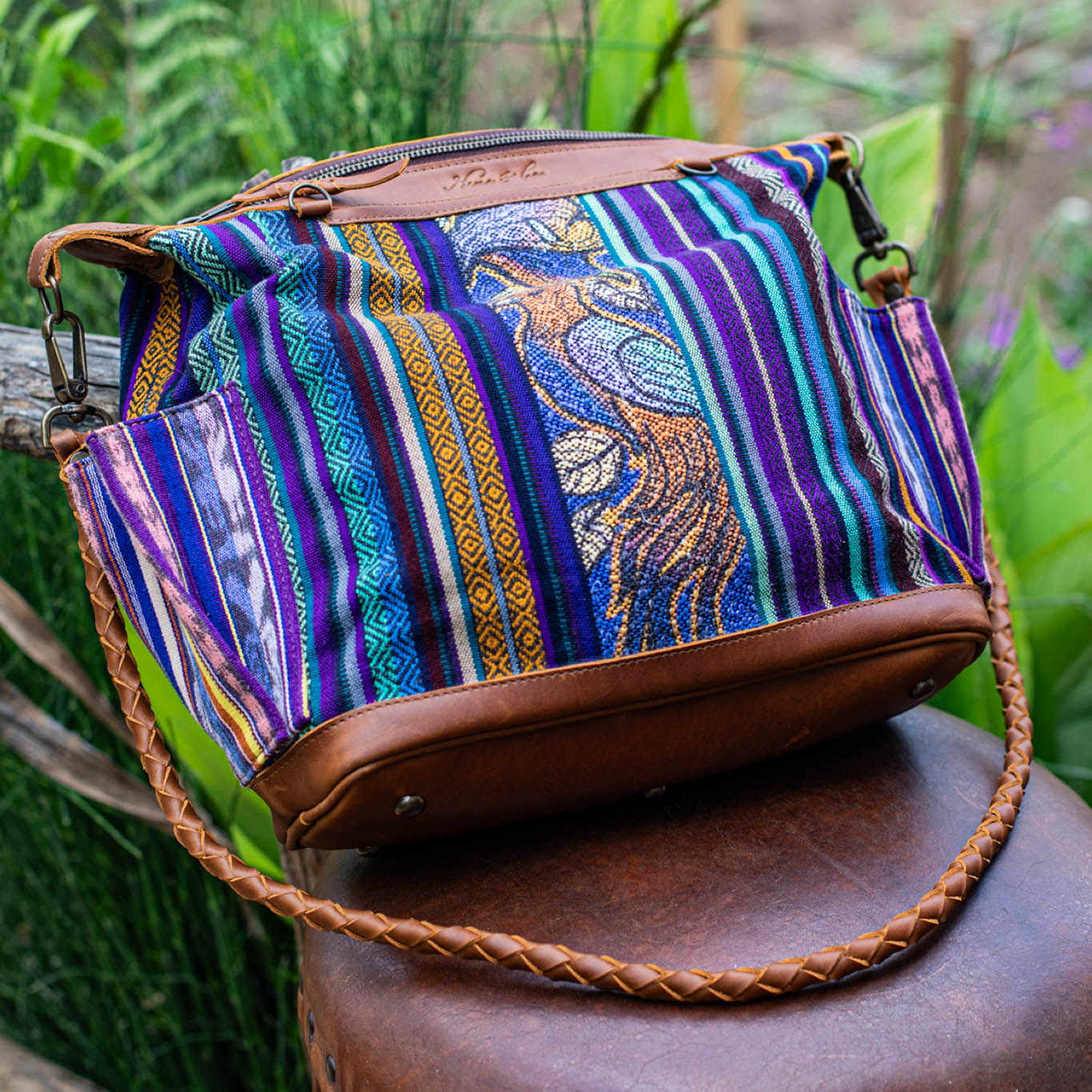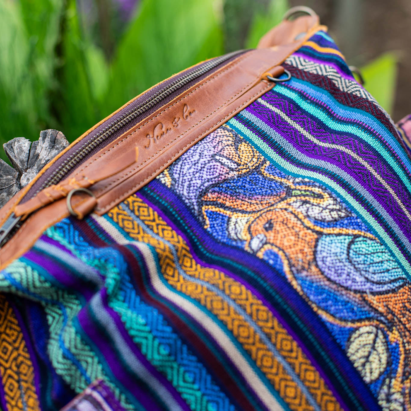 Many unique Maya symbols can be found in our One of a Kind Collection. The fabric we use for this collection is made from upcycled vintage huipiles (traditional attire worn by women in Guatemala) that were handwoven by Artisans up to 10 years ago, and they have lived a full life before being incorporated into your leather bag!