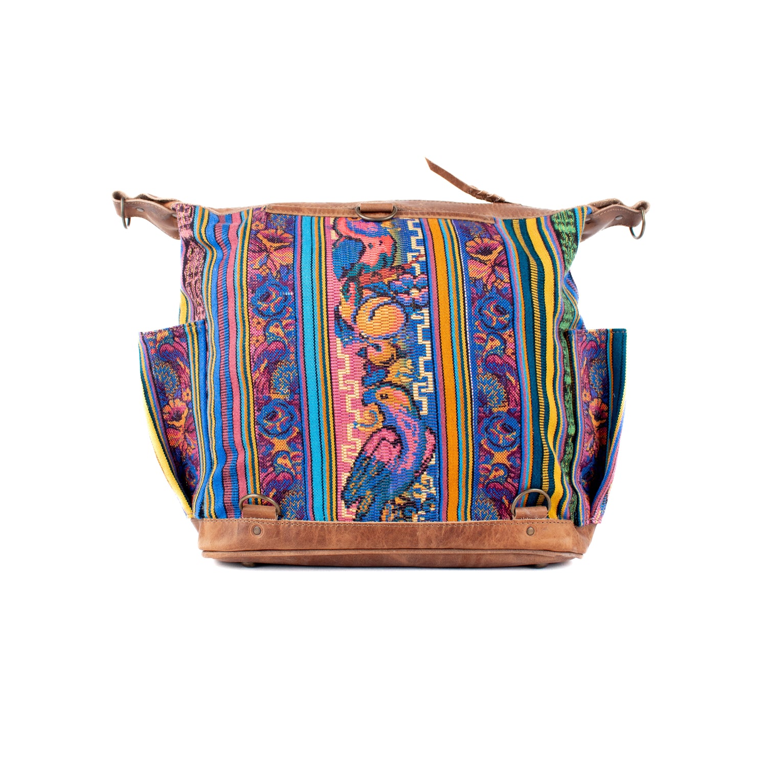 Many unique Maya symbols can be found in our One of a Kind Collection. The fabric we use for this collection is made from upcycled vintage huipiles (traditional attire worn by women in Guatemala) that were handwoven by Artisans up to 10 years ago, and they have lived a full life before being incorporated into your leather bag!