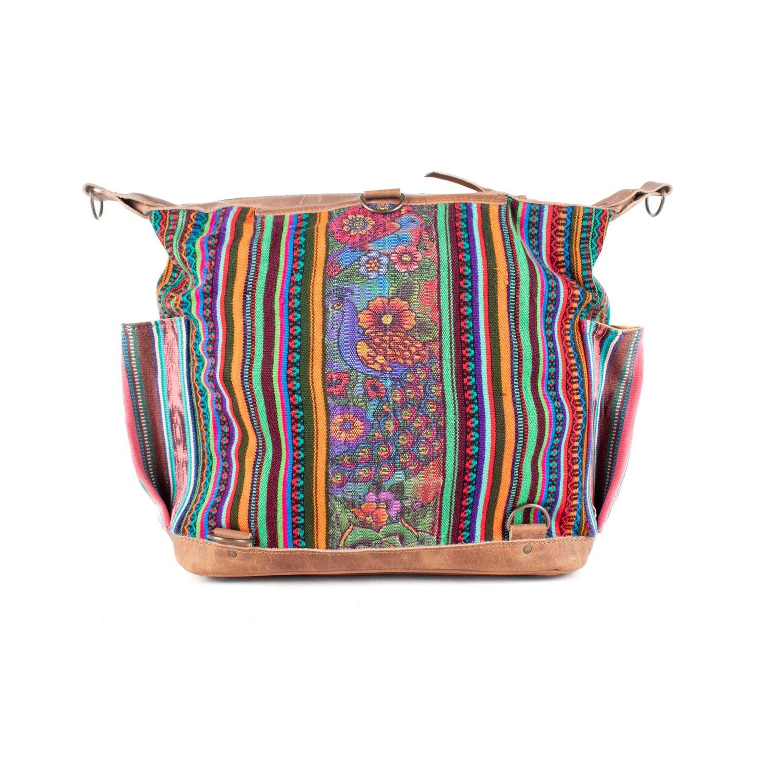 Many unique Maya symbols can be found in our One of a Kind Collection. The fabric we use for this collection is made from upcycled vintage huipiles (traditional attire worn by women in Guatemala) that were handwoven by Artisans up to 10 years ago, and they have lived a full life before being incorporated into your leather bag!