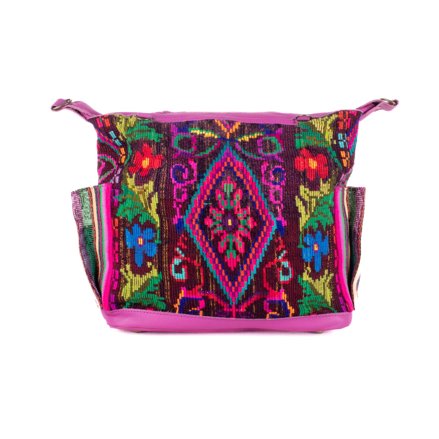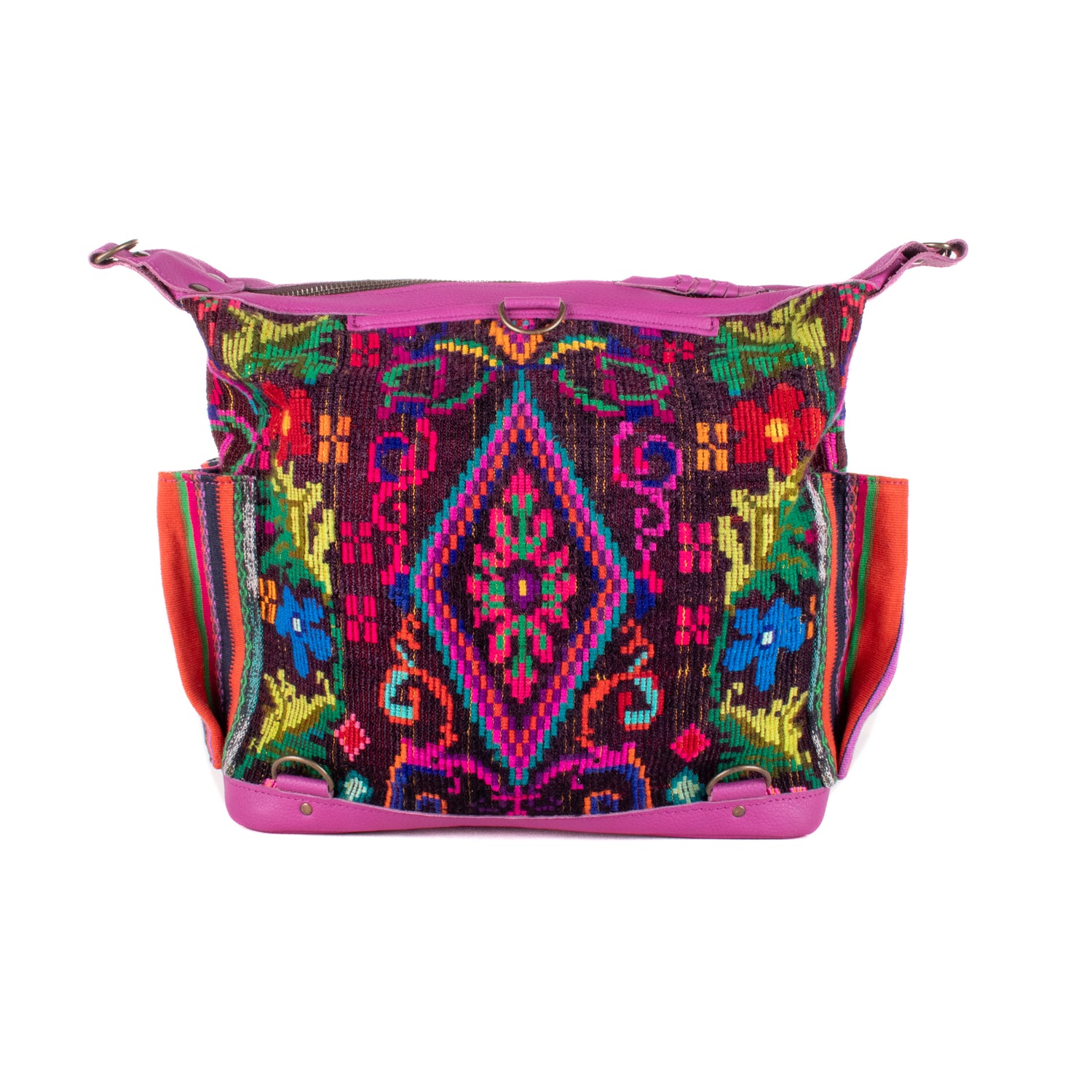 Many unique Maya symbols can be found in our One of a Kind Collection. The fabric we use for this collection is made from upcycled vintage huipiles (traditional attire worn by women in Guatemala) that were handwoven by Artisans up to 10 years ago, and they have lived a full life before being incorporated into your leather bag!