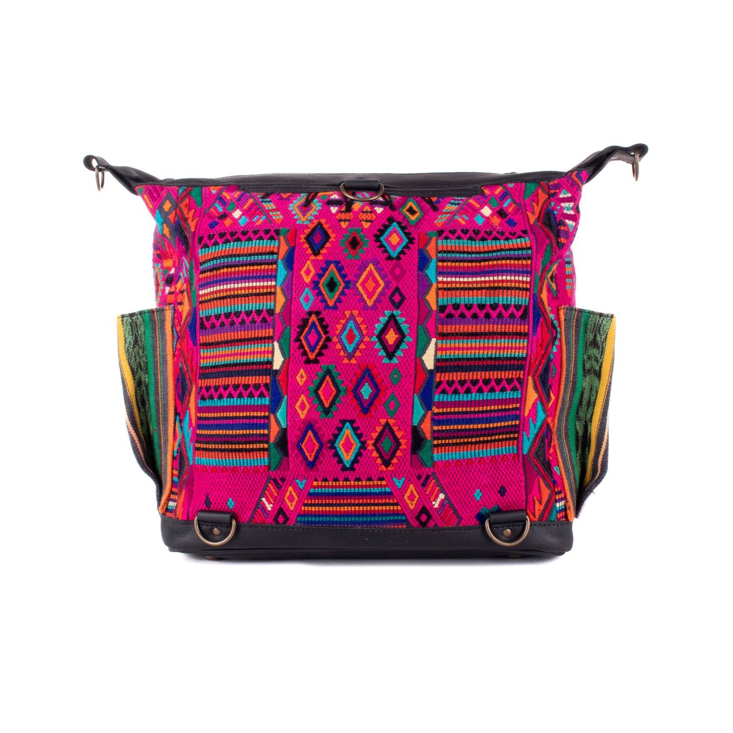 Many unique Maya symbols can be found in our One of a Kind Collection. The fabric we use for this collection is made from upcycled vintage huipiles (traditional attire worn by women in Guatemala) that were handwoven by Artisans up to 10 years ago, and they have lived a full life before being incorporated into your leather bag!
