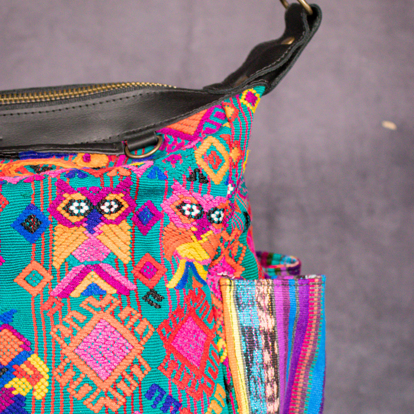 Many unique Maya symbols can be found in our One of a Kind Collection. The fabric we use for this collection is made from upcycled vintage huipiles (traditional attire worn by women in Guatemala) that were handwoven by Artisans up to 10 years ago, and they have lived a full life before being incorporated into your leather bag!