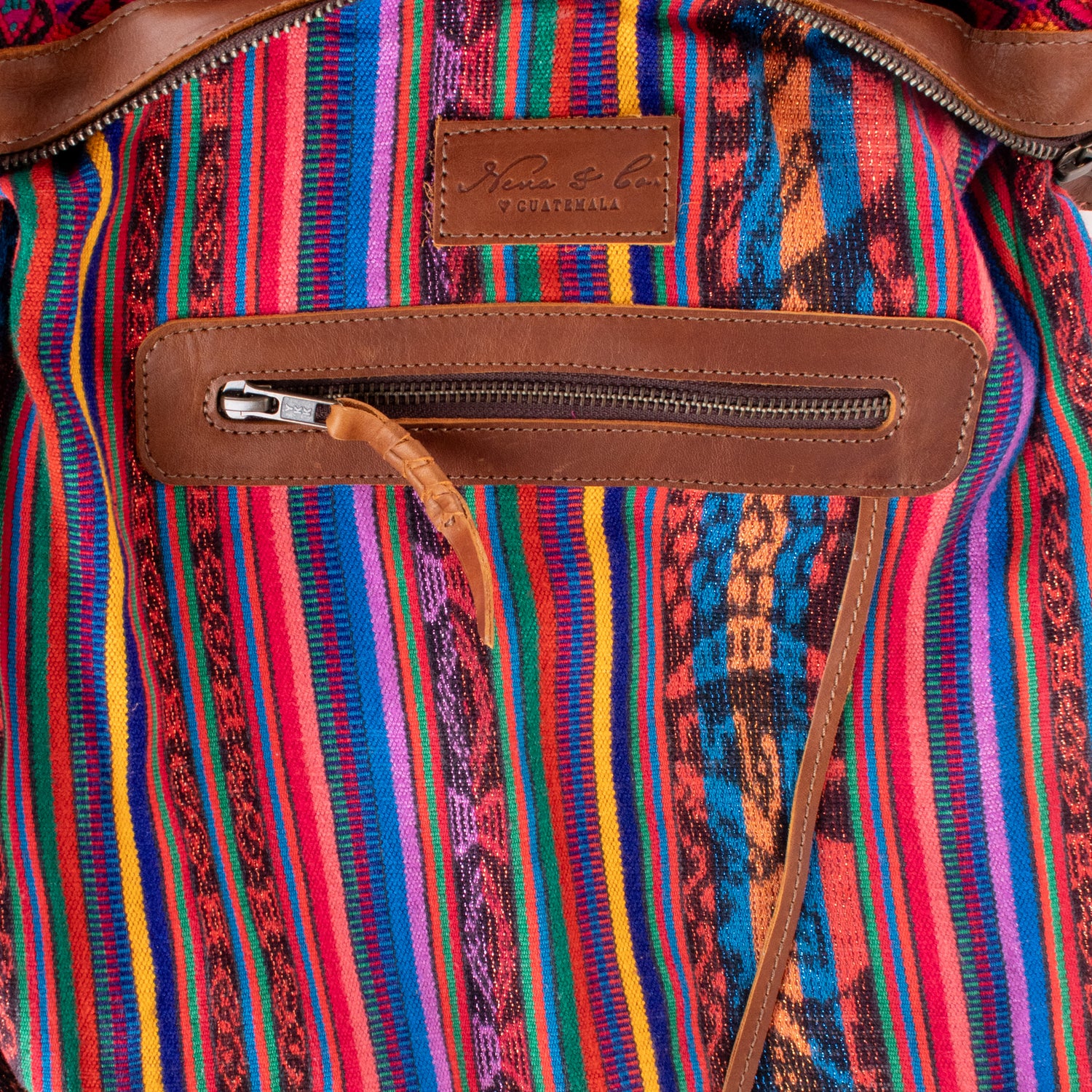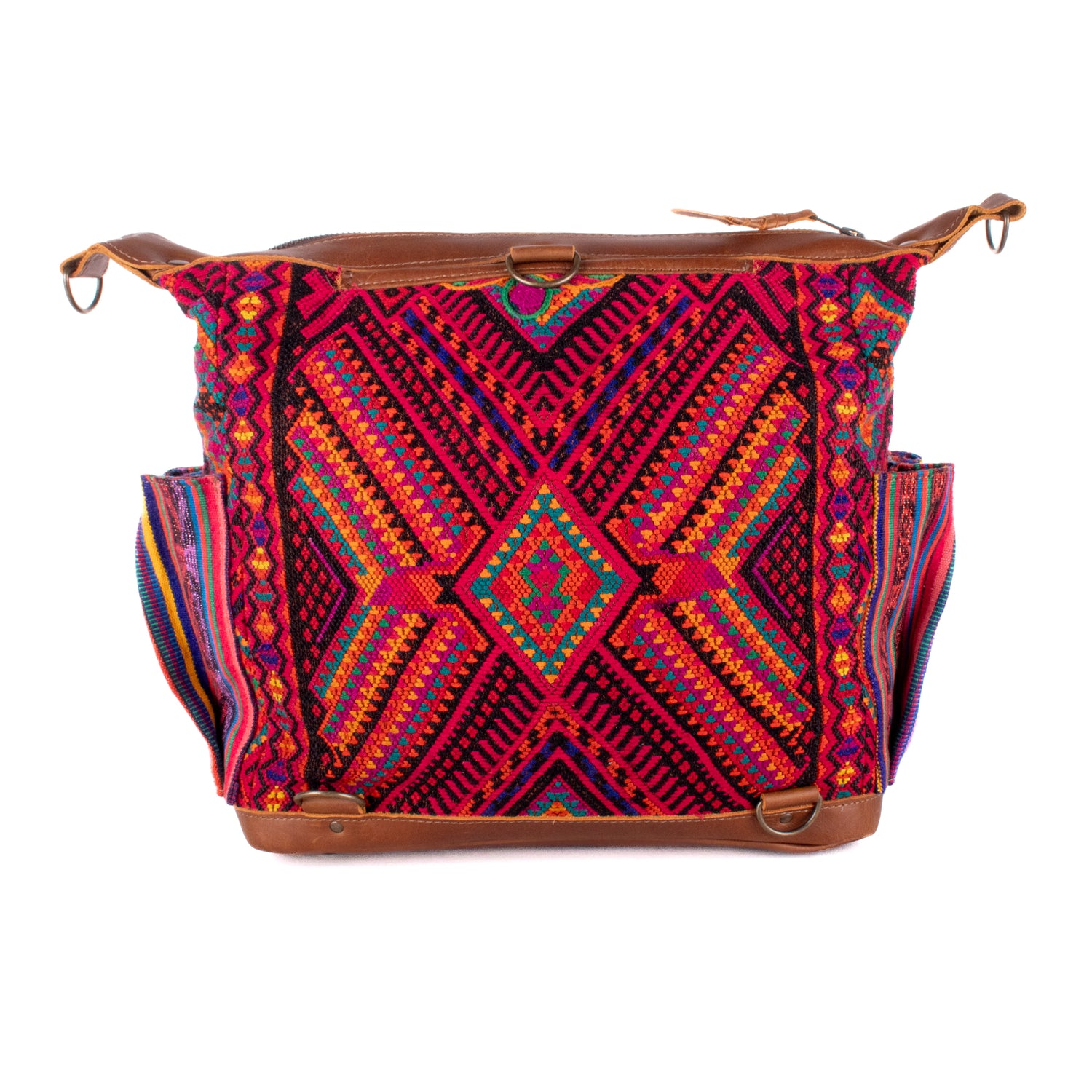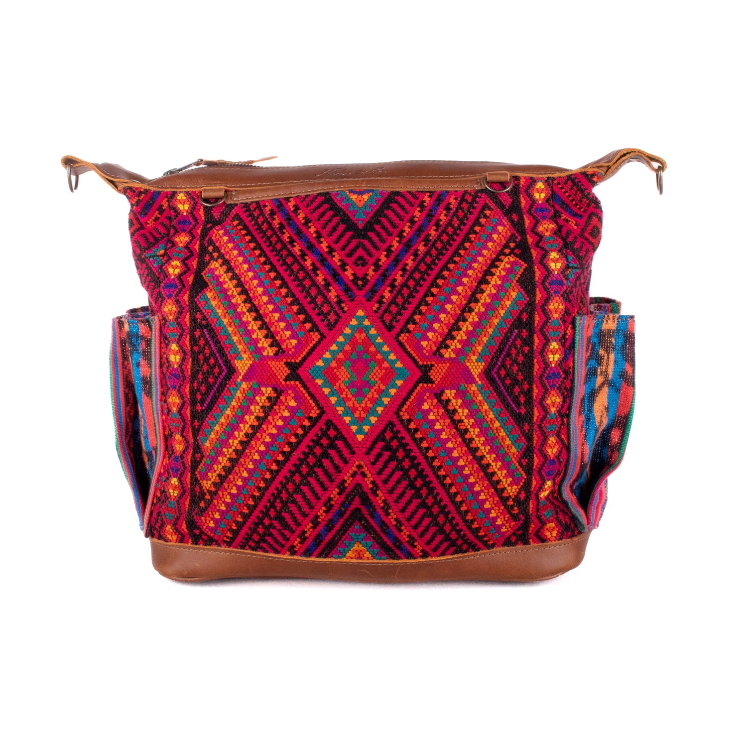 Many unique Maya symbols can be found in our One of a Kind Collection. The fabric we use for this collection is made from upcycled vintage huipiles (traditional attire worn by women in Guatemala) that were handwoven by Artisans up to 10 years ago, and they have lived a full life before being incorporated into your leather bag!
