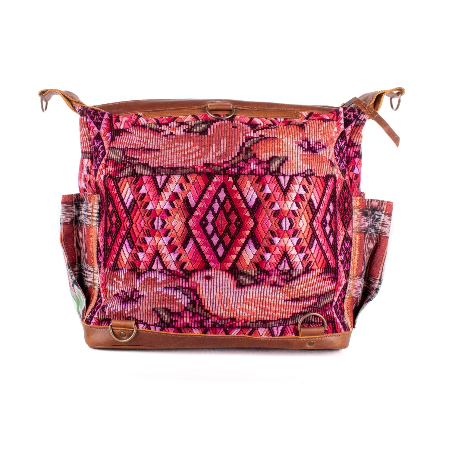 Many unique Maya symbols can be found in our One of a Kind Collection. The fabric we use for this collection is made from upcycled vintage huipiles (traditional attire worn by women in Guatemala) that were handwoven by Artisans up to 10 years ago, and they have lived a full life before being incorporated into your leather bag!