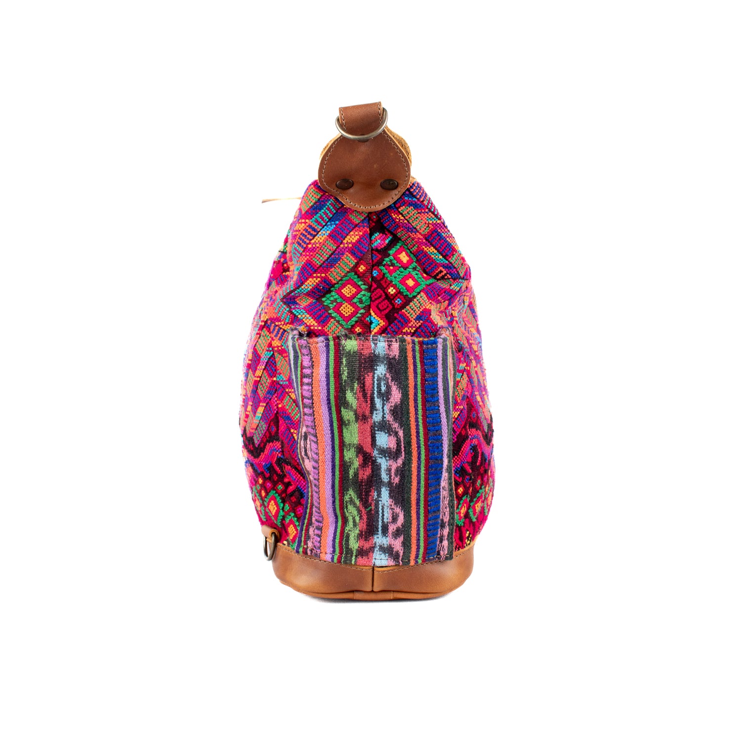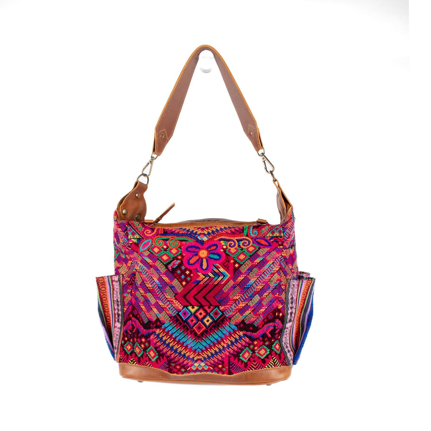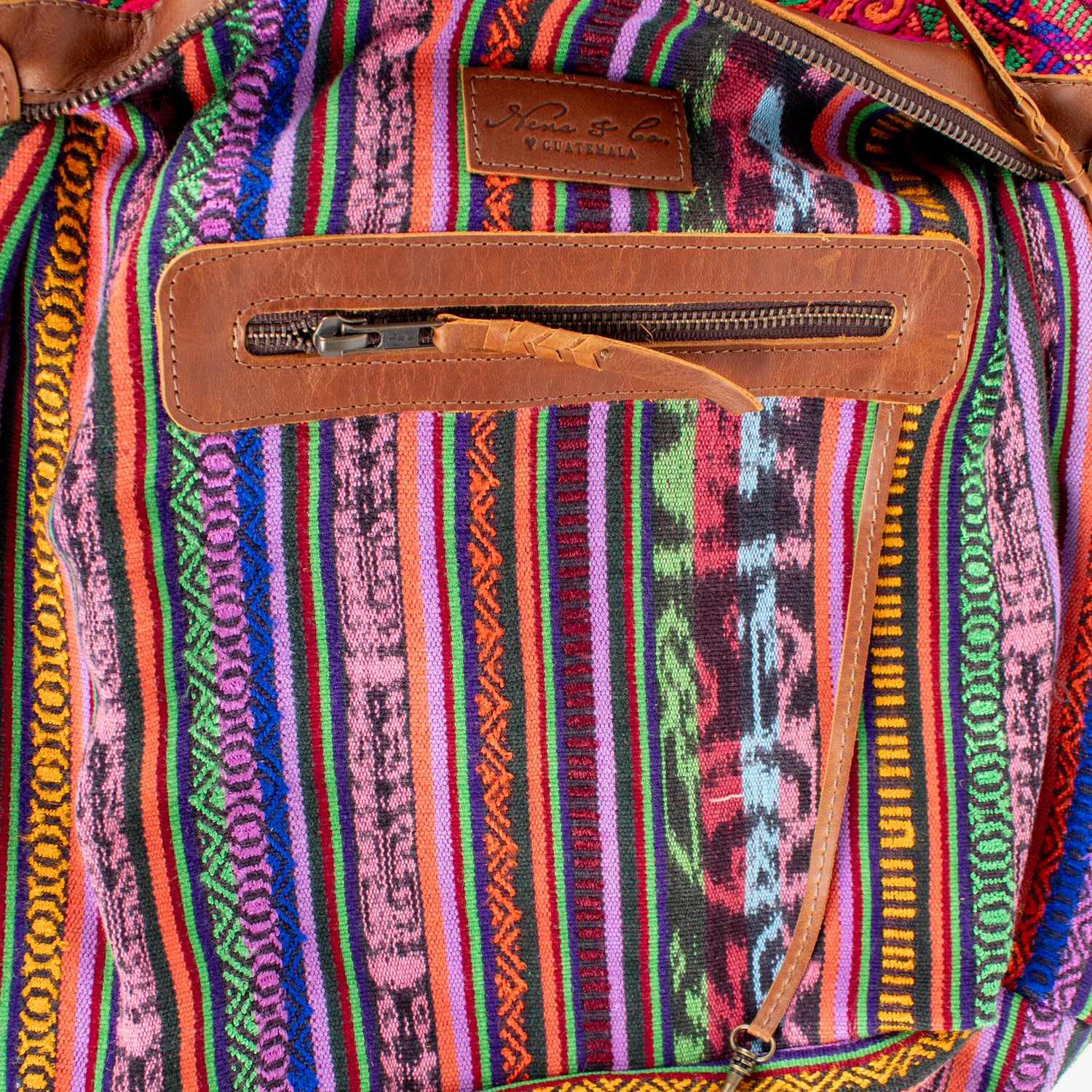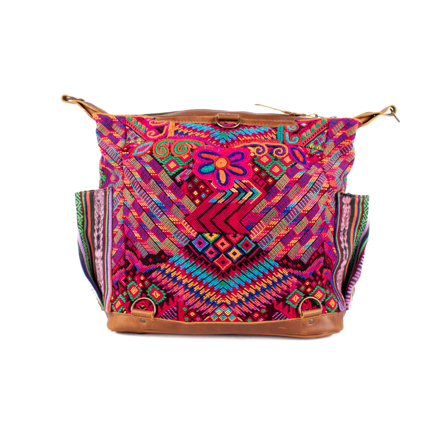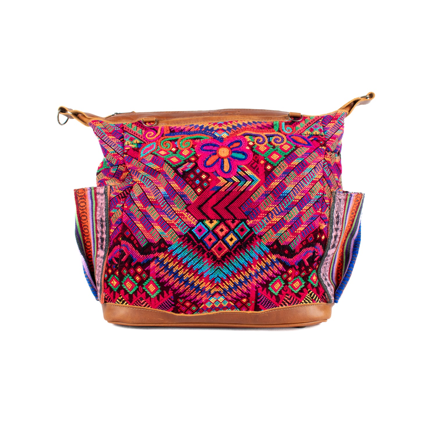 Many unique Maya symbols can be found in our One of a Kind Collection. The fabric we use for this collection is made from upcycled vintage huipiles (traditional attire worn by women in Guatemala) that were handwoven by Artisans up to 10 years ago, and they have lived a full life before being incorporated into your leather bag!