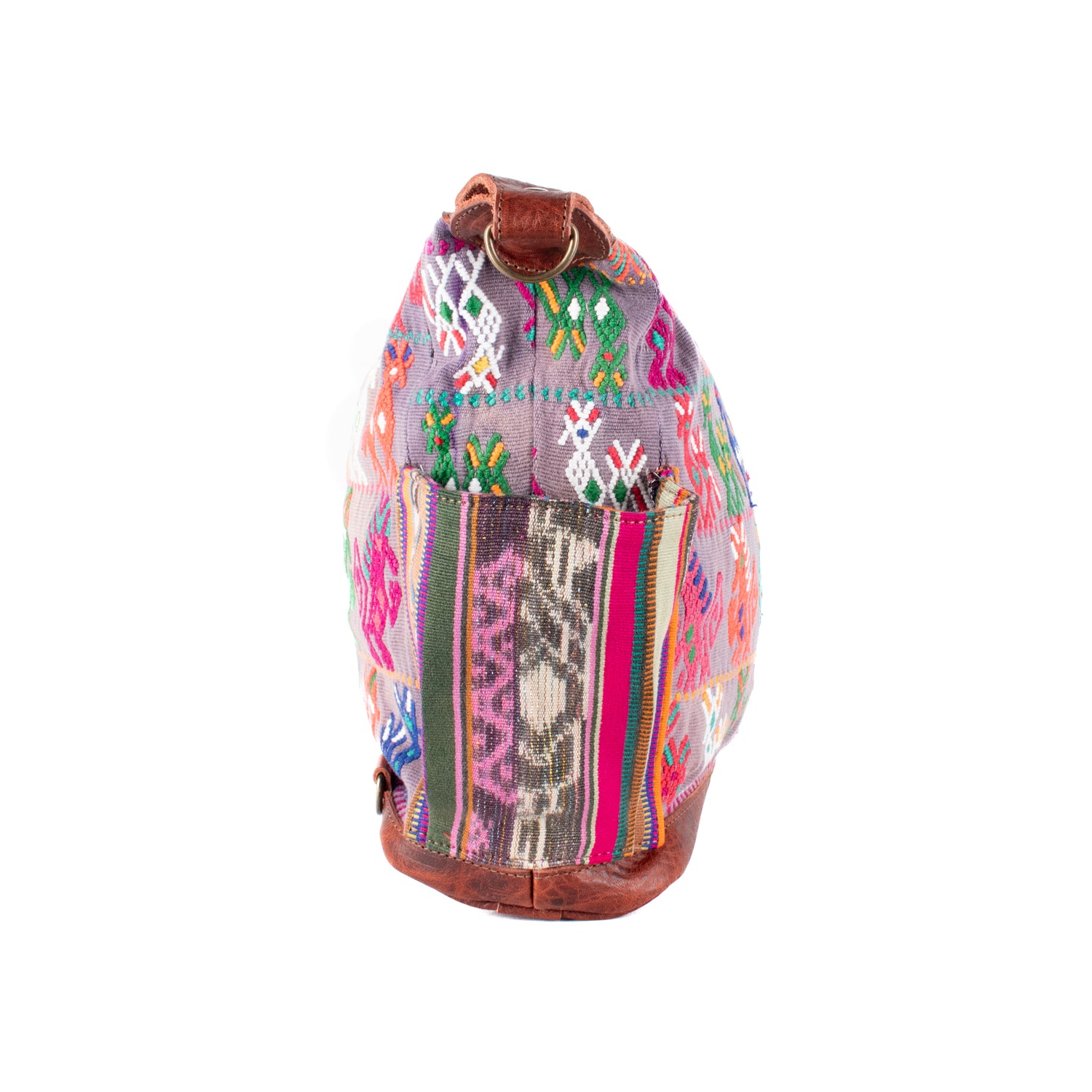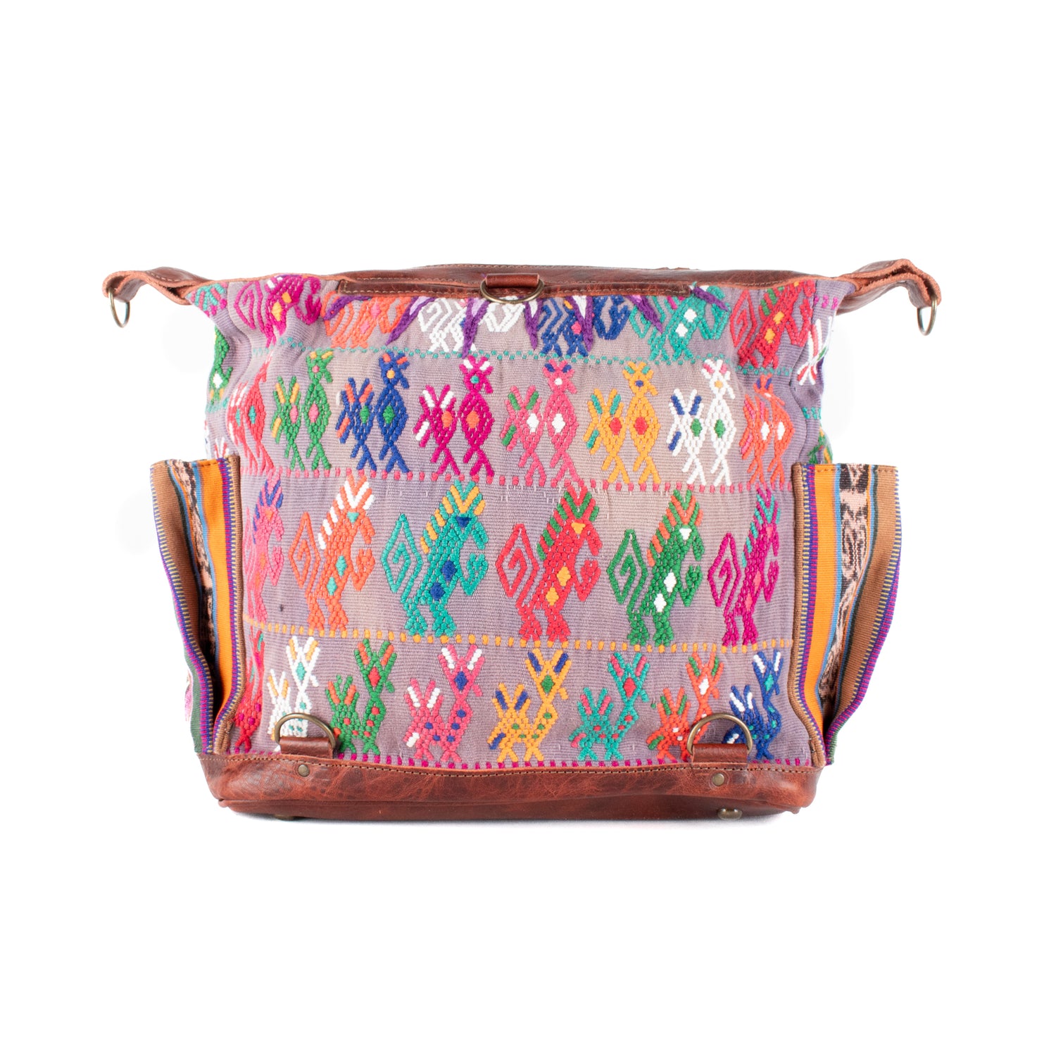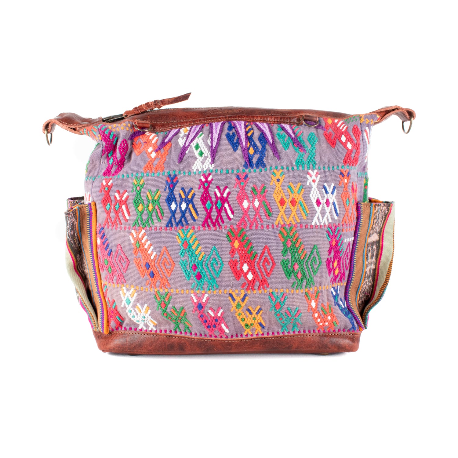 Many unique Maya symbols can be found in our One of a Kind Collection. The fabric we use for this collection is made from upcycled vintage huipiles (traditional attire worn by women in Guatemala) that were handwoven by Artisans up to 10 years ago, and they have lived a full life before being incorporated into your leather bag!