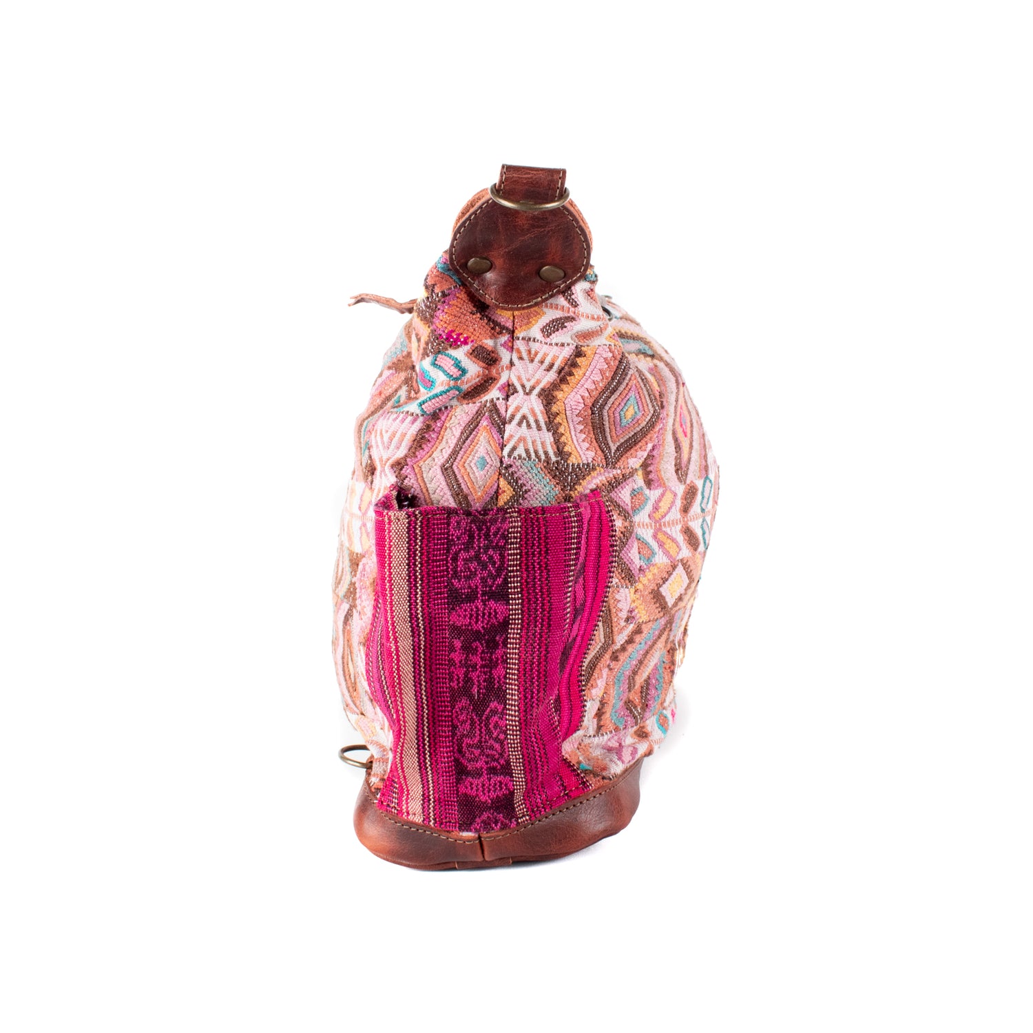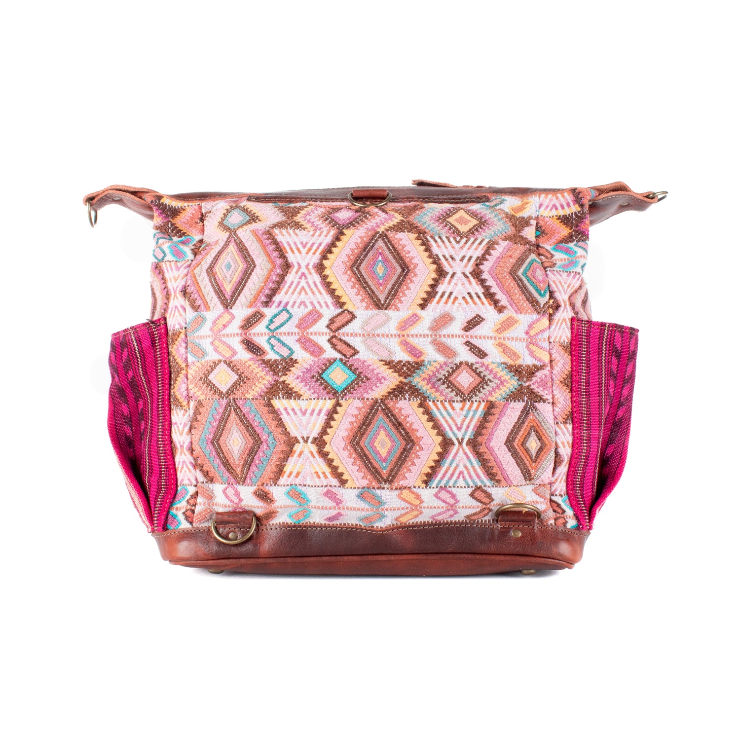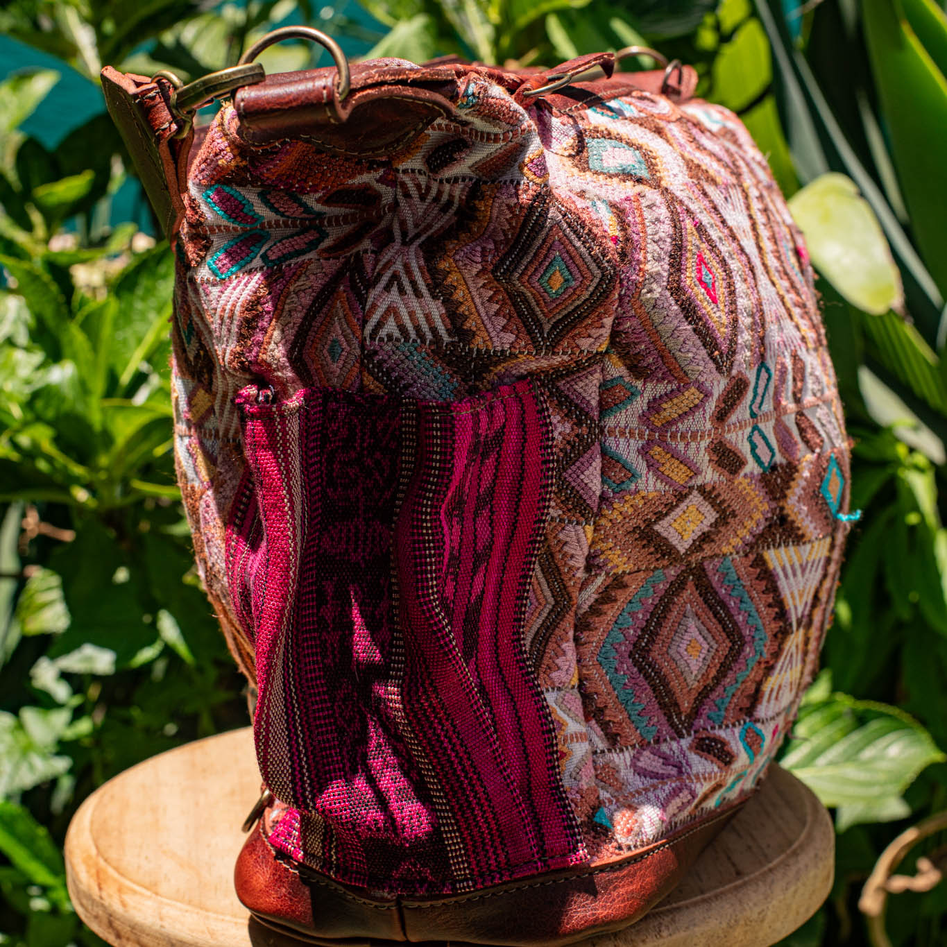 Many unique Maya symbols can be found in our One of a Kind Collection. The fabric we use for this collection is made from upcycled vintage huipiles (traditional attire worn by women in Guatemala) that were handwoven by Artisans up to 10 years ago, and they have lived a full life before being incorporated into your leather bag!