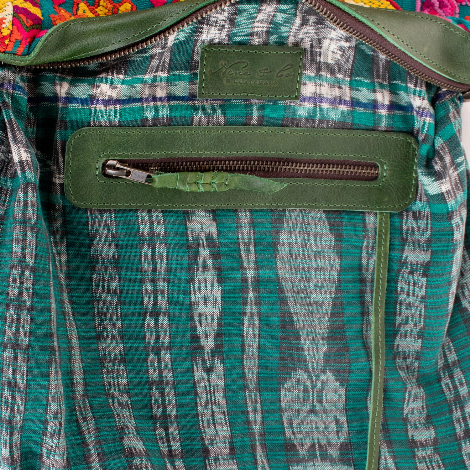 Many unique Maya symbols can be found in our One of a Kind Collection. The fabric we use for this collection is made from upcycled vintage huipiles (traditional attire worn by women in Guatemala) that were handwoven by Artisans up to 10 years ago, and they have lived a full life before being incorporated into your leather bag!