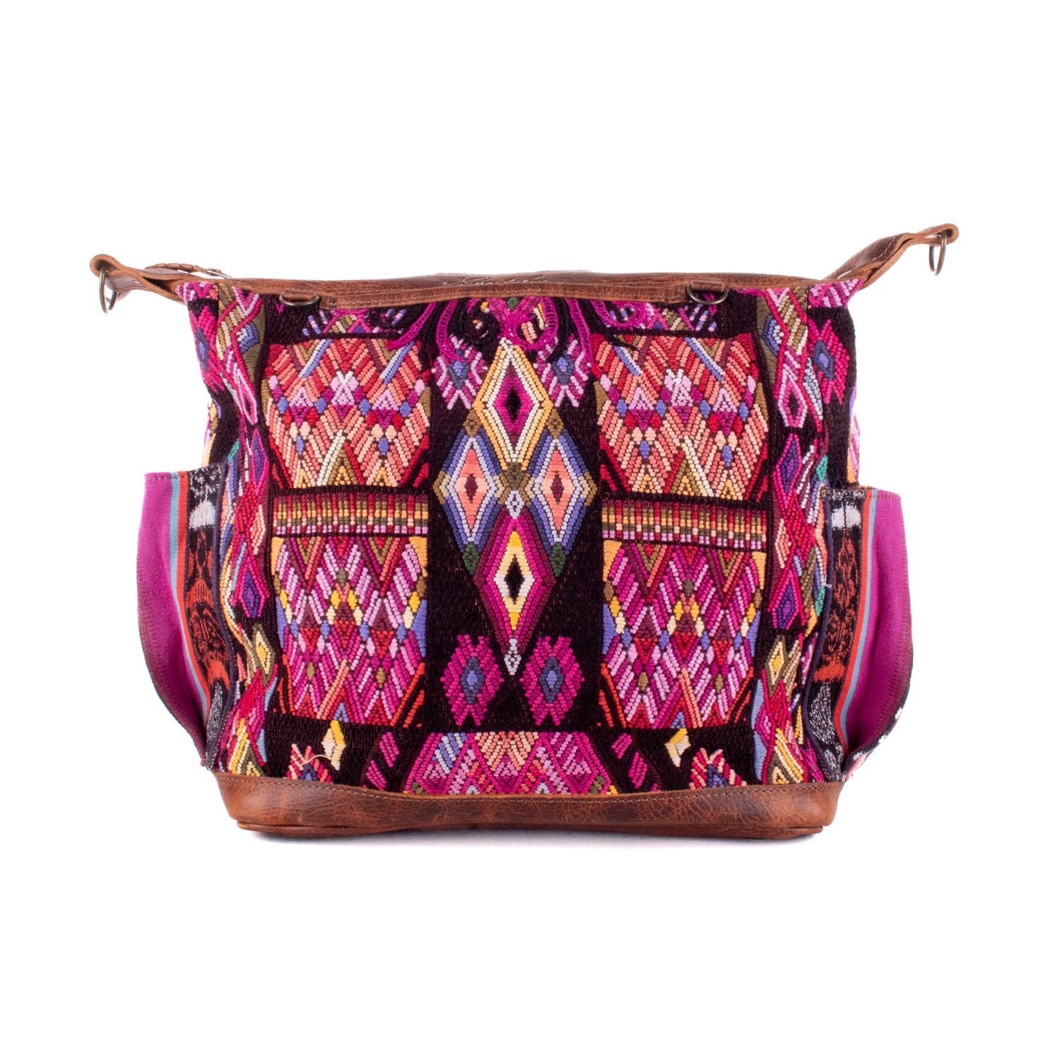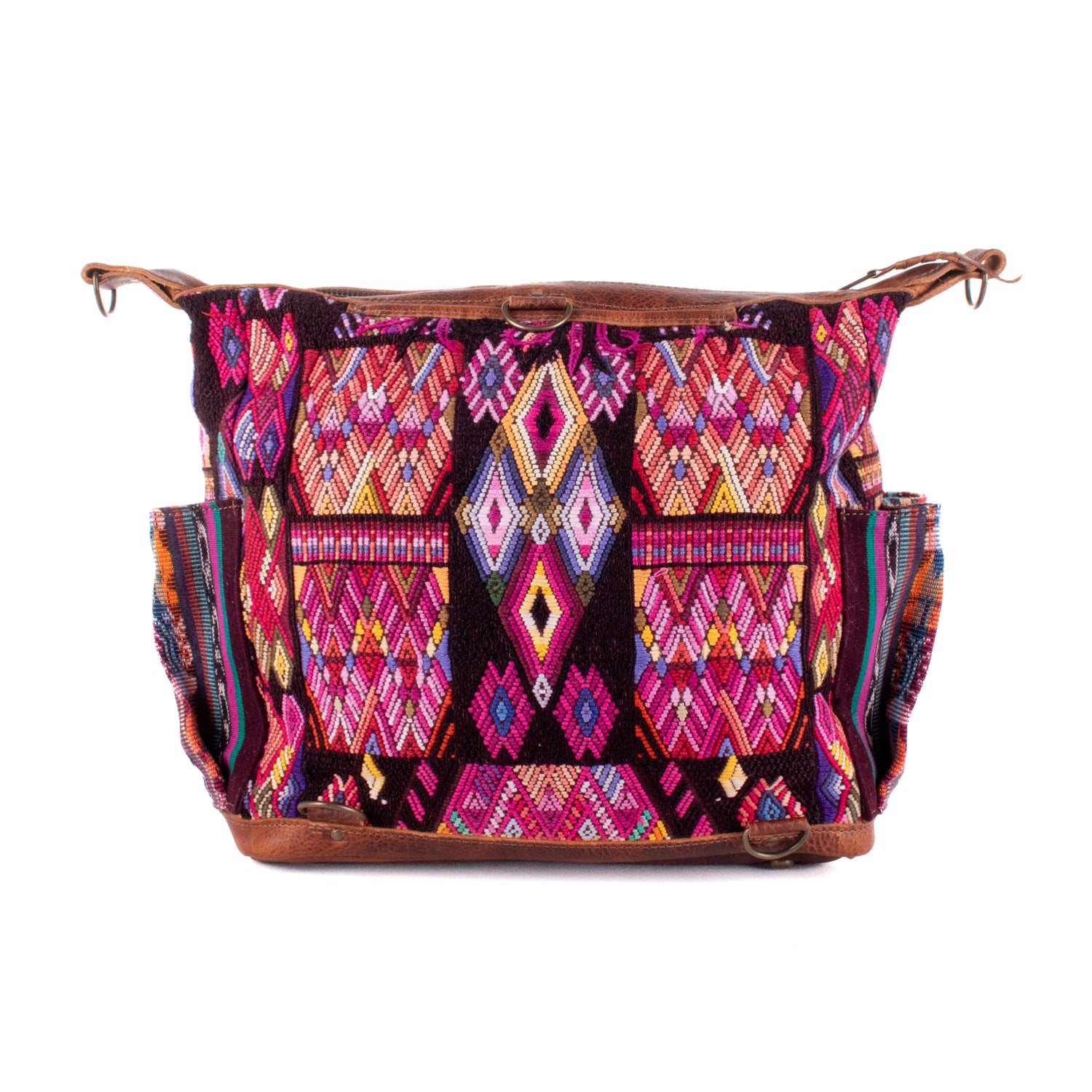 Many unique Maya symbols can be found in our One of a Kind Collection. The fabric we use for this collection is made from upcycled vintage huipiles (traditional attire worn by women in Guatemala) that were handwoven by Artisans up to 10 years ago, and they have lived a full life before being incorporated into your leather bag!