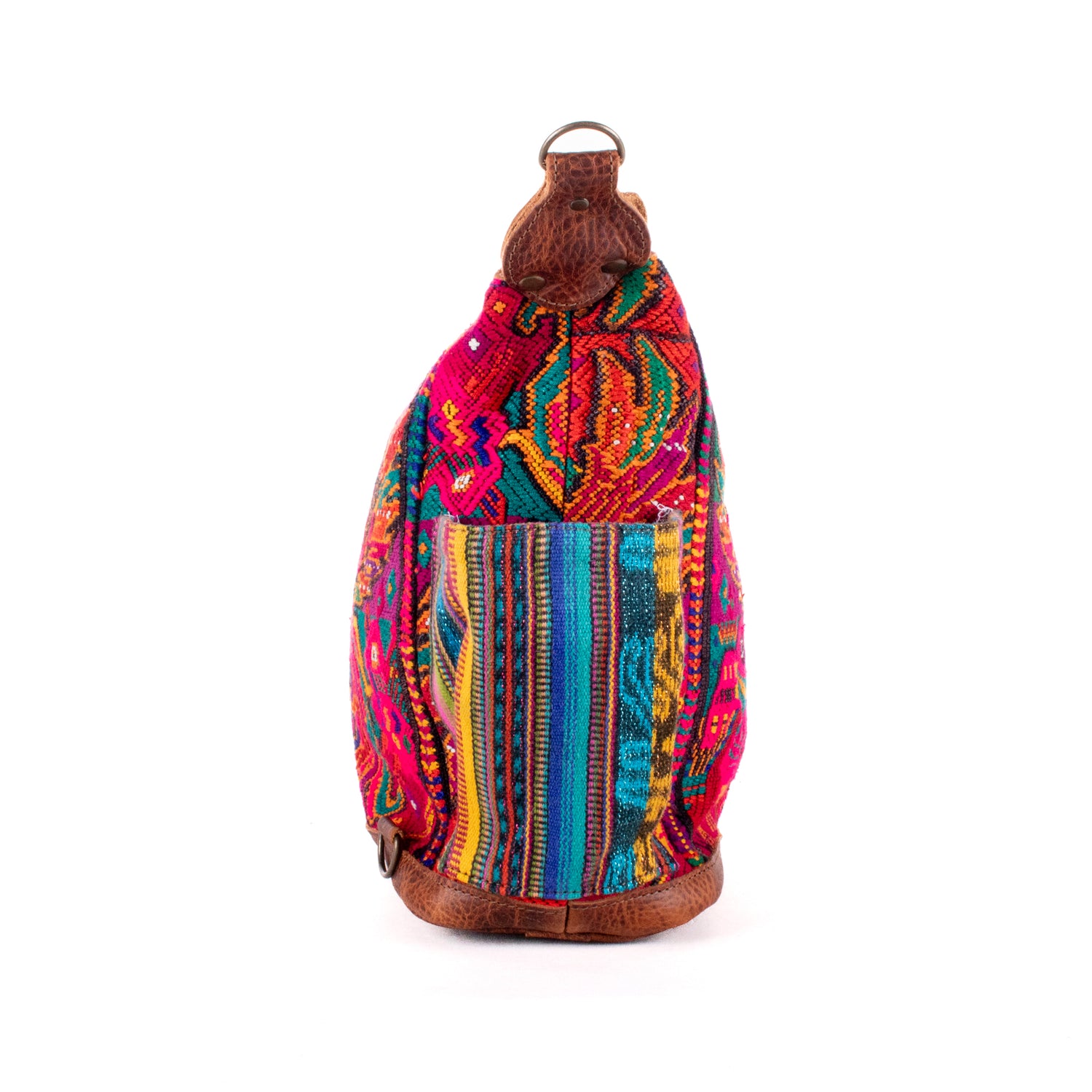 Many unique Maya symbols can be found in our One of a Kind Collection. The fabric we use for this collection is made from upcycled vintage huipiles (traditional attire worn by women in Guatemala) that were handwoven by Artisans up to 10 years ago, and they have lived a full life before being incorporated into your leather bag!