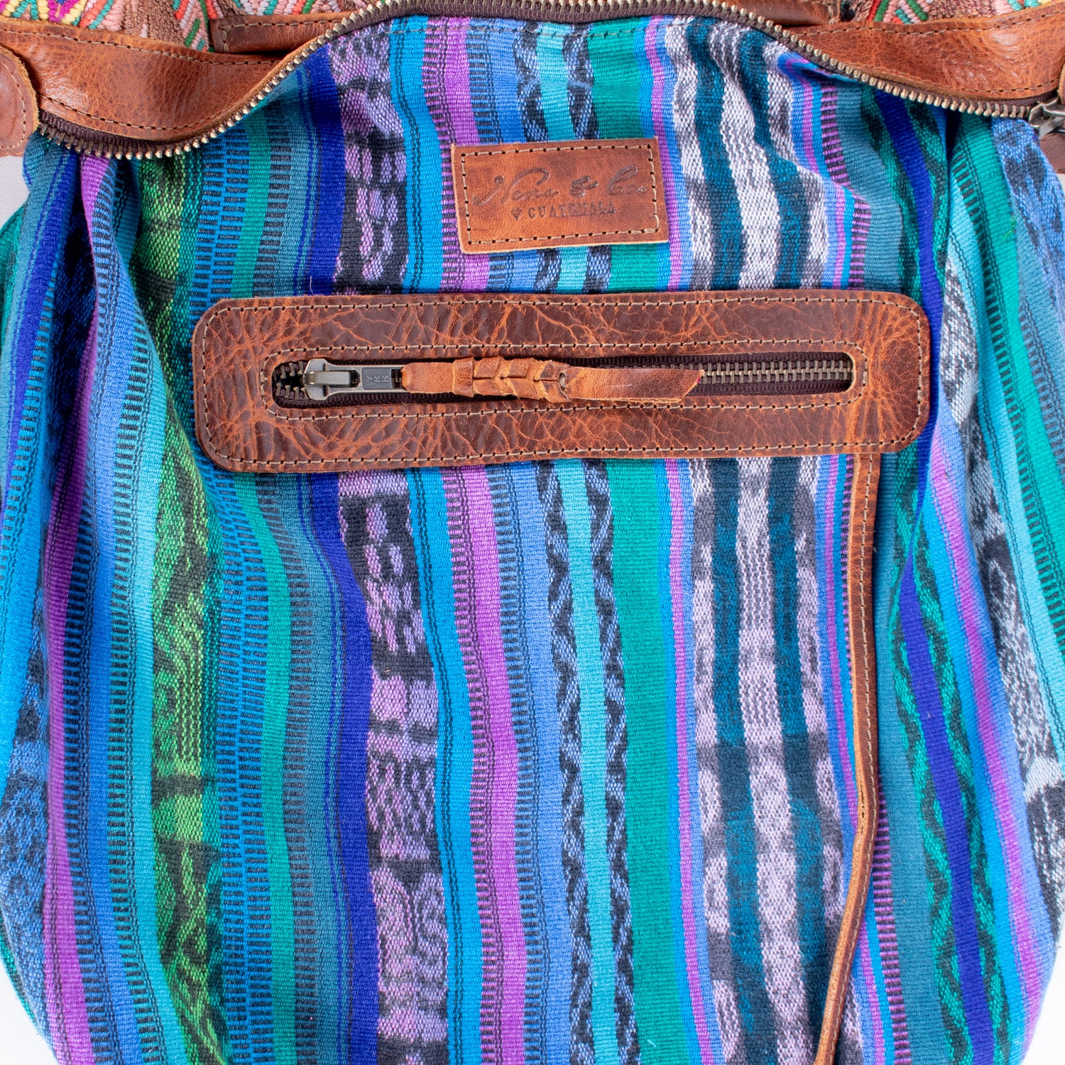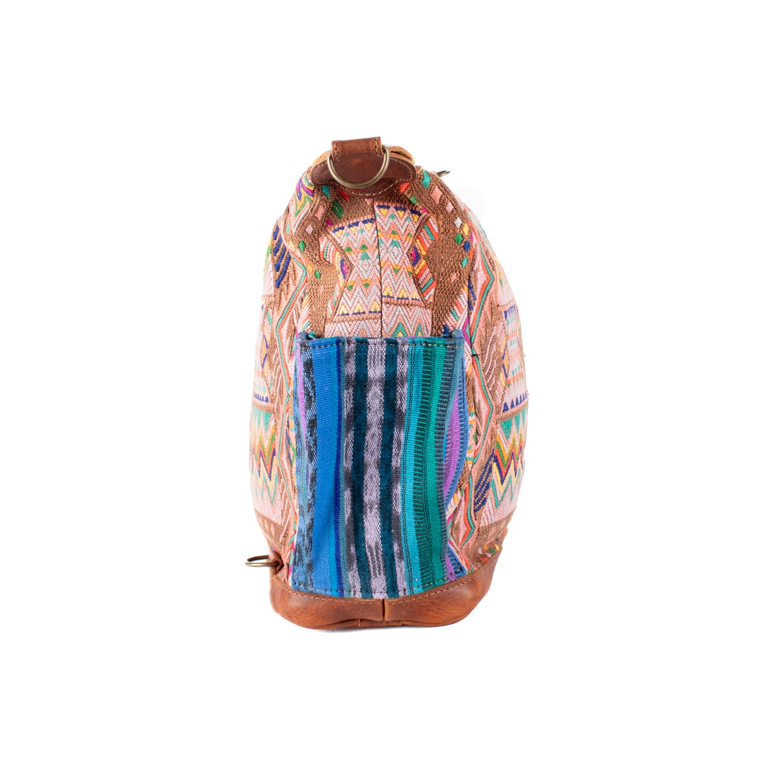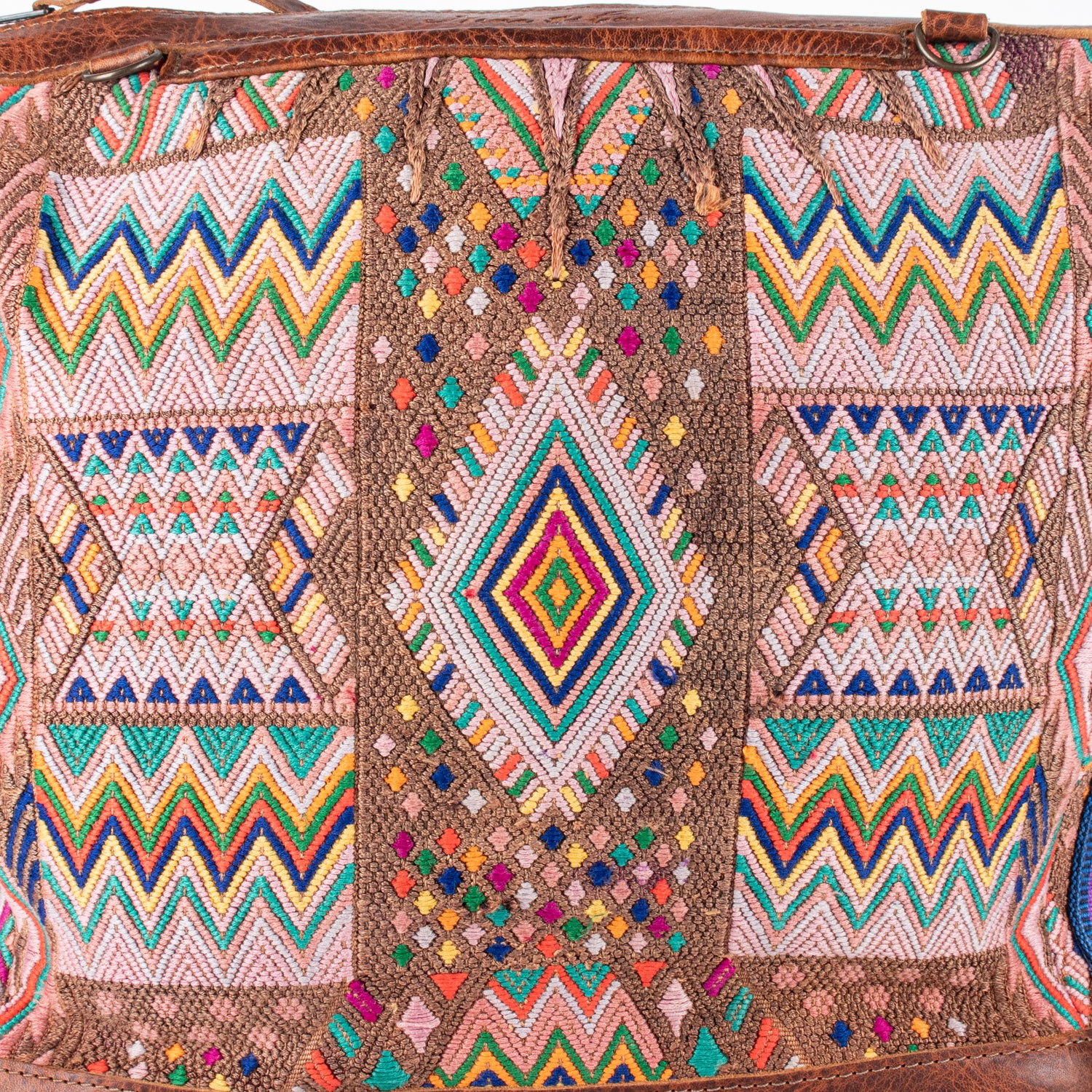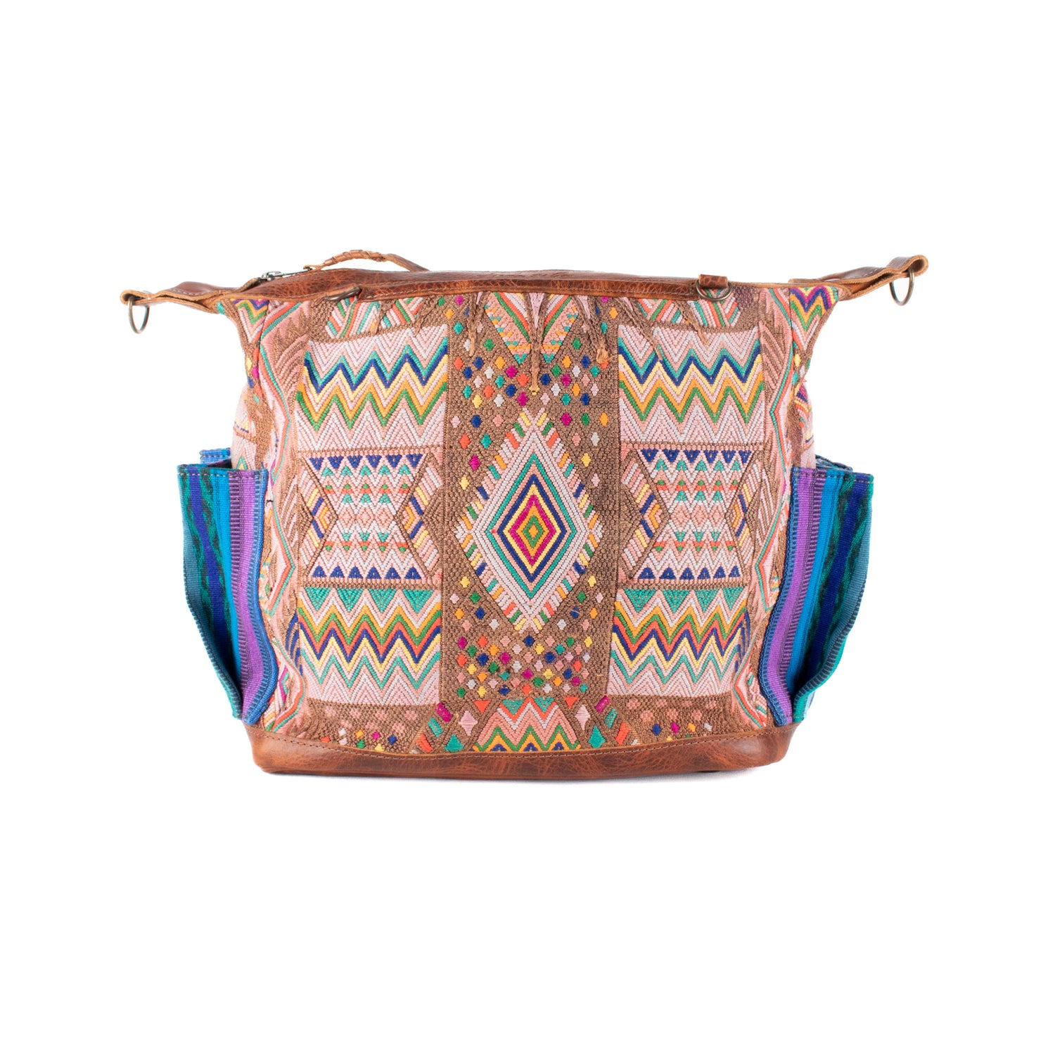 Many unique Maya symbols can be found in our One of a Kind Collection. The fabric we use for this collection is made from upcycled vintage huipiles (traditional attire worn by women in Guatemala) that were handwoven by Artisans up to 10 years ago, and they have lived a full life before being incorporated into your leather bag!
