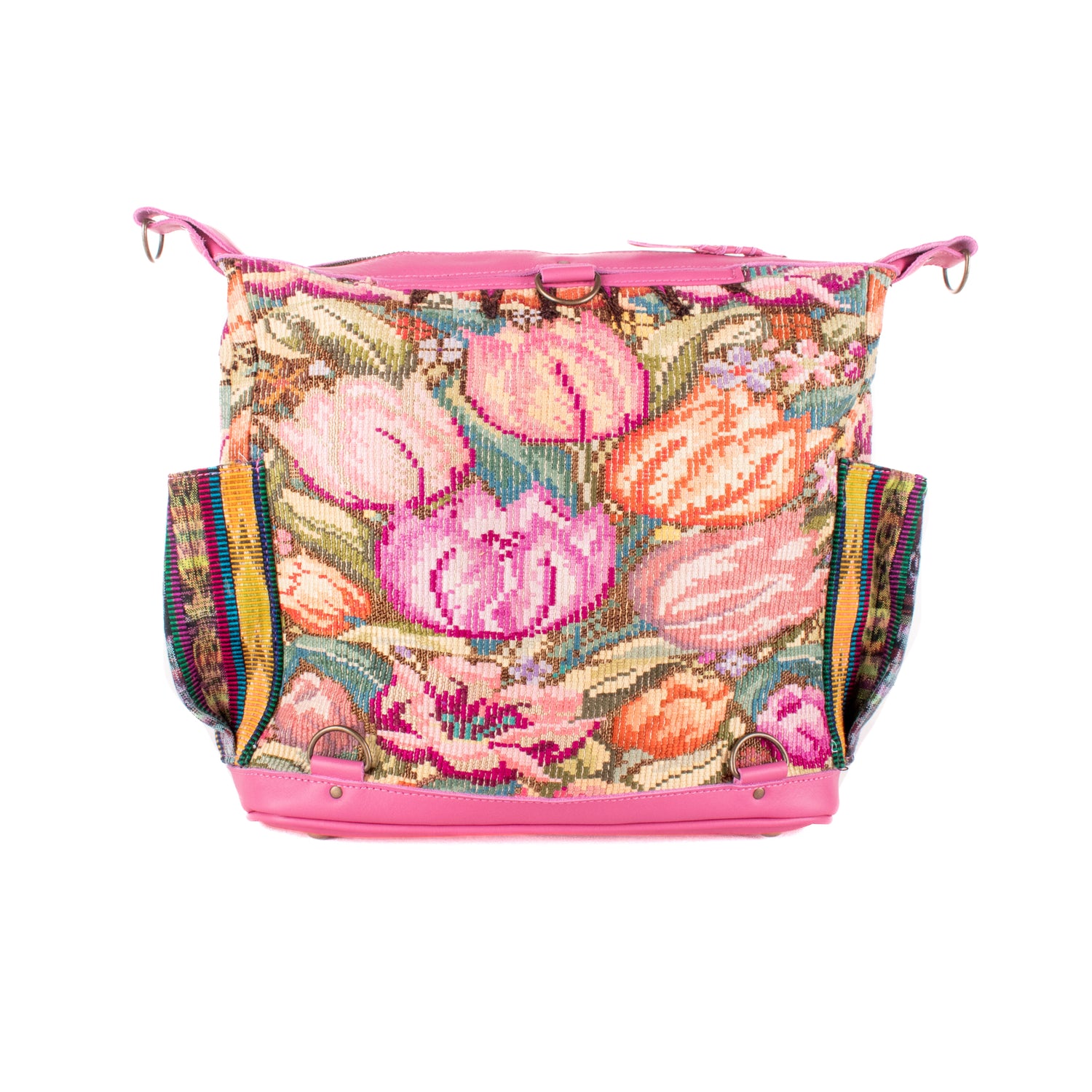 Many unique Maya symbols can be found in our One of a Kind Collection. The fabric we use for this collection is made from upcycled vintage huipiles (traditional attire worn by women in Guatemala) that were handwoven by Artisans up to 10 years ago, and they have lived a full life before being incorporated into your leather bag!