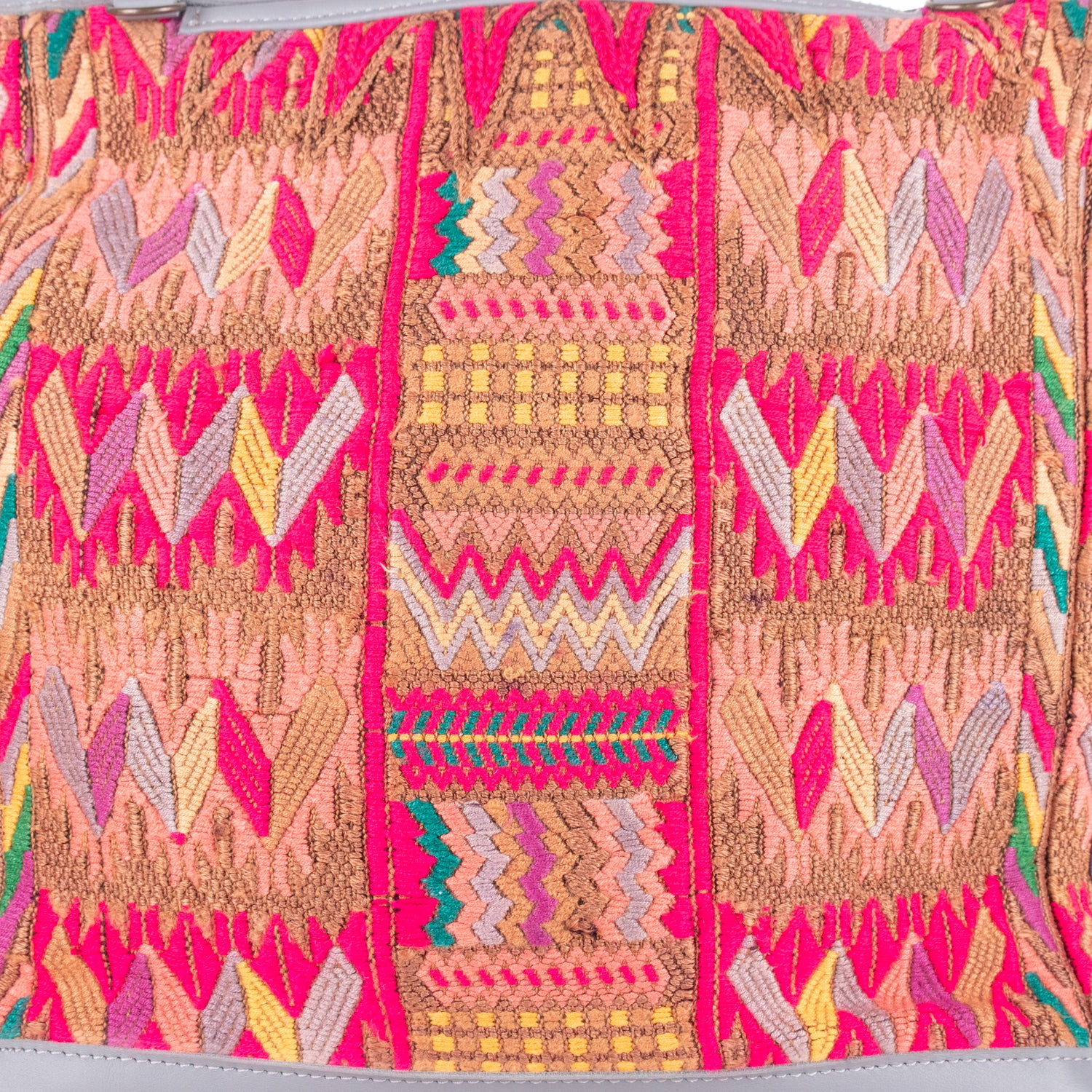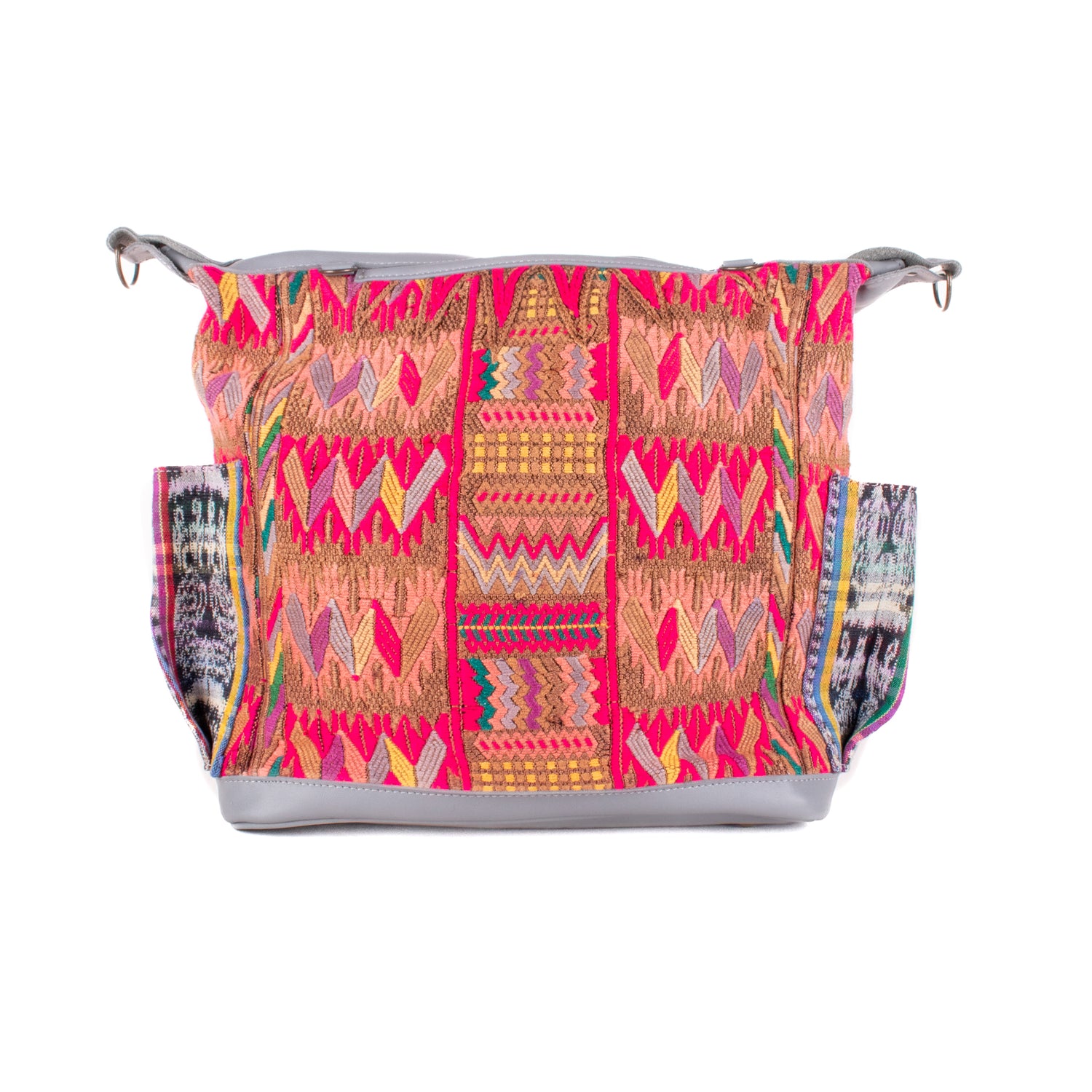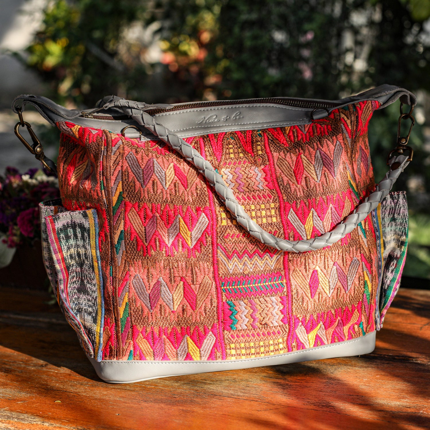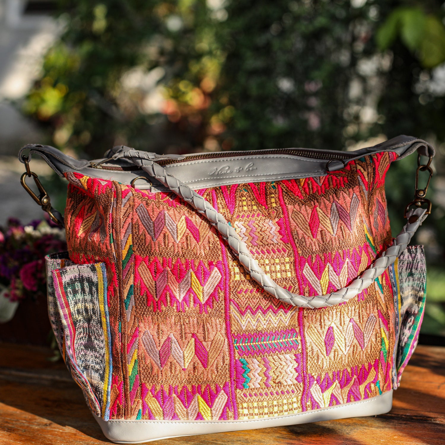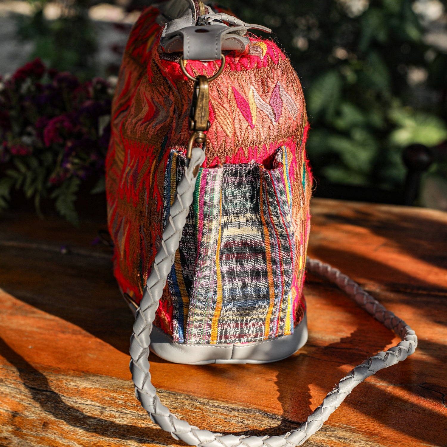 Many unique Maya symbols can be found in our One of a Kind Collection. The fabric we use for this collection is made from upcycled vintage huipiles (traditional attire worn by women in Guatemala) that were handwoven by Artisans up to 10 years ago, and they have lived a full life before being incorporated into your leather bag!