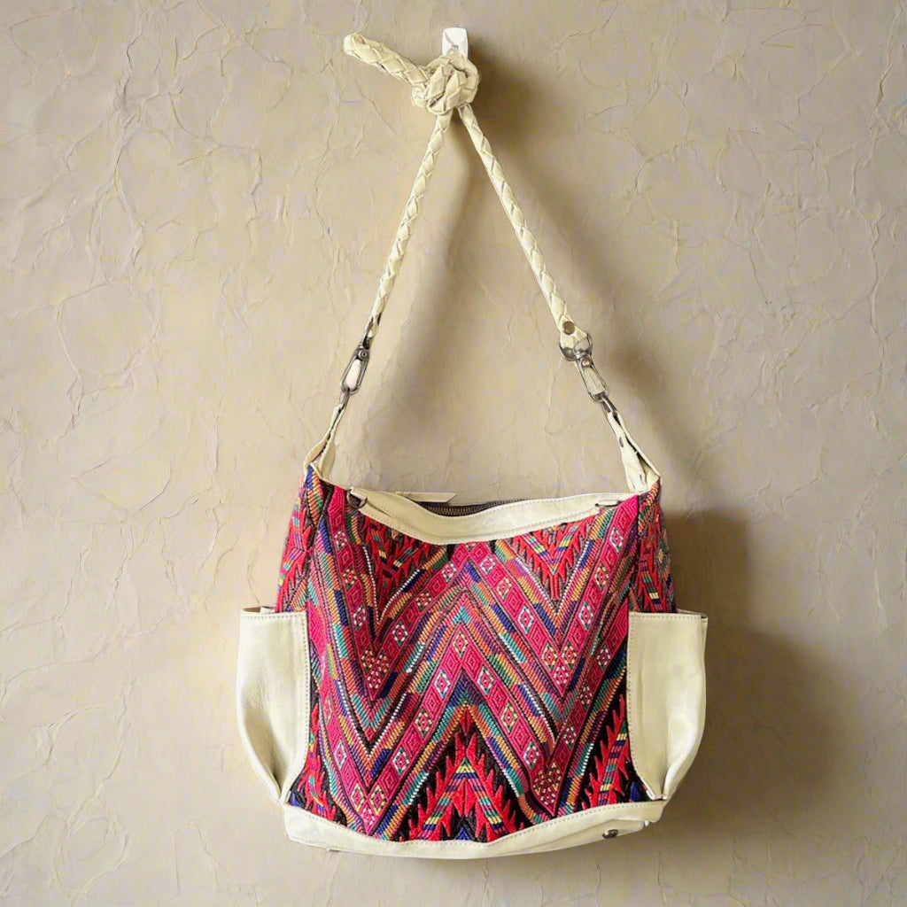 Many unique Maya symbols can be found in our One of a Kind Collection. The fabric we use for this collection is made from upcycled vintage huipiles (traditional attire worn by women in Guatemala) that were handwoven by Artisans up to 10 years ago, and they have lived a full life before being incorporated into your leather bag!
