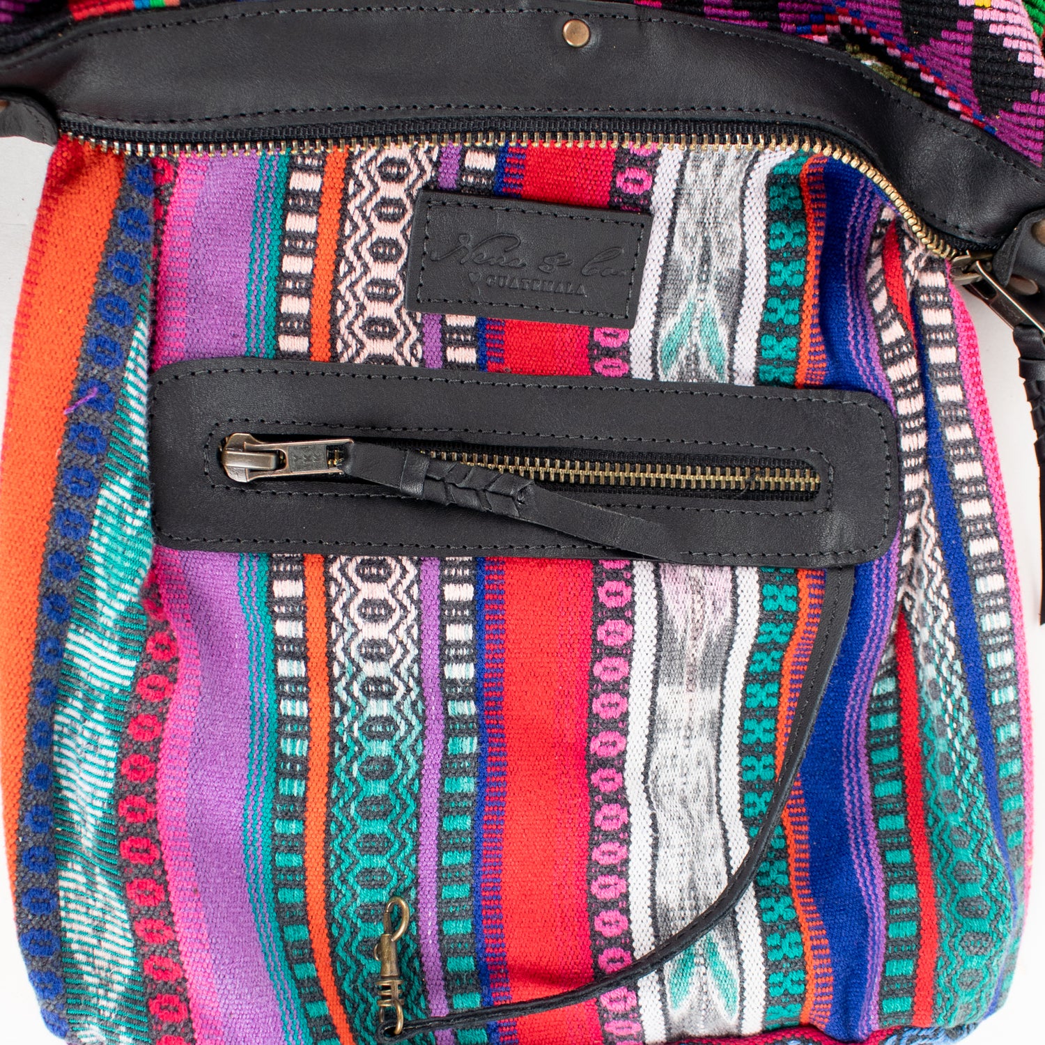 Many unique Maya symbols can be found in our One of a Kind Collection. The fabric we use for this collection is made from upcycled vintage huipiles (traditional attire worn by women in Guatemala) that were handwoven by Artisans up to 10 years ago, and they have lived a full life before being incorporated into your leather bag!