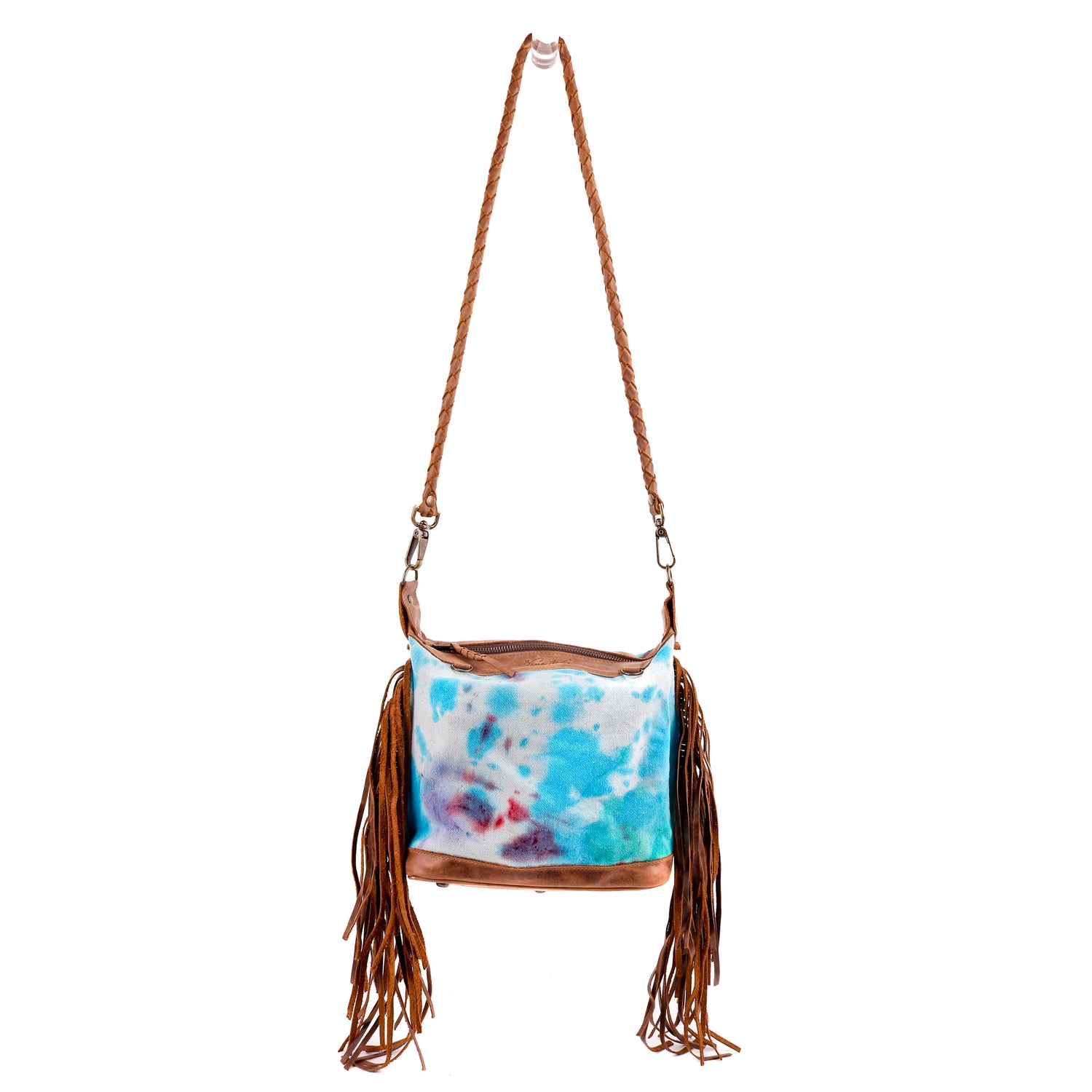 **closeout** beatriz mini convertible day bag with fringe - upcycled denim - tie dye - caoba - no. 10003