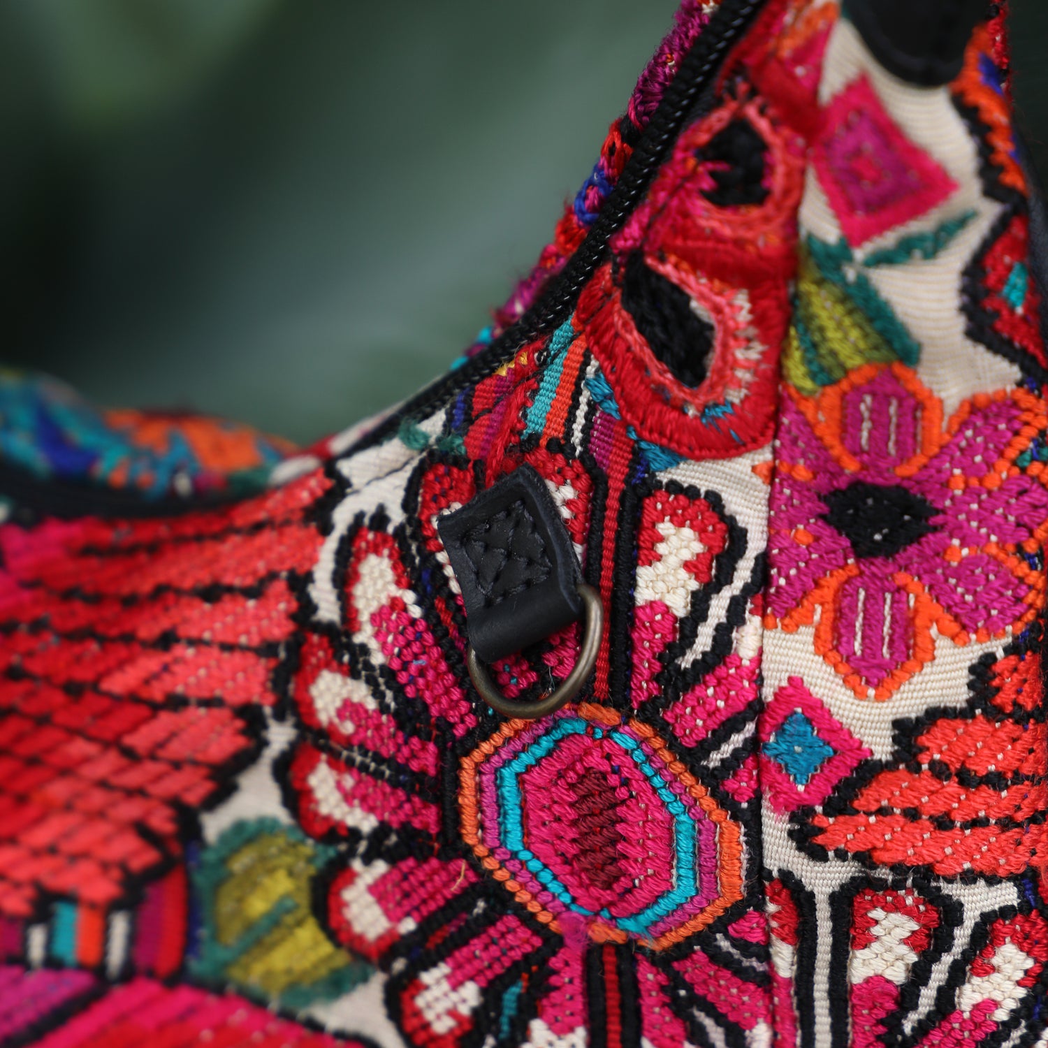 Many unique Maya symbols can be found in our One of a Kind Collection. The fabric we use for this collection is made from upcycled vintage huipiles (traditional attire worn by women in Guatemala) that were handwoven by Artisans up to 10 years ago, and they have lived a full life before being incorporated into your leather bag!