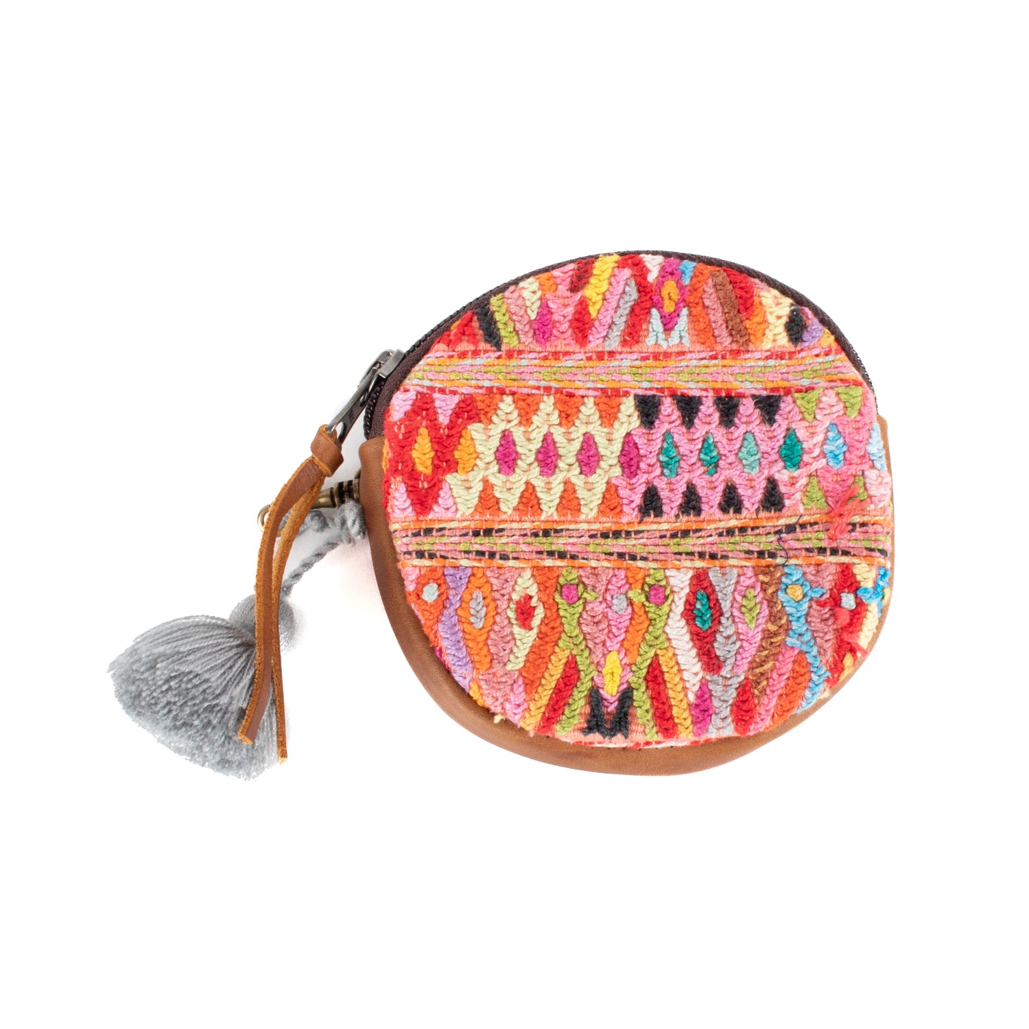 Circle coin purse - ooak huipil - cafe- no. 17516