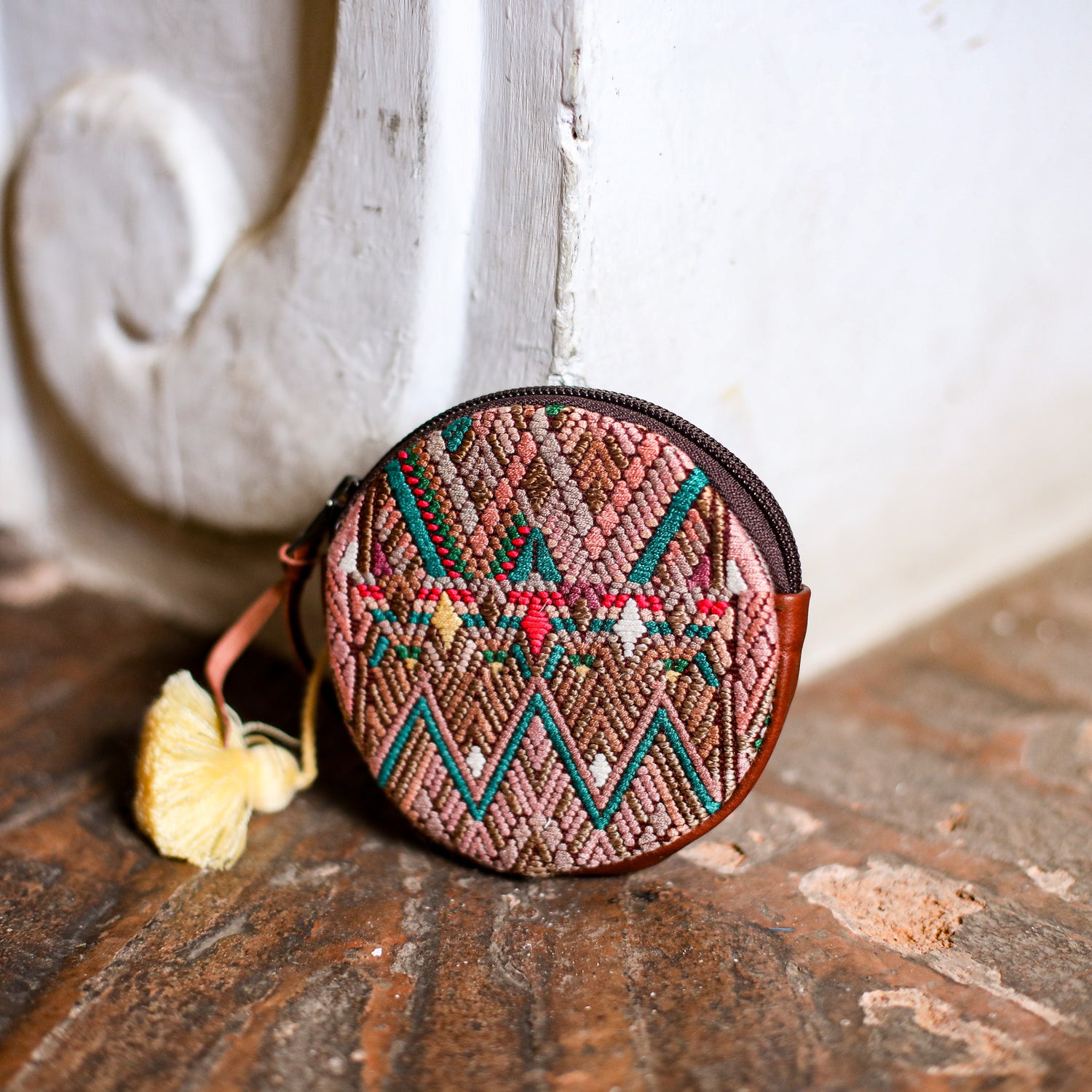 Circle coin purse - ooak huipil - copper - no. 19064