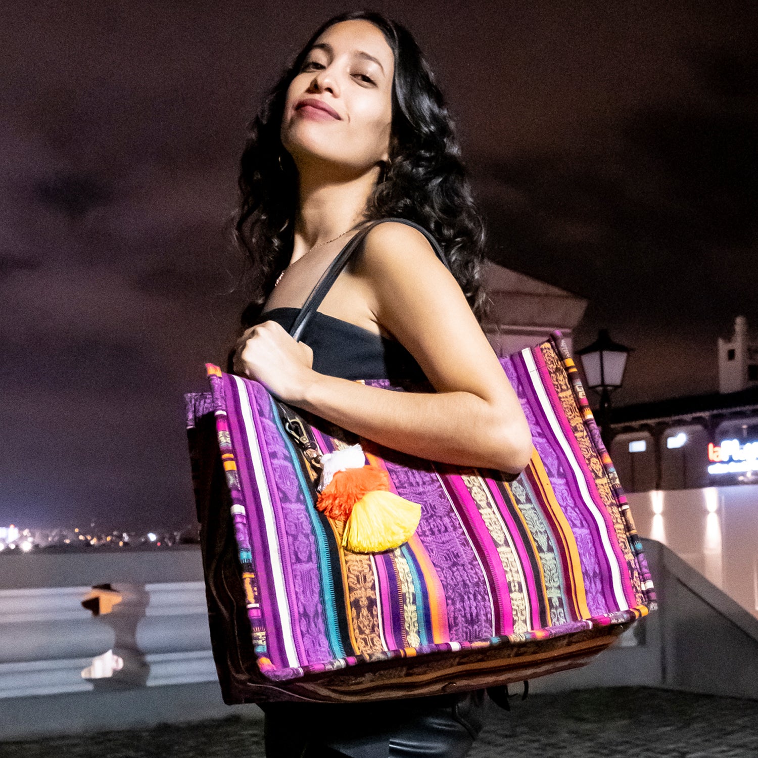 In Maya tradition, the Moon goddess Ixchel is the goddess of Womanhood. The Moon represents many aspects of womanhood, including the cycles of life, fertility, healing, and the textile arts. Appearing on a bag, the Moon means something different to every wearer, because no two women experience Womanhood the same way.