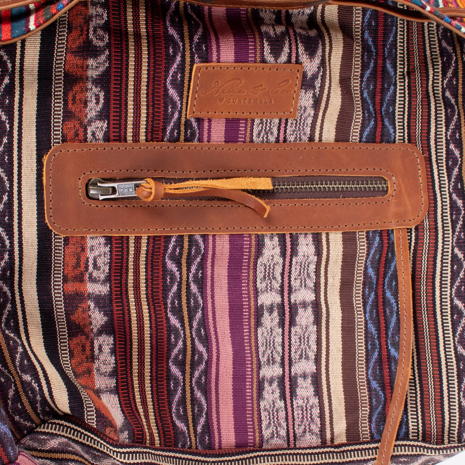 Many unique Maya symbols can be found in our One of a Kind Collection. The fabric we use for this collection is made from upcycled vintage huipiles (traditional attire worn by women in Guatemala) that were handwoven by Artisans up to 10 years ago, and they have lived a full life before being incorporated into your leather bag!