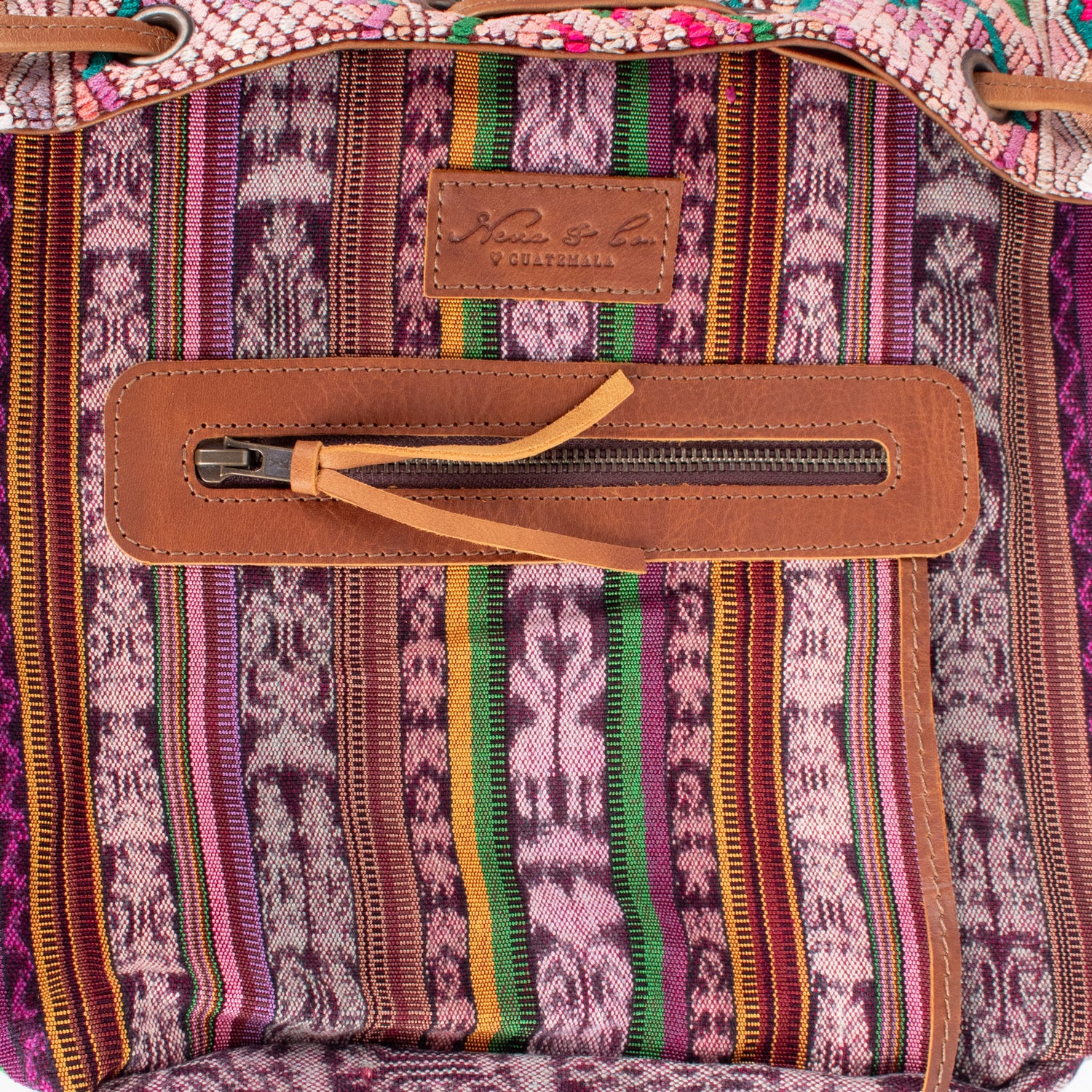 Many unique Maya symbols can be found in our One of a Kind Collection. The fabric we use for this collection is made from upcycled vintage huipiles (traditional attire worn by women in Guatemala) that were handwoven by Artisans up to 10 years ago, and they have lived a full life before being incorporated into your leather bag!