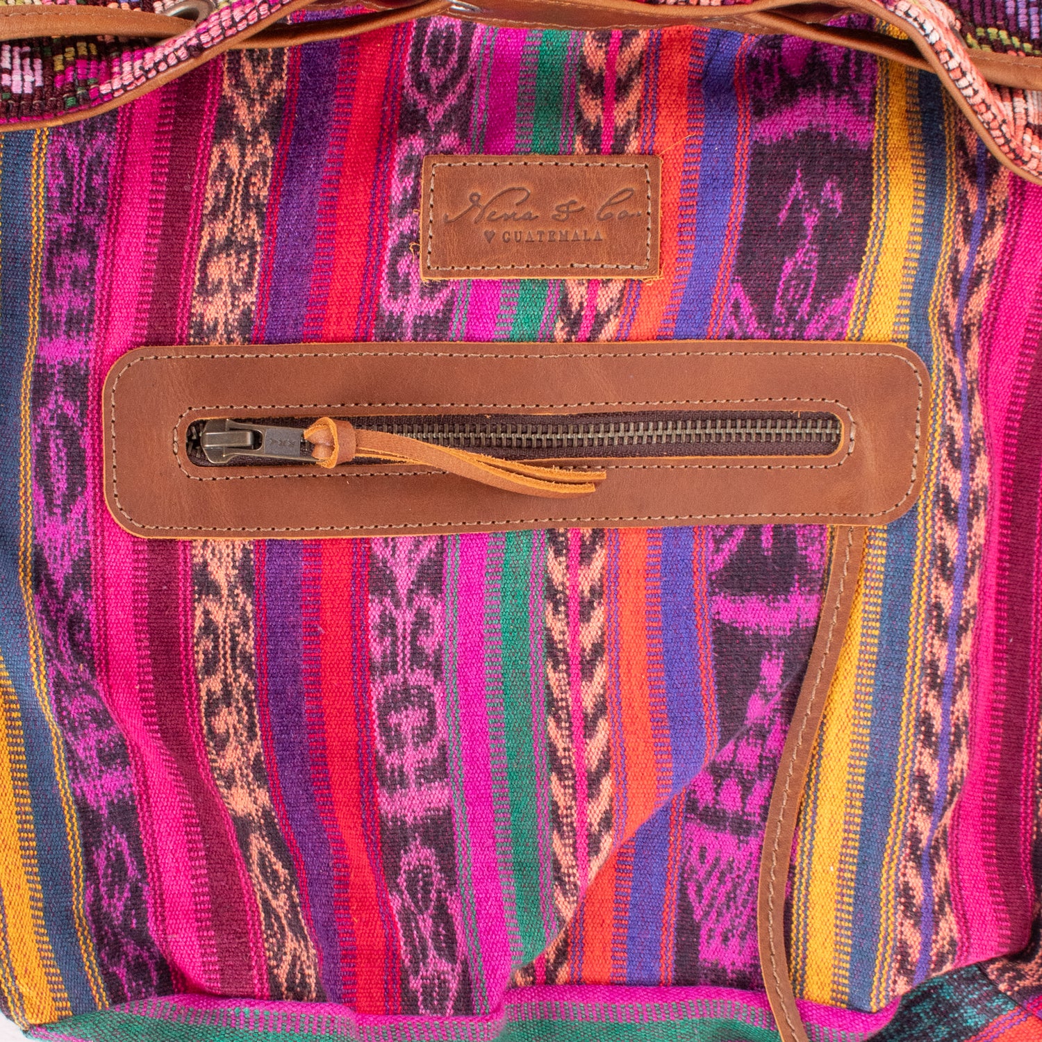 Many unique Maya symbols can be found in our One of a Kind Collection. The fabric we use for this collection is made from upcycled vintage huipiles (traditional attire worn by women in Guatemala) that were handwoven by Artisans up to 10 years ago, and they have lived a full life before being incorporated into your leather bag!
