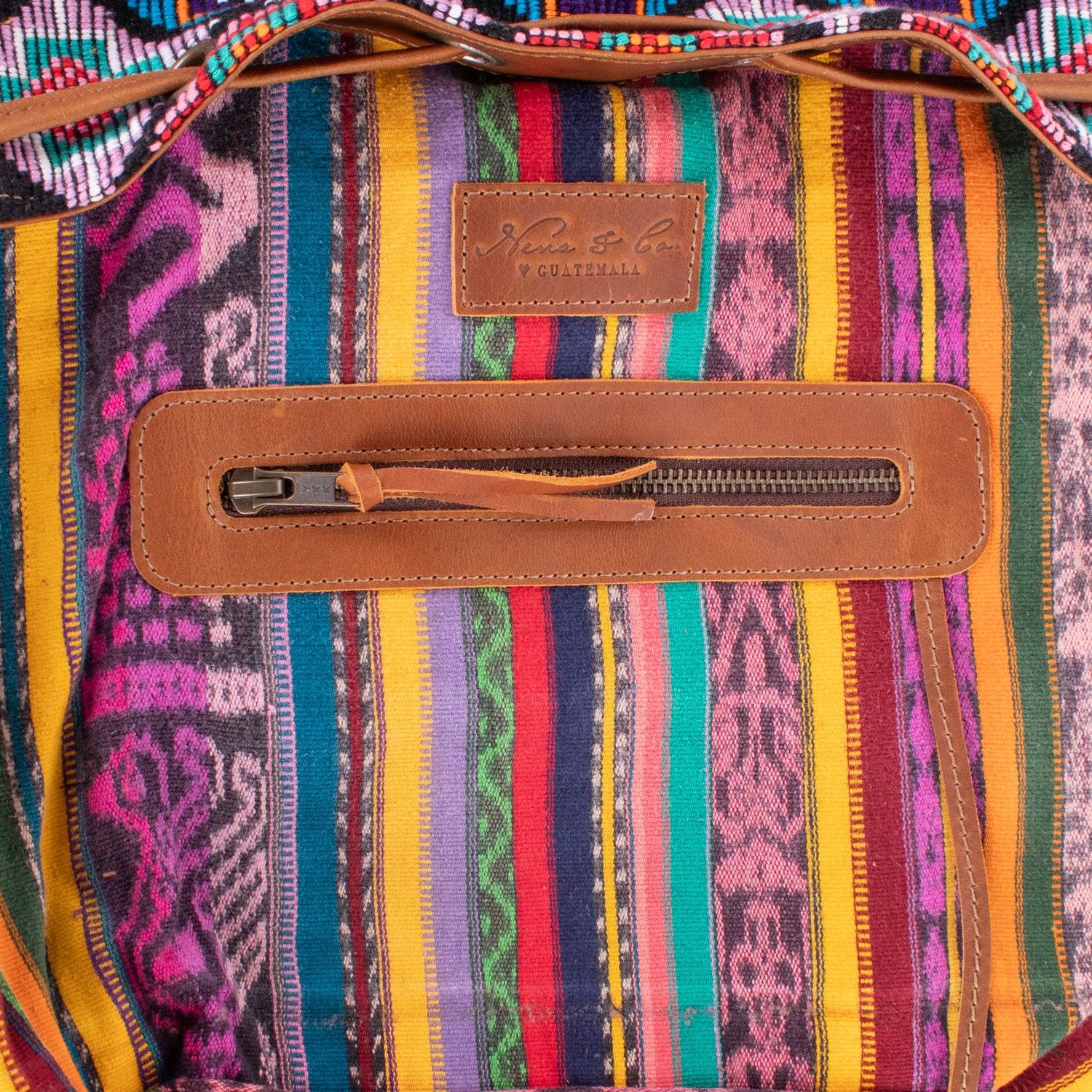 Many unique Maya symbols can be found in our One of a Kind Collection. The fabric we use for this collection is made from upcycled vintage huipiles (traditional attire worn by women in Guatemala) that were handwoven by Artisans up to 10 years ago, and they have lived a full life before being incorporated into your leather bag!