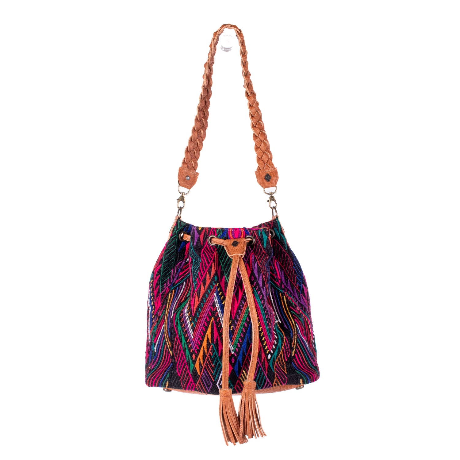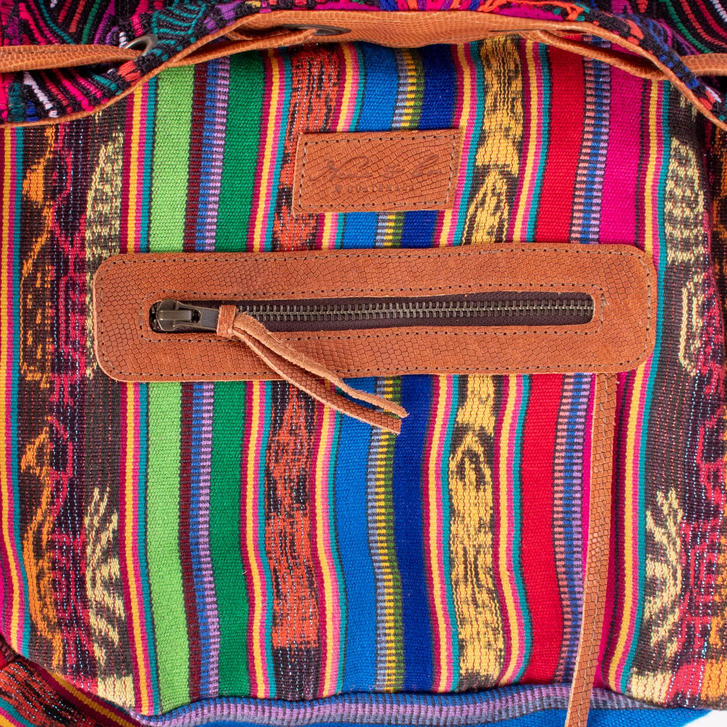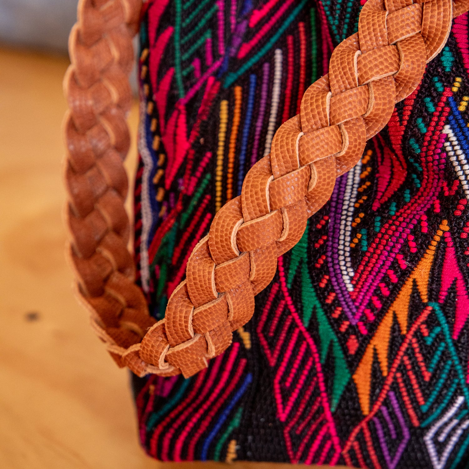 Many unique Maya symbols can be found in our One of a Kind Collection. The fabric we use for this collection is made from upcycled vintage huipiles (traditional attire worn by women in Guatemala) that were handwoven by Artisans up to 10 years ago, and they have lived a full life before being incorporated into your leather bag!