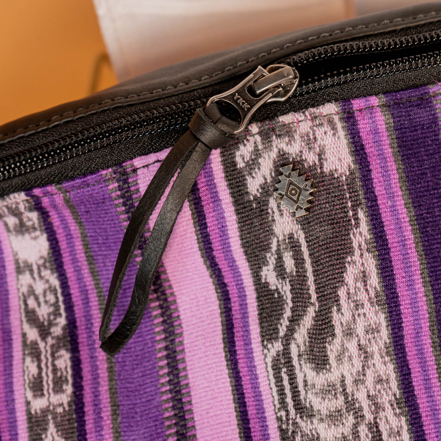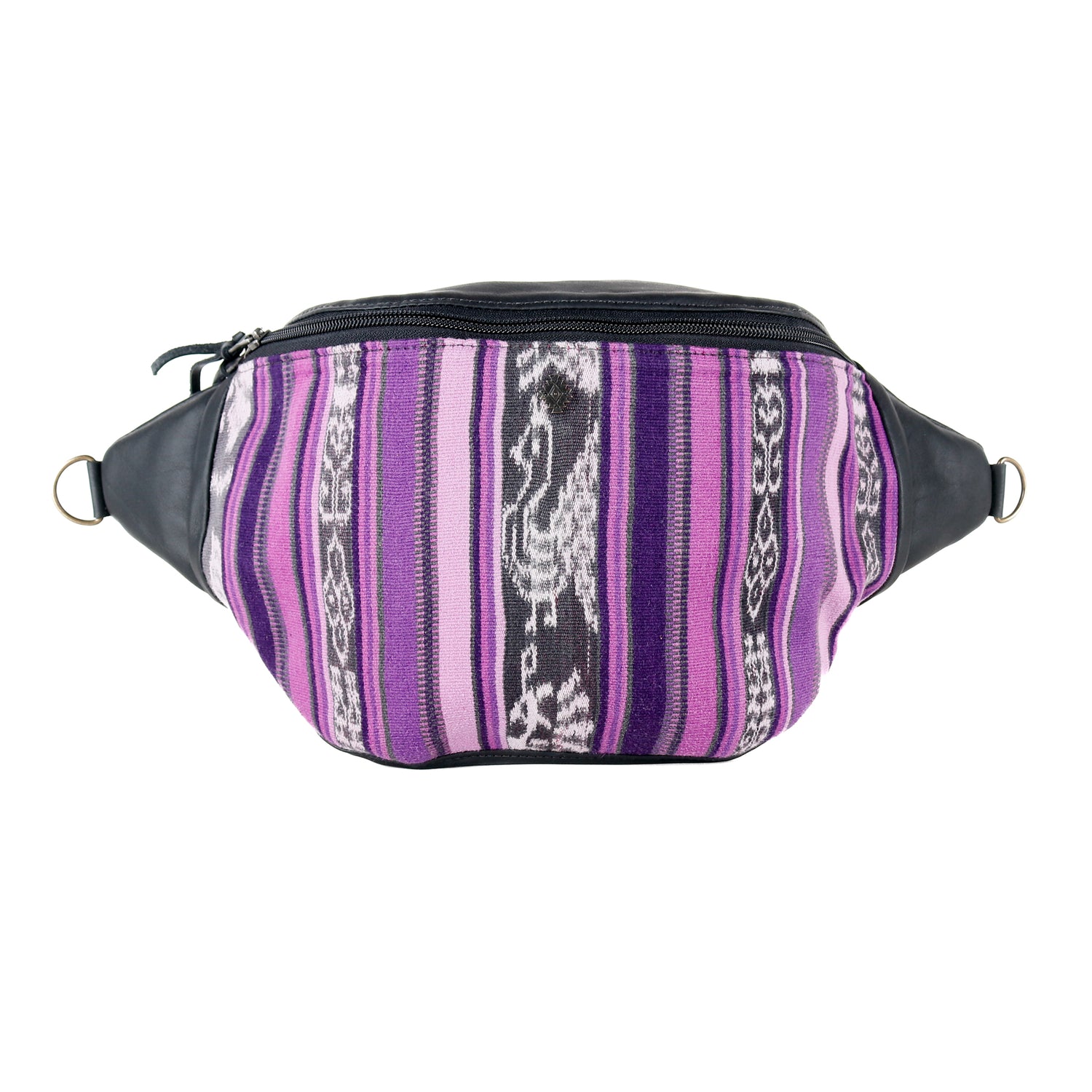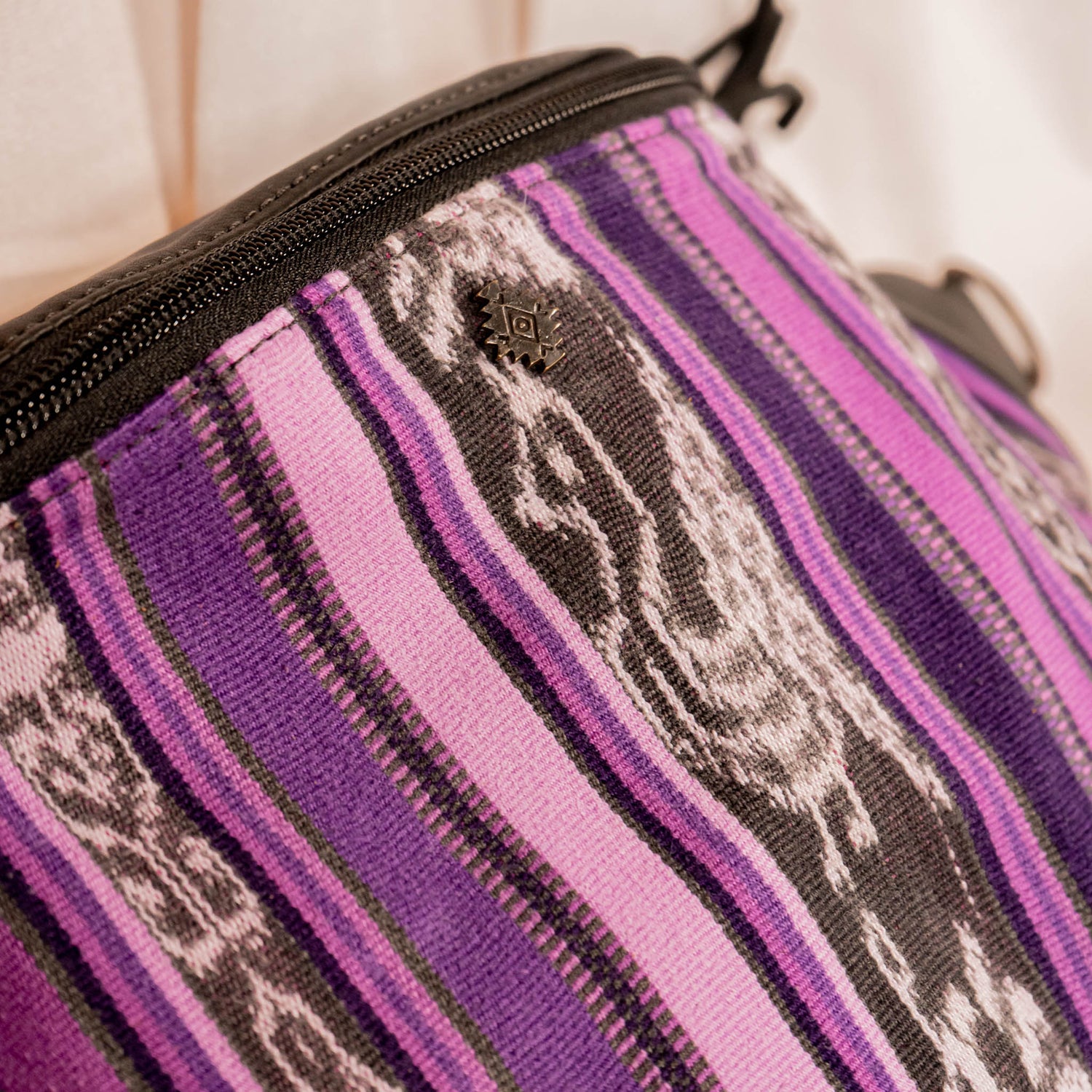 Many unique Maya symbols can be found in our One of a Kind Collection. The fabric we use for this collection is made from upcycled vintage huipiles (traditional attire worn by women in Guatemala) that were handwoven by Artisans up to 10 years ago, and they have lived a full life before being incorporated into your leather bag!