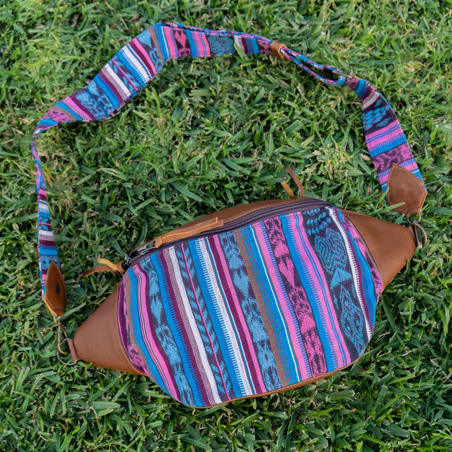 Many unique Maya symbols can be found in our One of a Kind Collection. The fabric we use for this collection is made from upcycled vintage huipiles (traditional attire worn by women in Guatemala) that were handwoven by Artisans up to 10 years ago, and they have lived a full life before being incorporated into your leather bag!