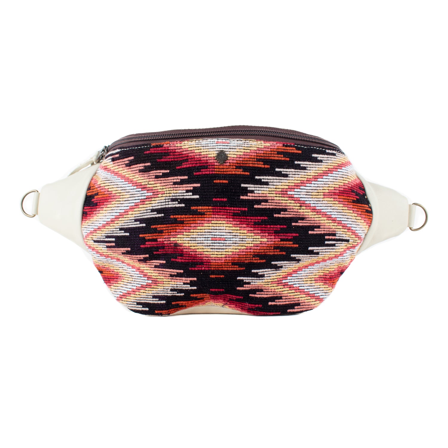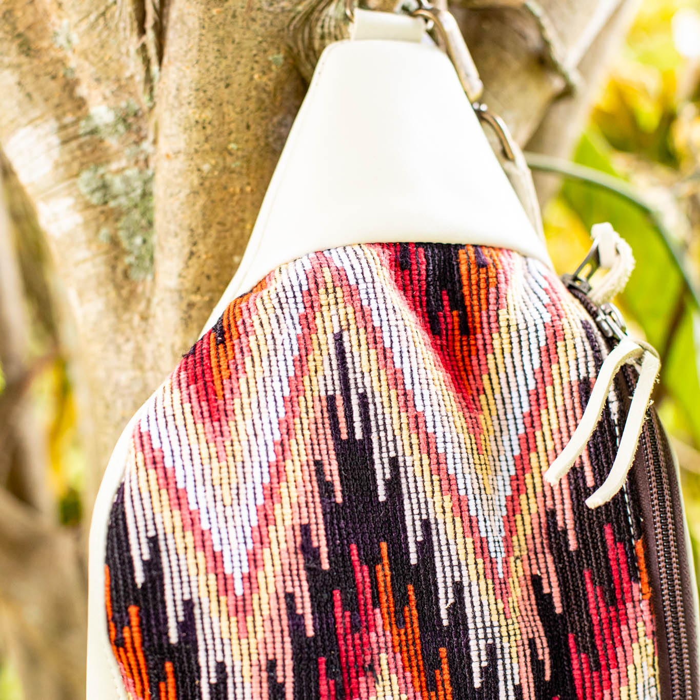 Many unique Maya symbols can be found in our One of a Kind Collection. The fabric we use for this collection is made from upcycled vintage huipiles (traditional attire worn by women in Guatemala) that were handwoven by Artisans up to 10 years ago, and they have lived a full life before being incorporated into your leather bag!