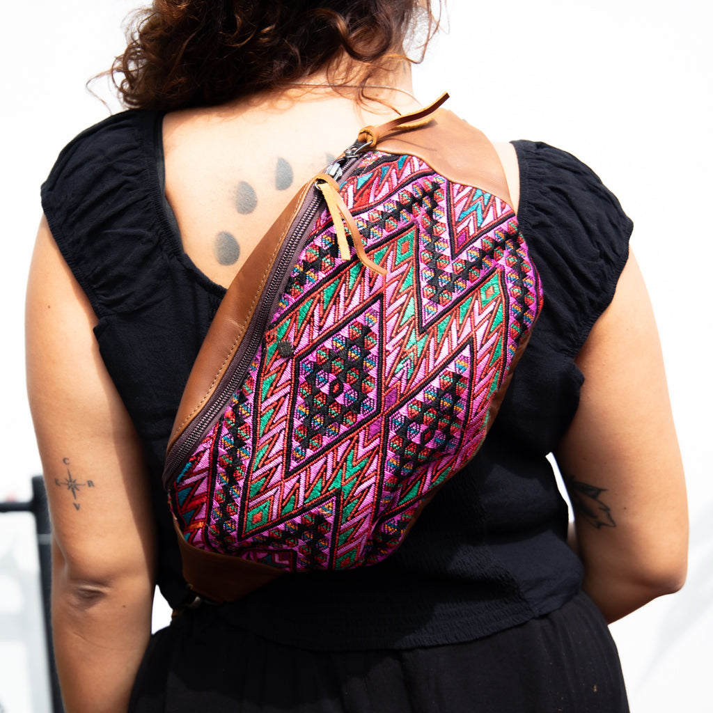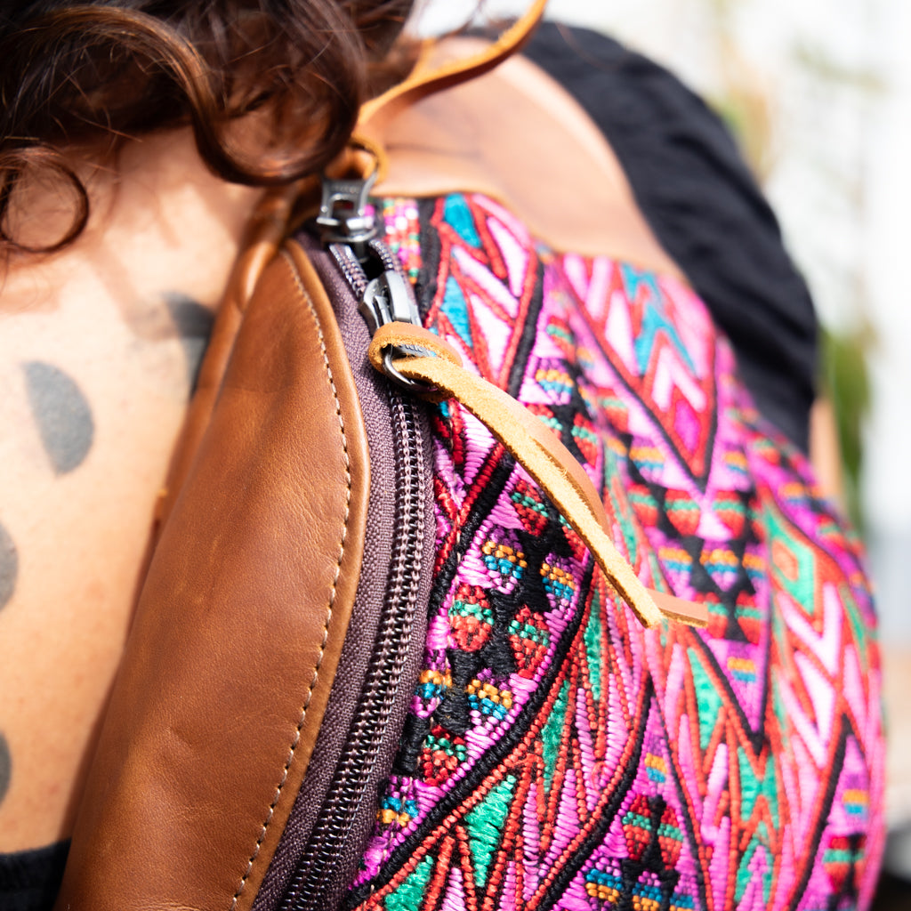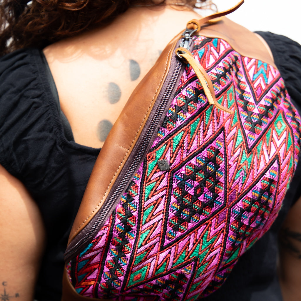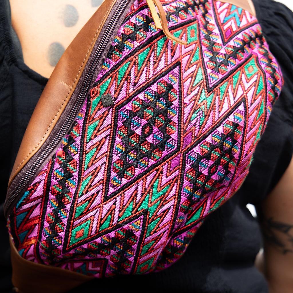 Many unique Maya symbols can be found in our One of a Kind Collection. The fabric we use for this collection is made from upcycled vintage huipiles (traditional attire worn by women in Guatemala) that were handwoven by Artisans up to 10 years ago, and they have lived a full life before being incorporated into your leather bag!
