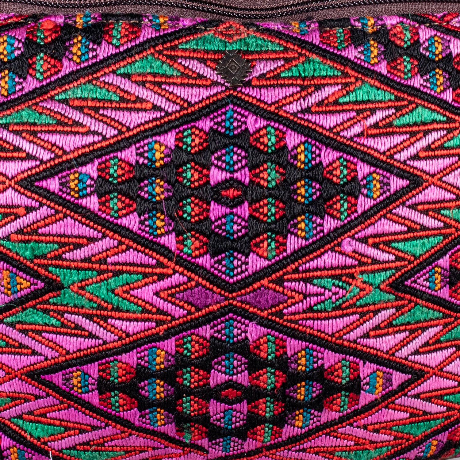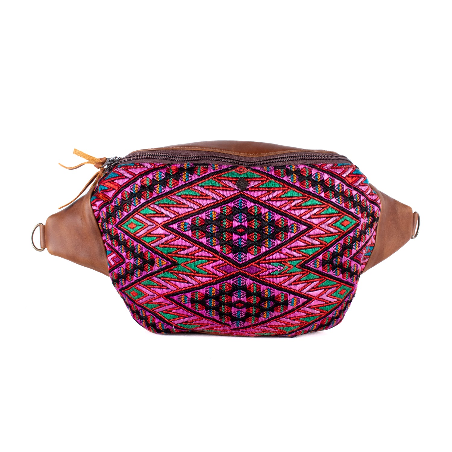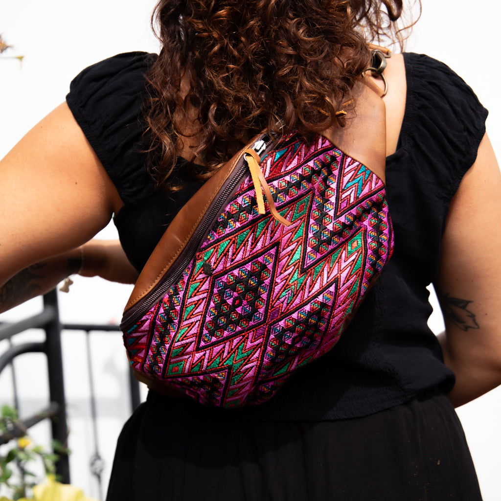 Many unique Maya symbols can be found in our One of a Kind Collection. The fabric we use for this collection is made from upcycled vintage huipiles (traditional attire worn by women in Guatemala) that were handwoven by Artisans up to 10 years ago, and they have lived a full life before being incorporated into your leather bag!