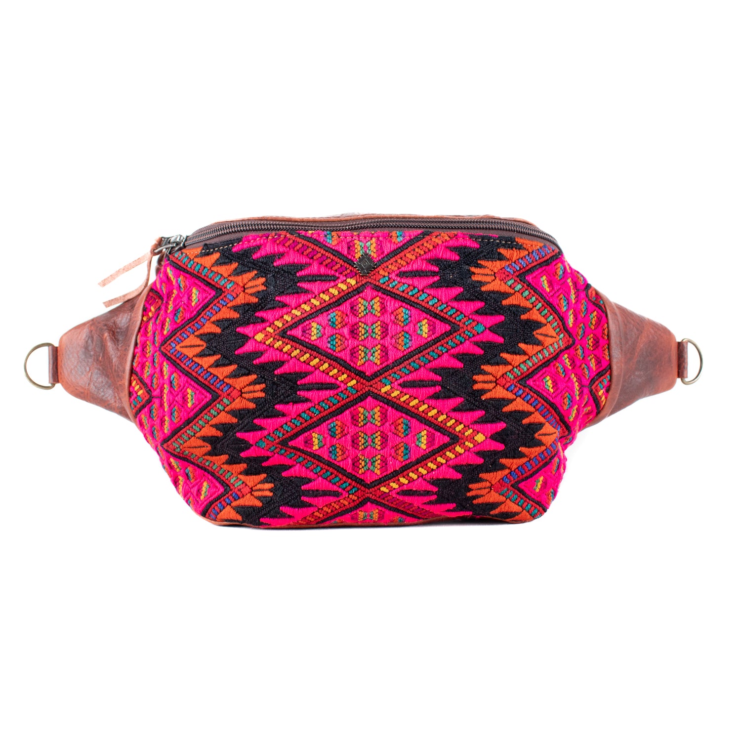 Many unique Maya symbols can be found in our One of a Kind Collection. The fabric we use for this collection is made from upcycled vintage huipiles (traditional attire worn by women in Guatemala) that were handwoven by Artisans up to 10 years ago, and they have lived a full life before being incorporated into your leather bag!