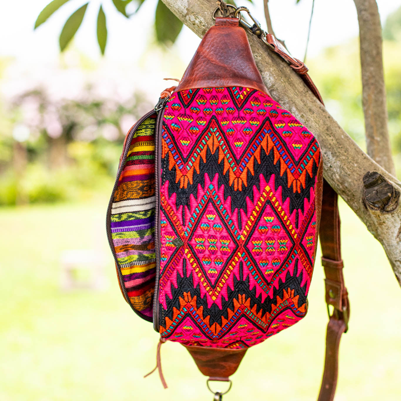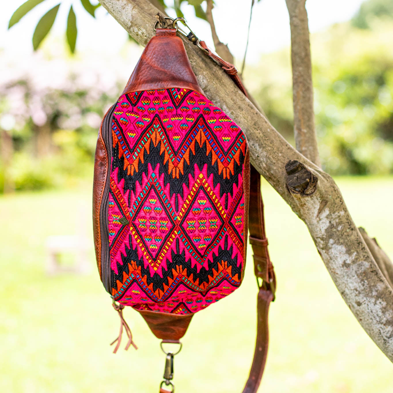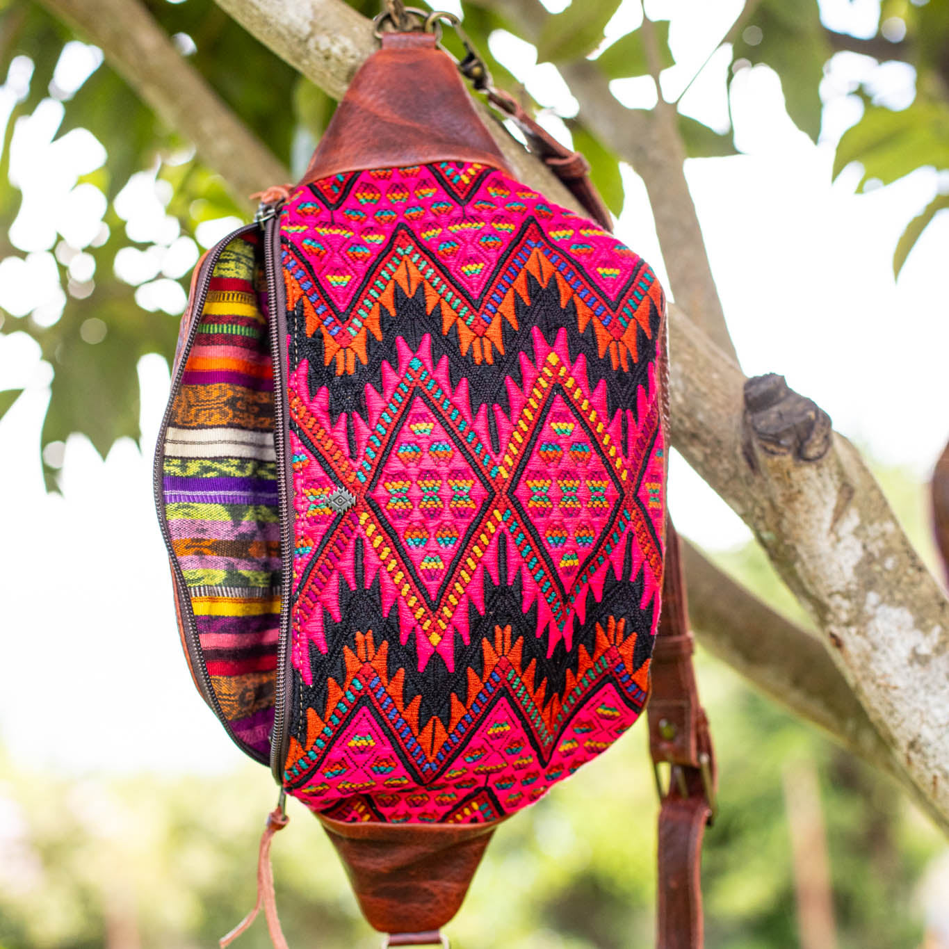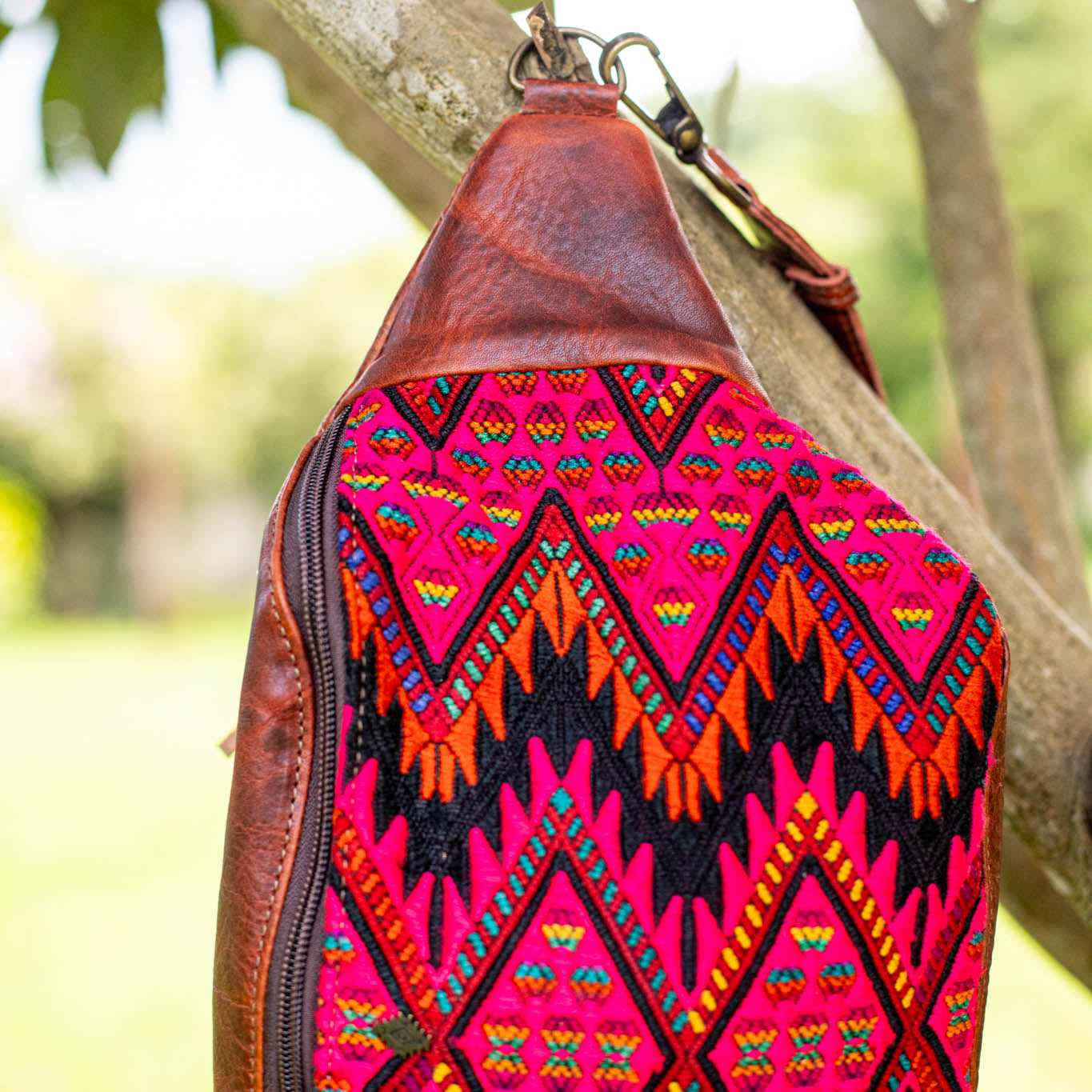 We make every effort to provide our customers with the best-handcrafted and high-quality bags. Please note that all our processes to make the bags are done by hand, from curing, cutting, and treating the leather to using up-cycled huipils. Our bags have natural characteristics and qualities that should not be considered as flaws or as damage because they do not interfere with the functionality of the bag. We up-cycle vintage Maya clothing to make beautiful one-of-a-kind products. Many times you will find snags in the pattern. This is normal. Should your patterned huipil snag you can snip the loose threads with scissors. Do not pull them.