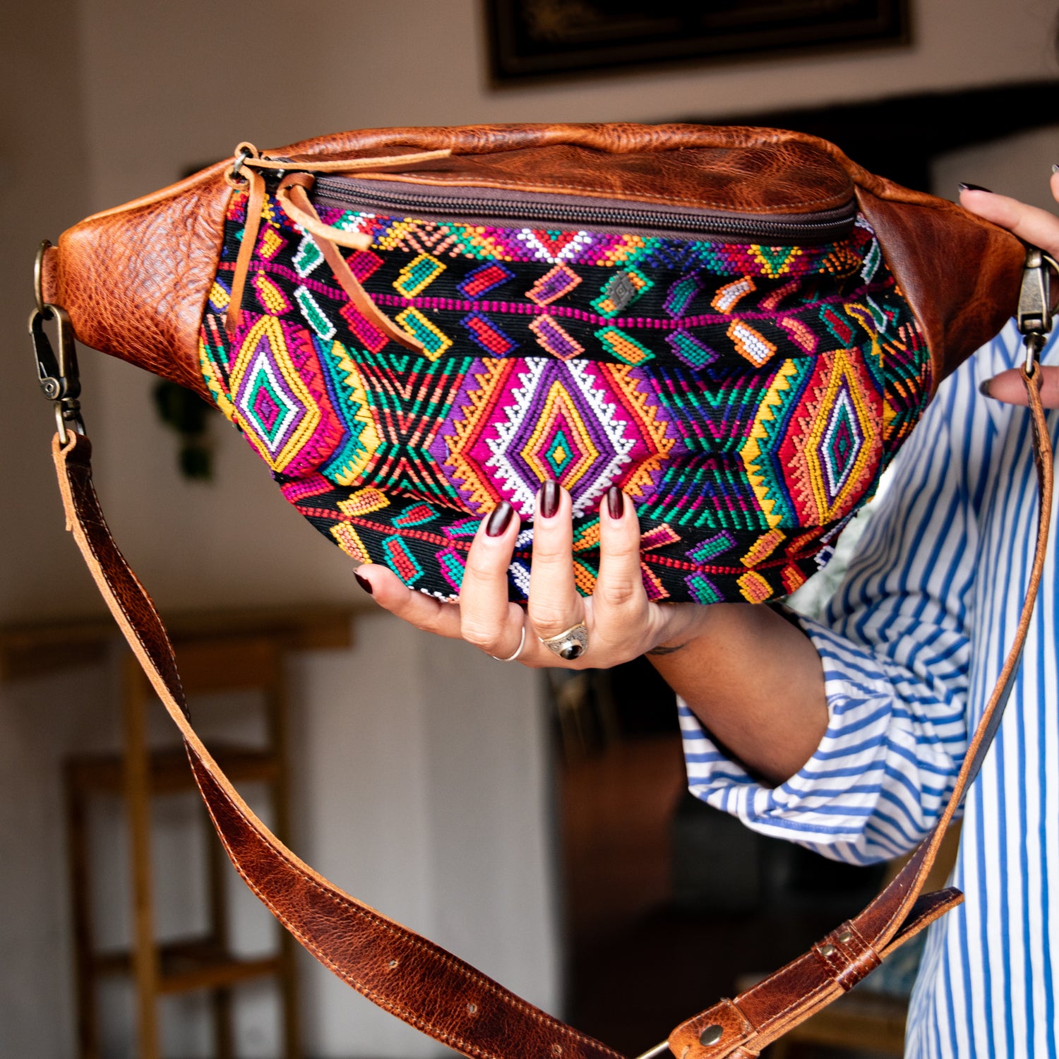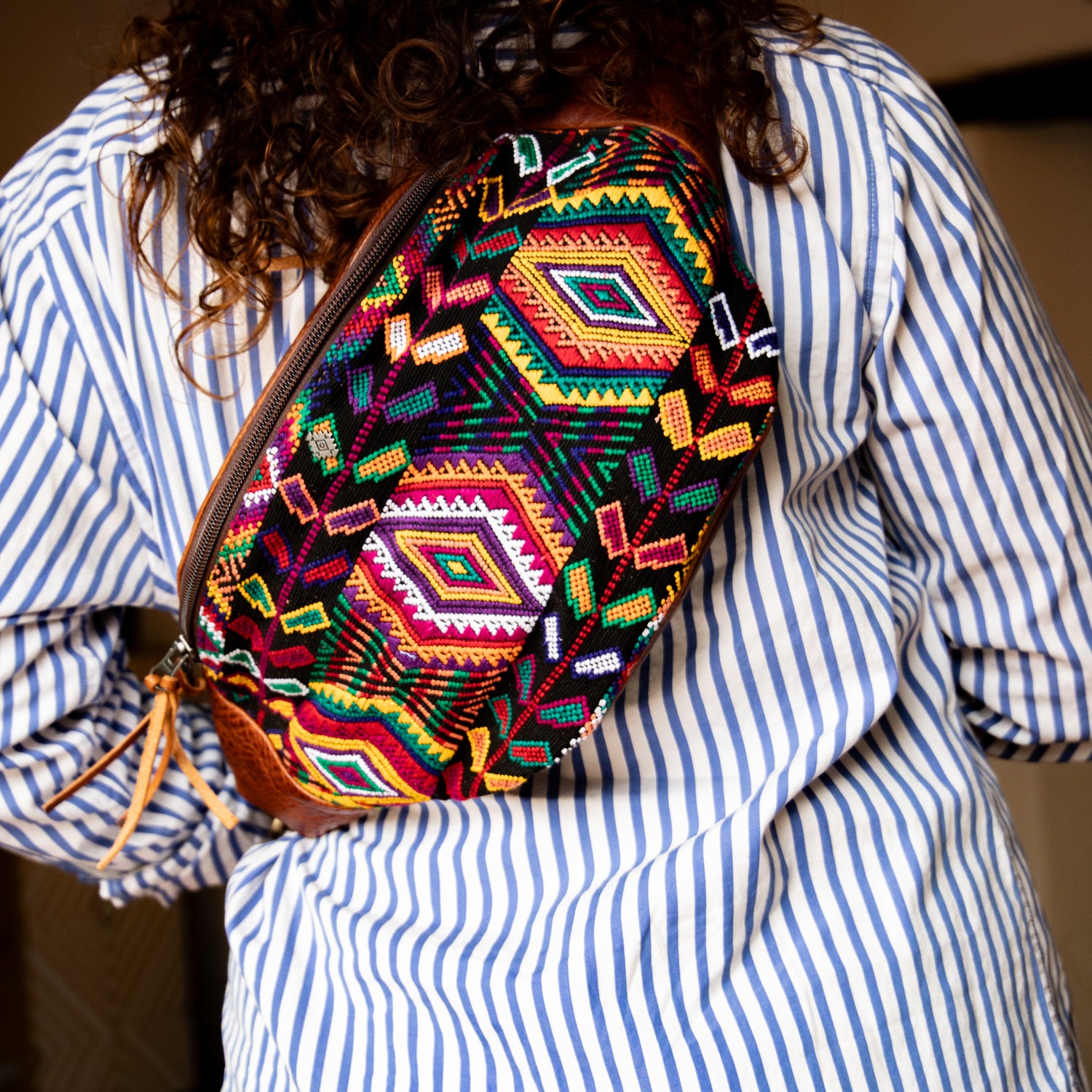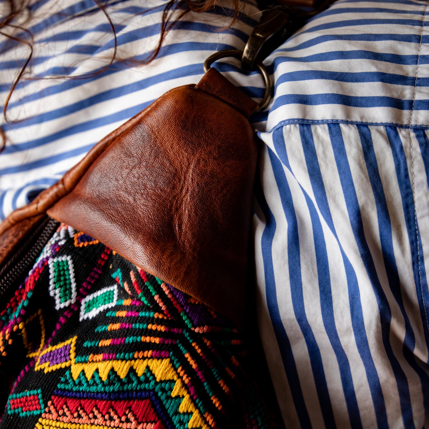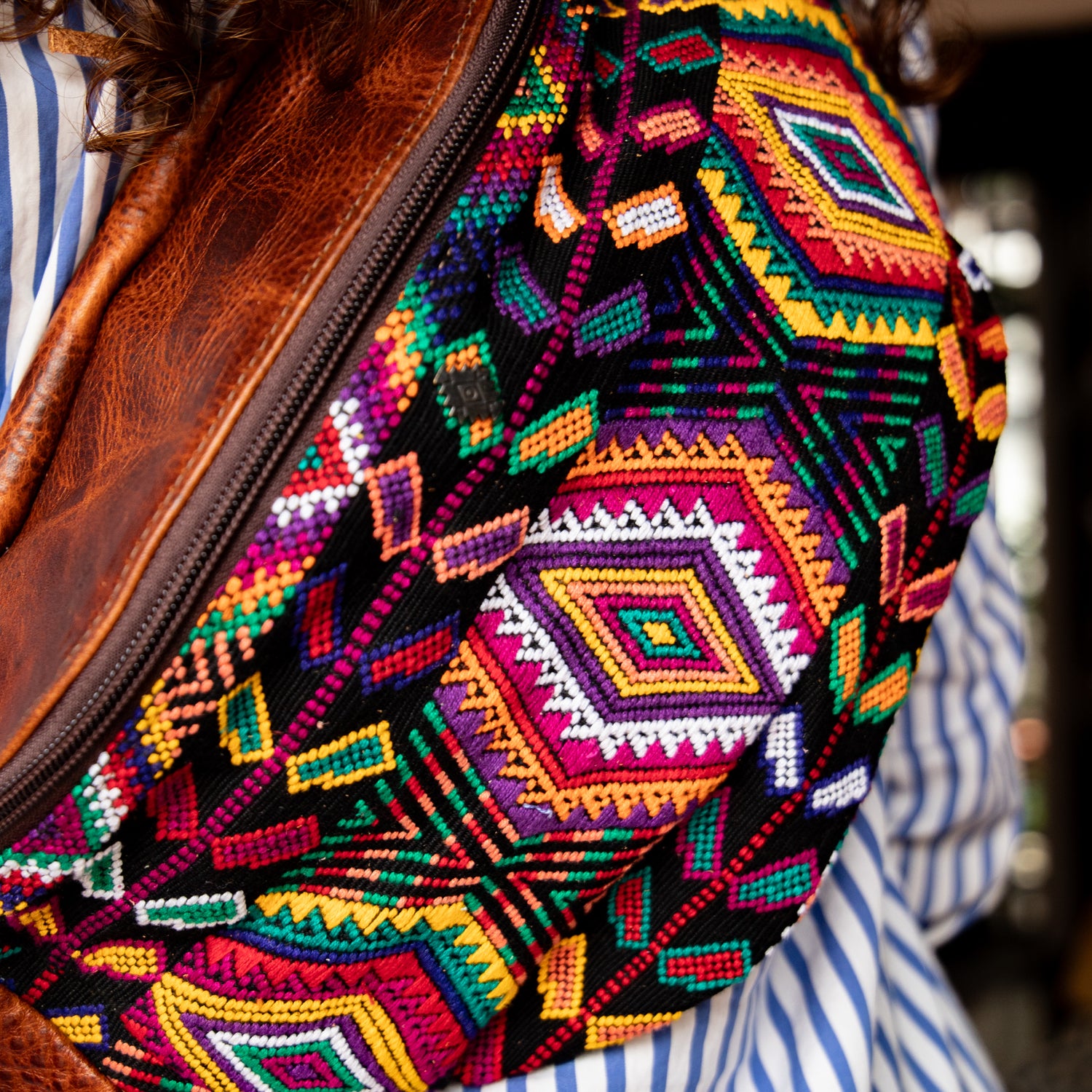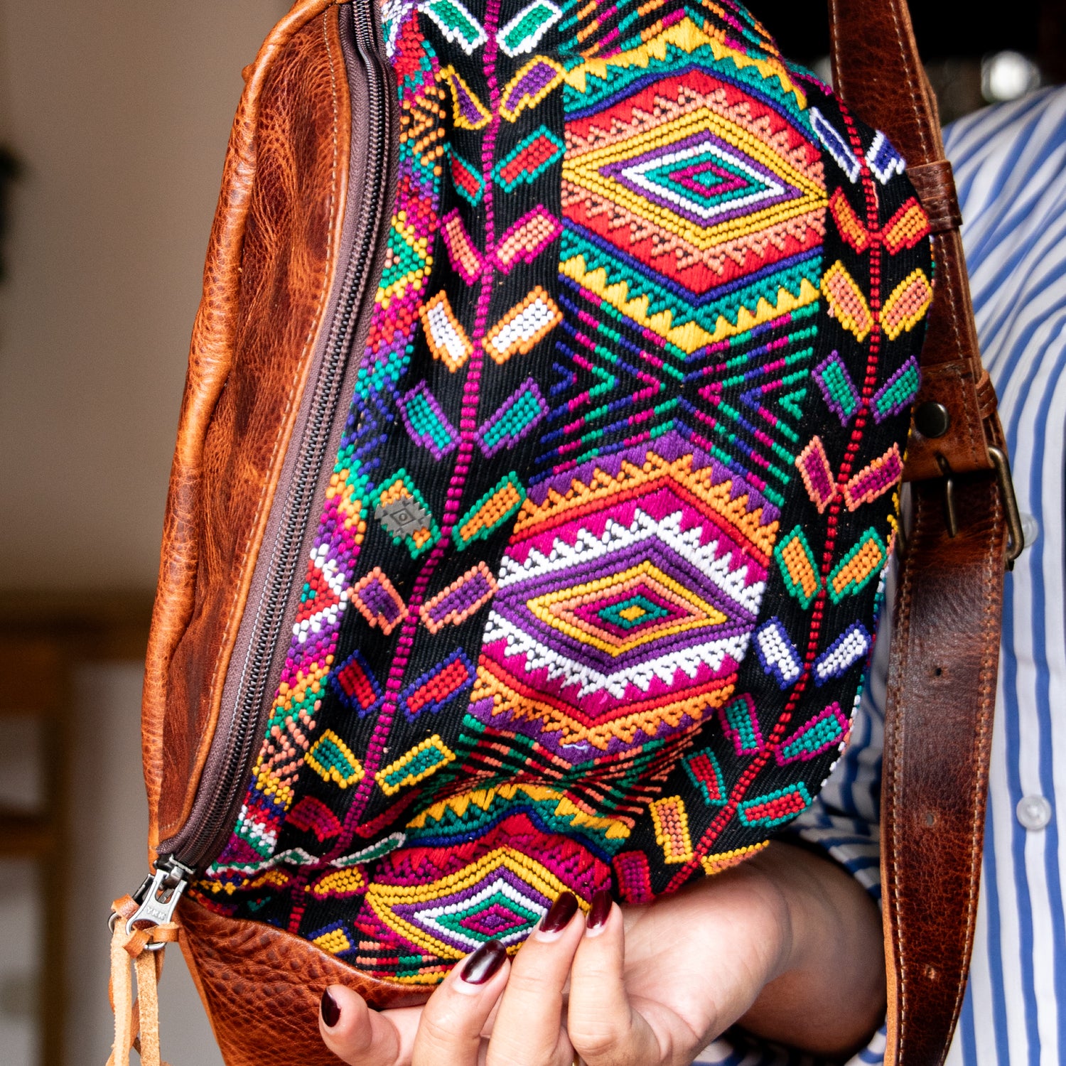 Many unique Maya symbols can be found in our One of a Kind Collection. The fabric we use for this collection is made from upcycled vintage huipiles (traditional attire worn by women in Guatemala) that were handwoven by Artisans up to 10 years ago, and they have lived a full life before being incorporated into your leather bag!
