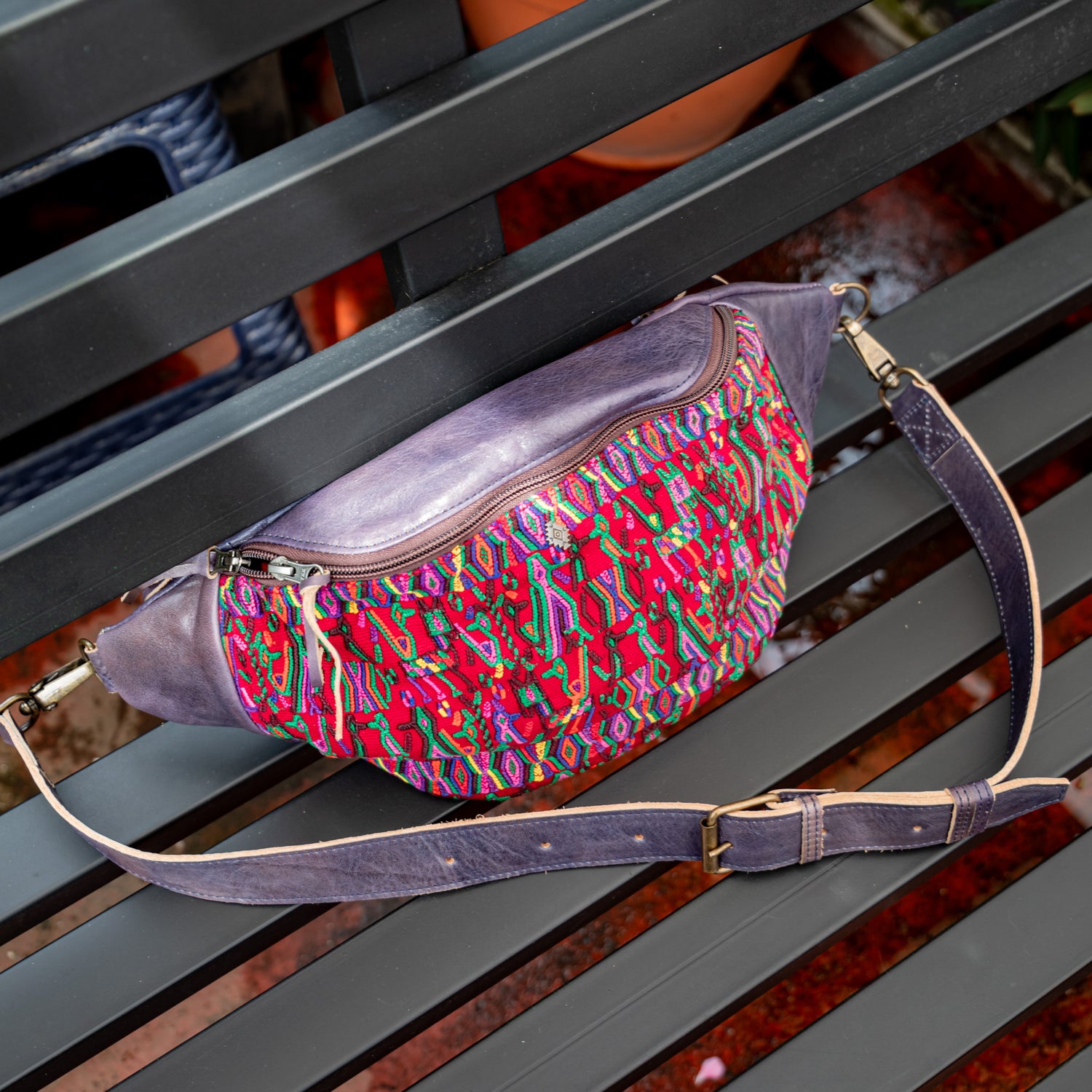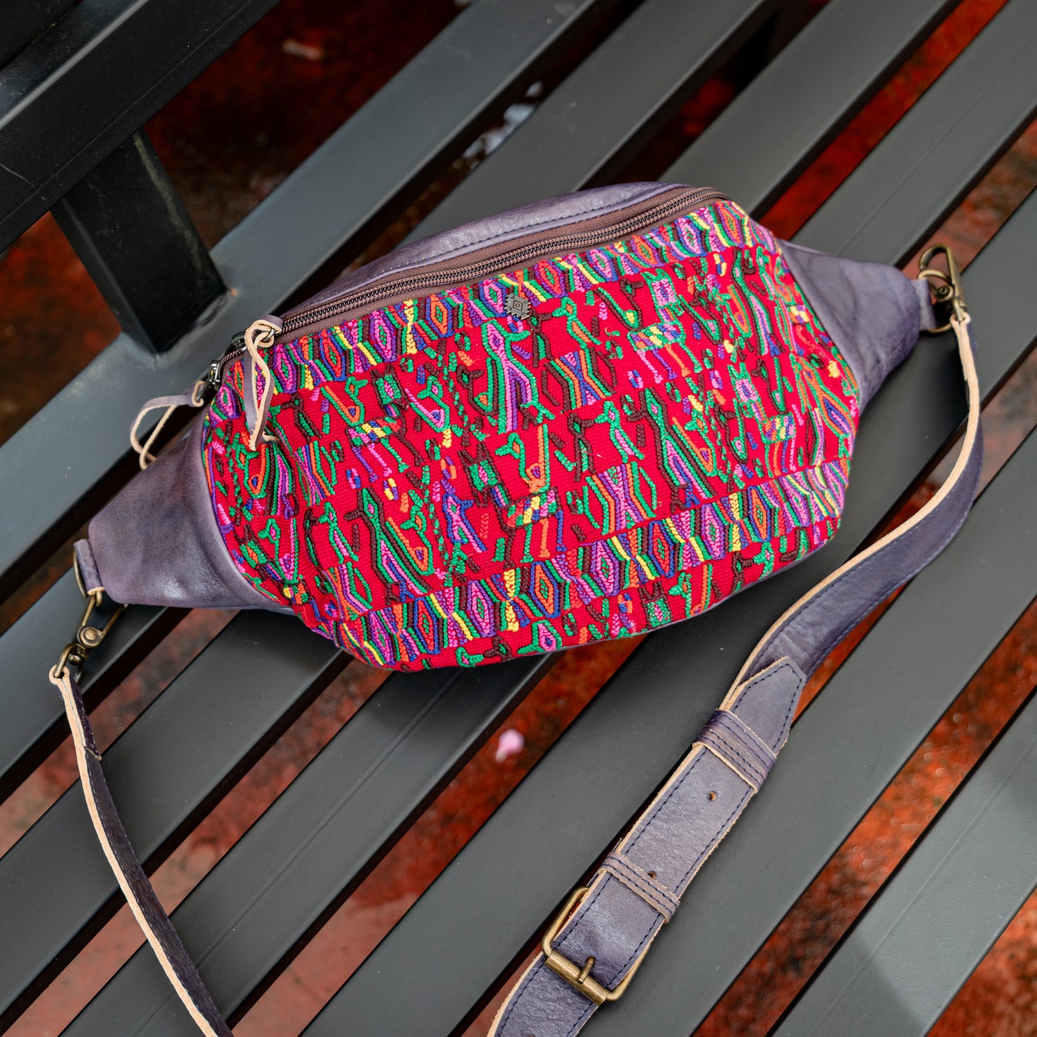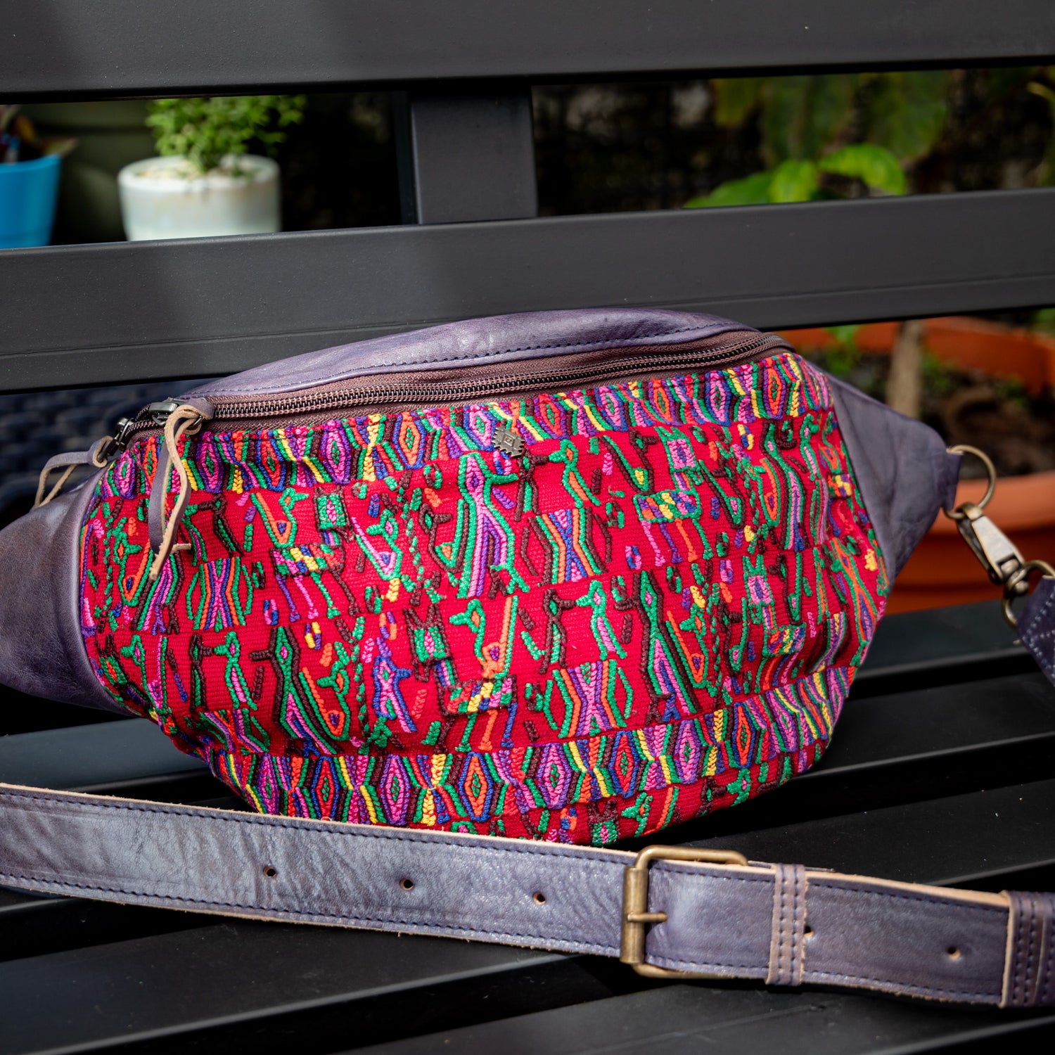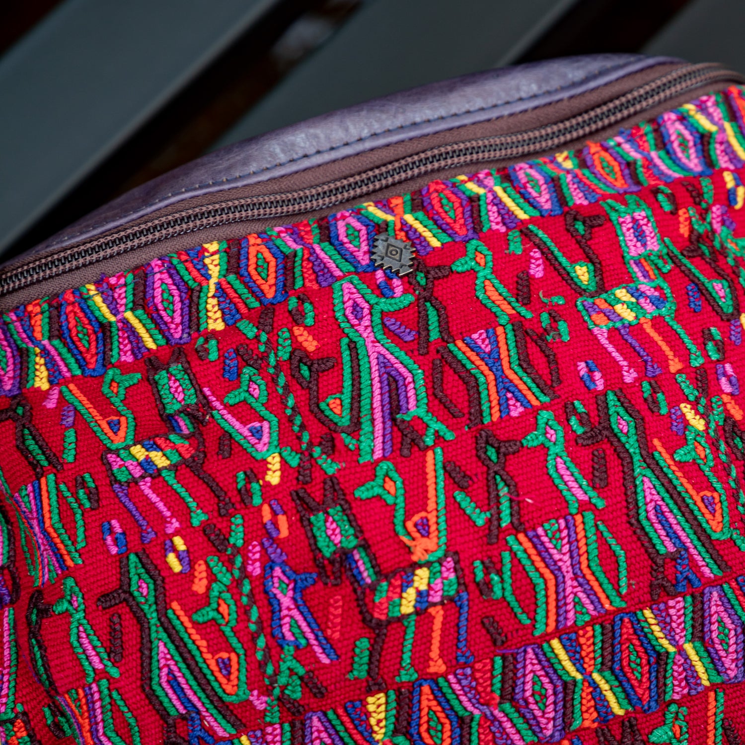 Many unique Maya symbols can be found in our One of a Kind Collection. The fabric we use for this collection is made from upcycled vintage huipiles (traditional attire worn by women in Guatemala) that were handwoven by Artisans up to 10 years ago, and they have lived a full life before being incorporated into your leather bag!