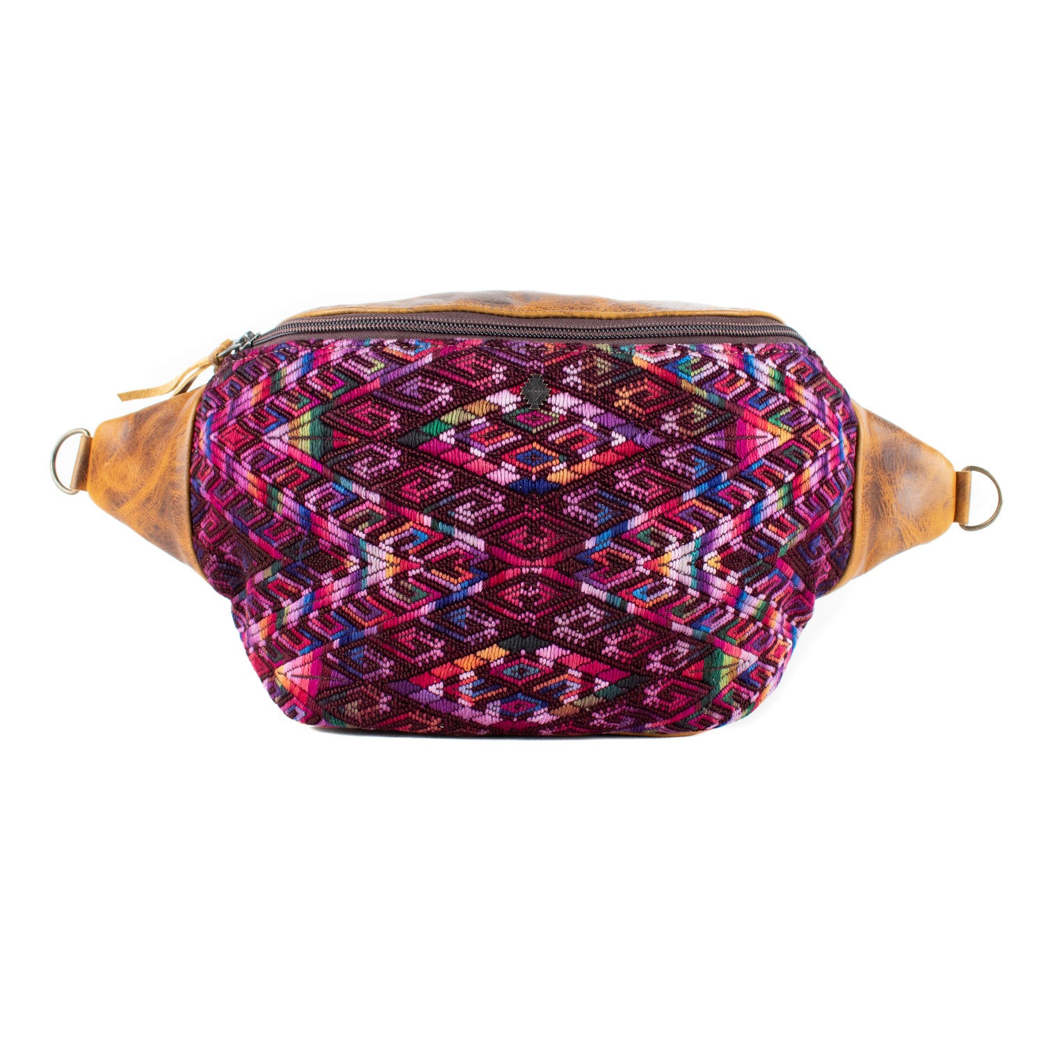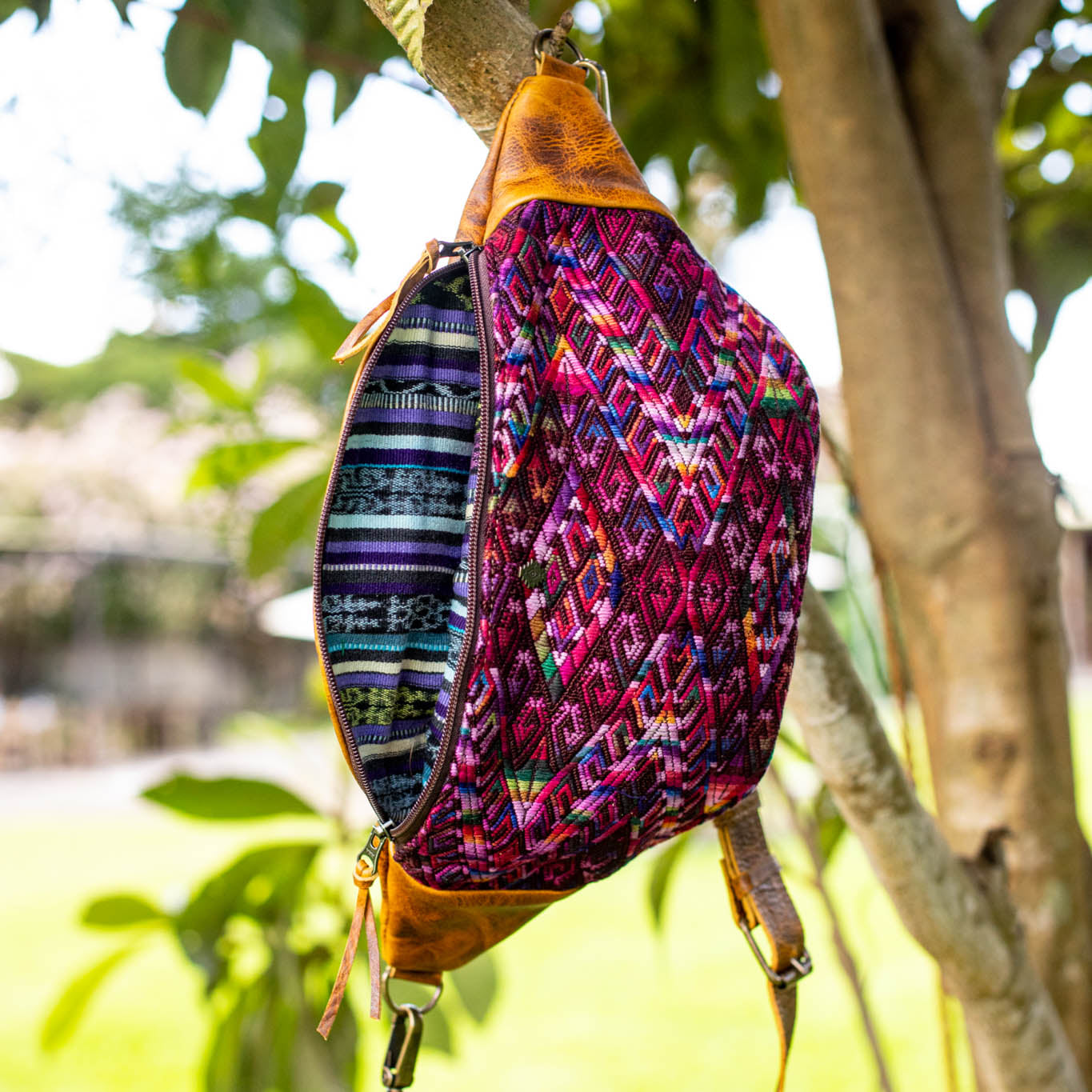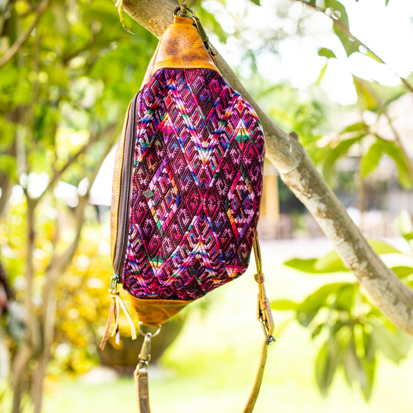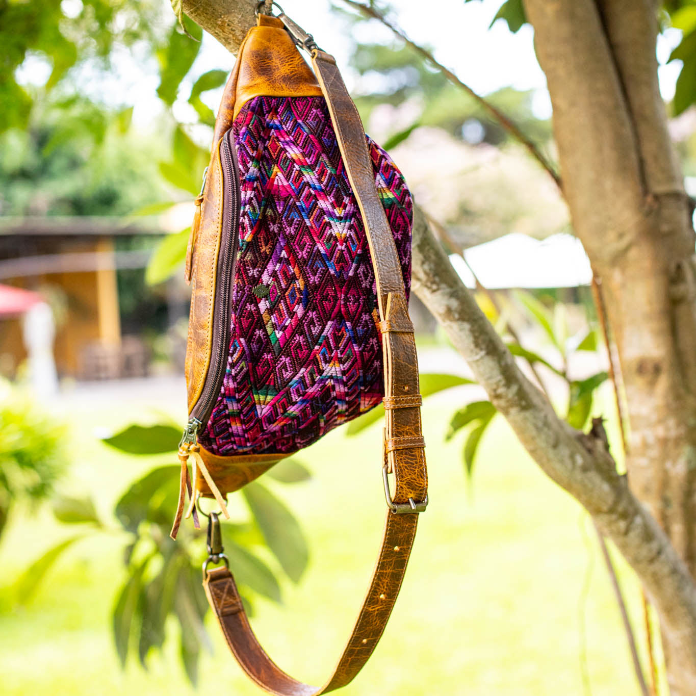 Many unique Maya symbols can be found in our One of a Kind Collection. The fabric we use for this collection is made from upcycled vintage huipiles (traditional attire worn by women in Guatemala) that were handwoven by Artisans up to 10 years ago, and they have lived a full life before being incorporated into your leather bag!