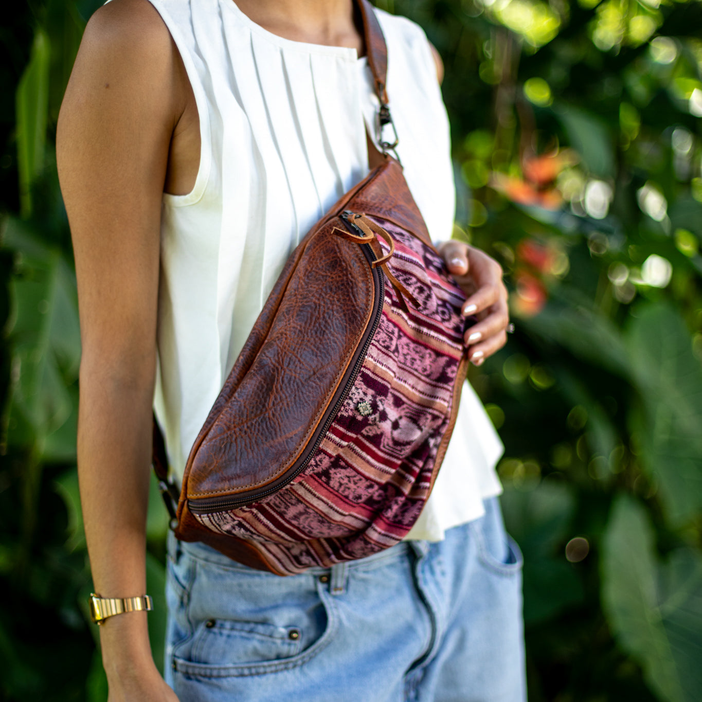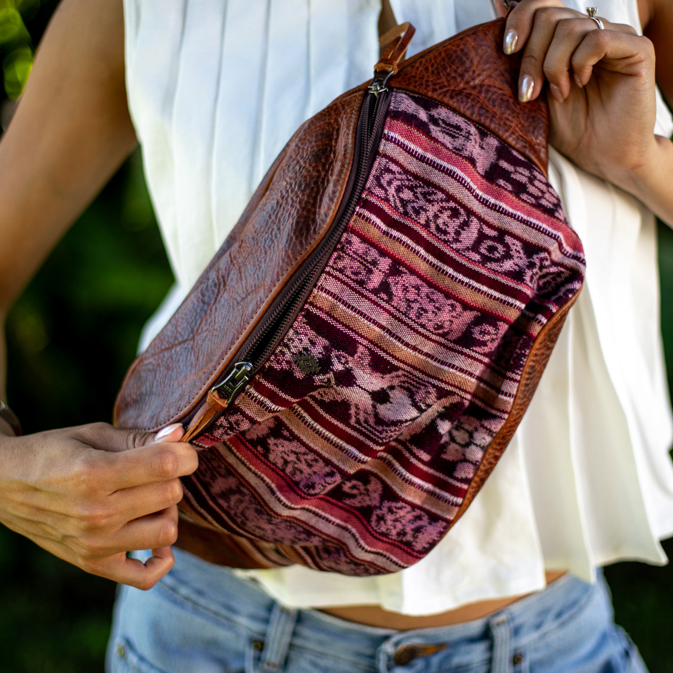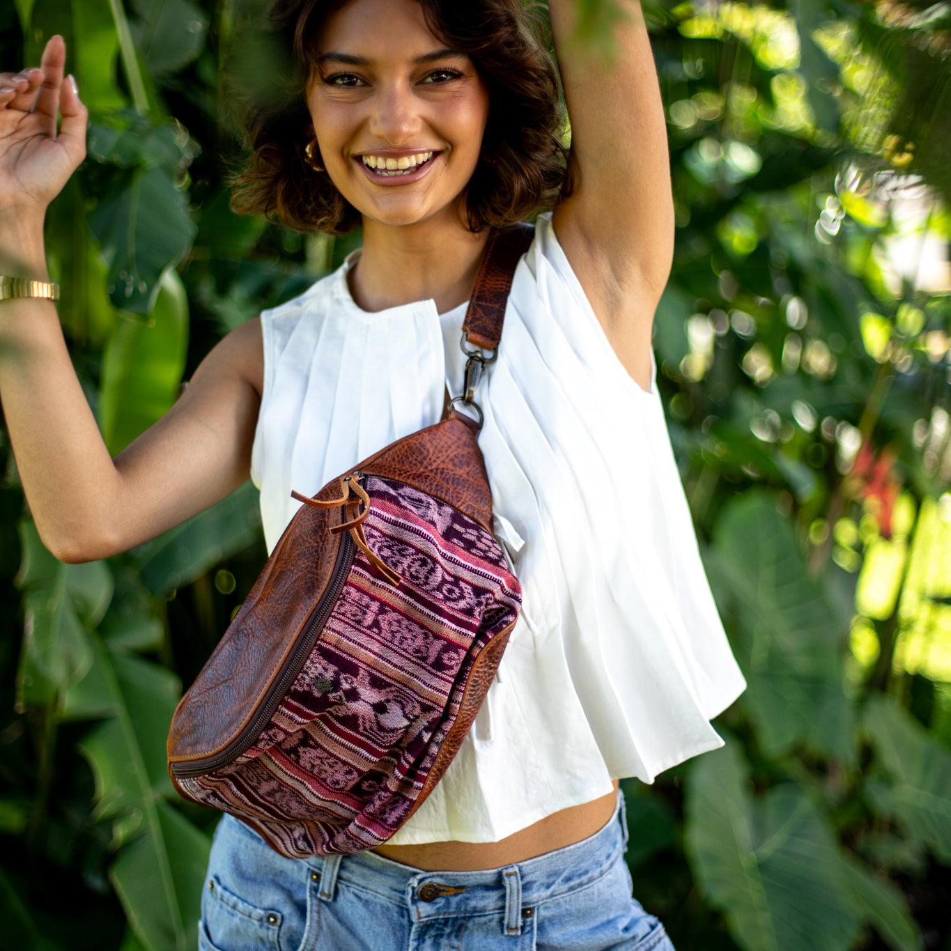 Many unique Maya symbols can be found in our One of a Kind Collection. The fabric we use for this collection is made from upcycled vintage huipiles (traditional attire worn by women in Guatemala) that were handwoven by Artisans up to 10 years ago, and they have lived a full life before being incorporated into your leather bag!