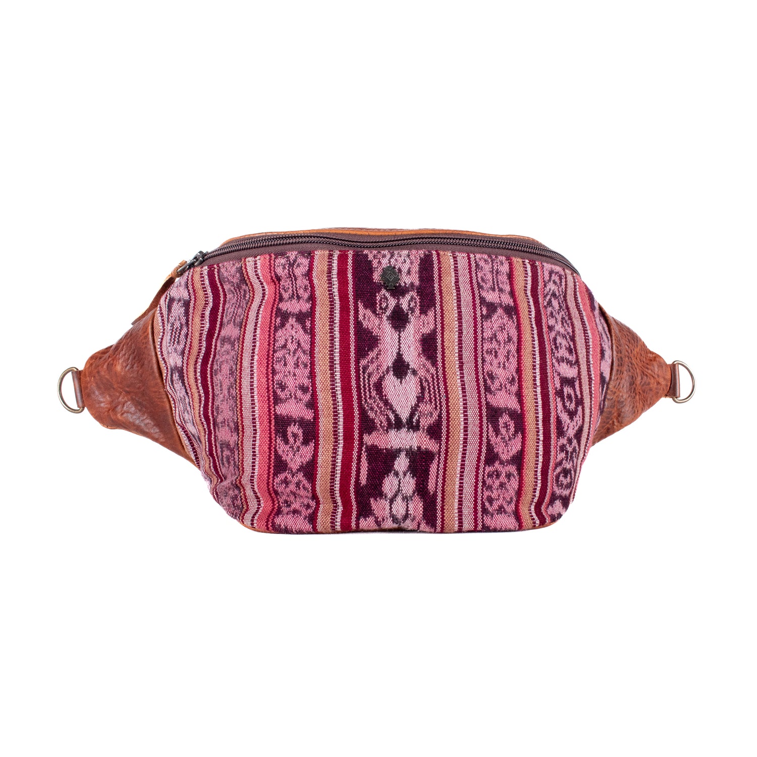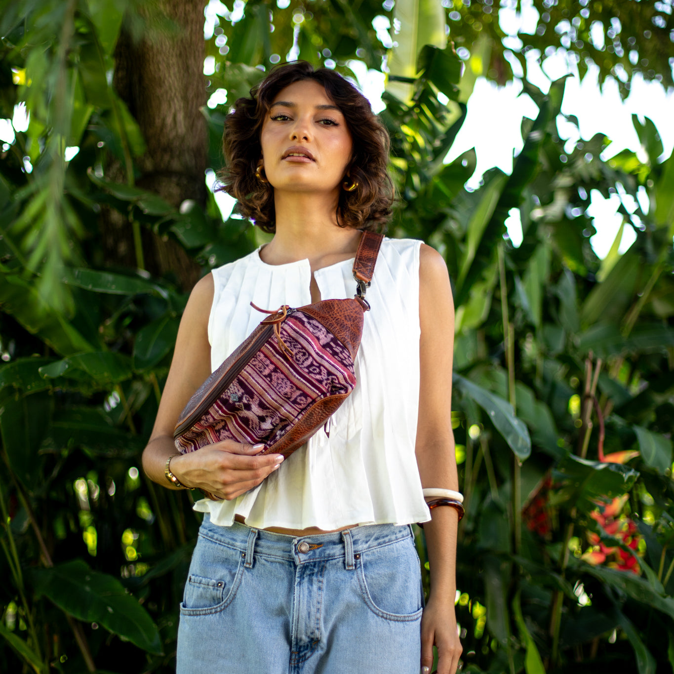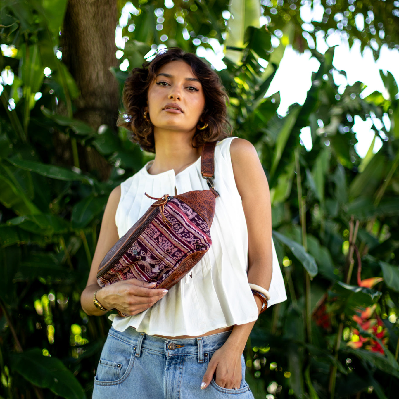 Many unique Maya symbols can be found in our One of a Kind Collection. The fabric we use for this collection is made from upcycled vintage huipiles (traditional attire worn by women in Guatemala) that were handwoven by Artisans up to 10 years ago, and they have lived a full life before being incorporated into your leather bag!