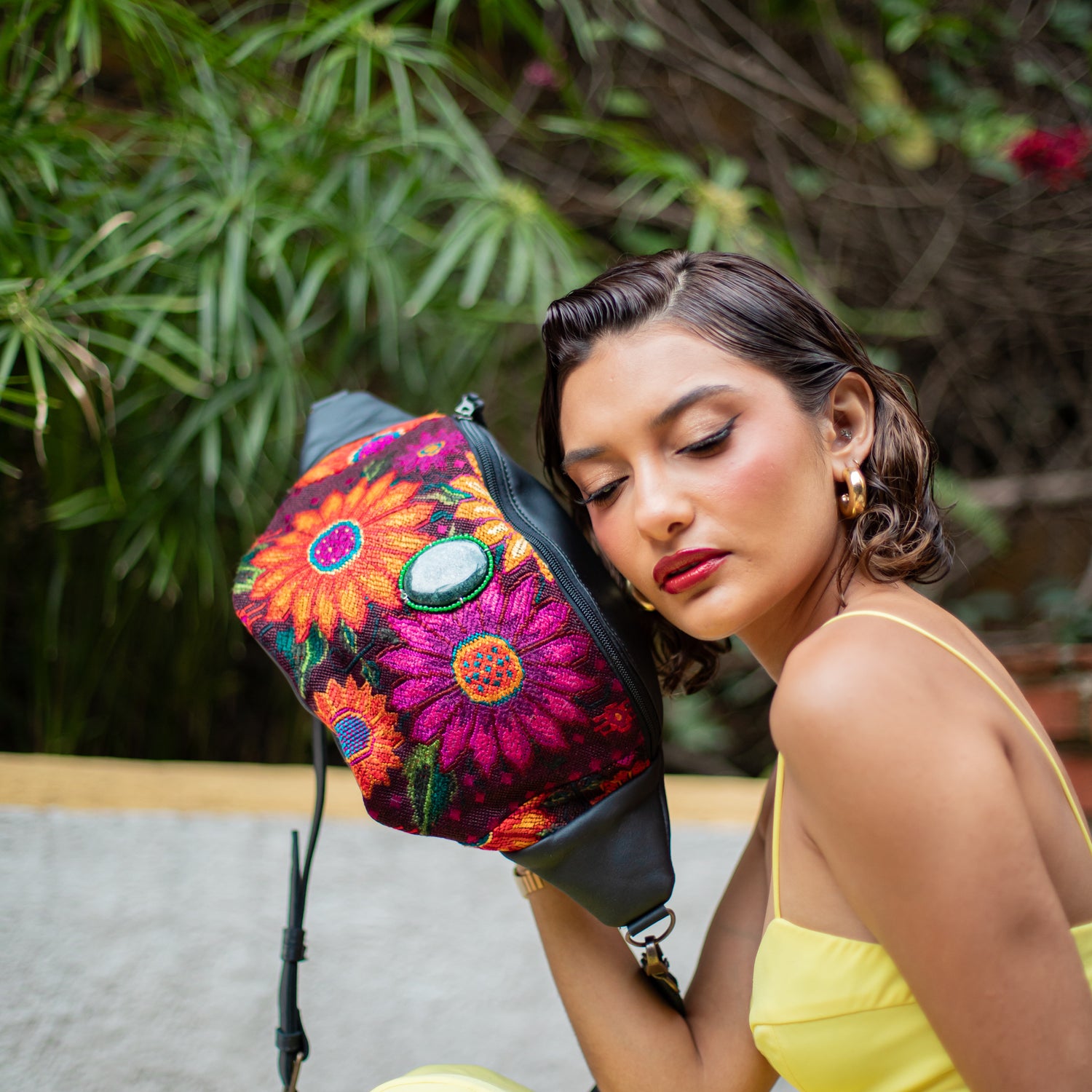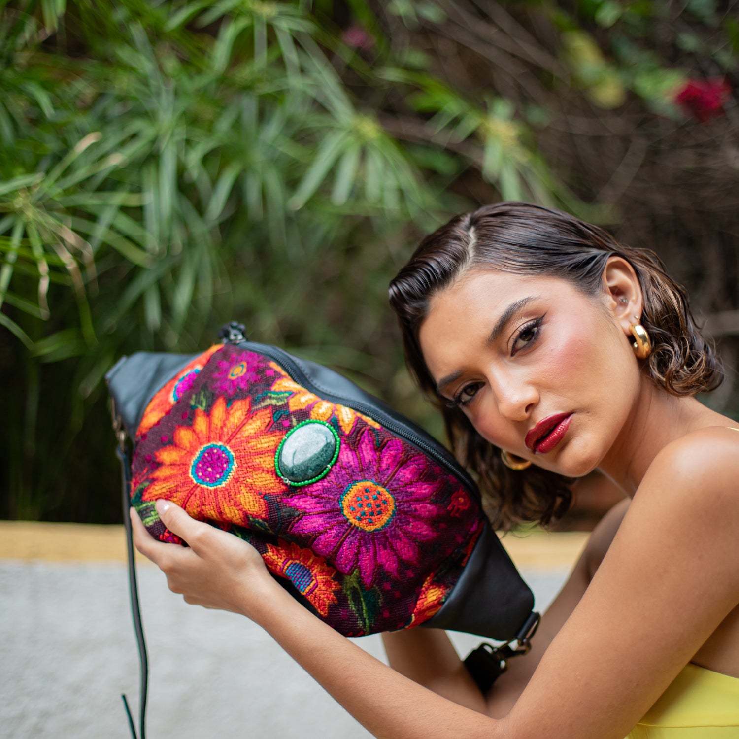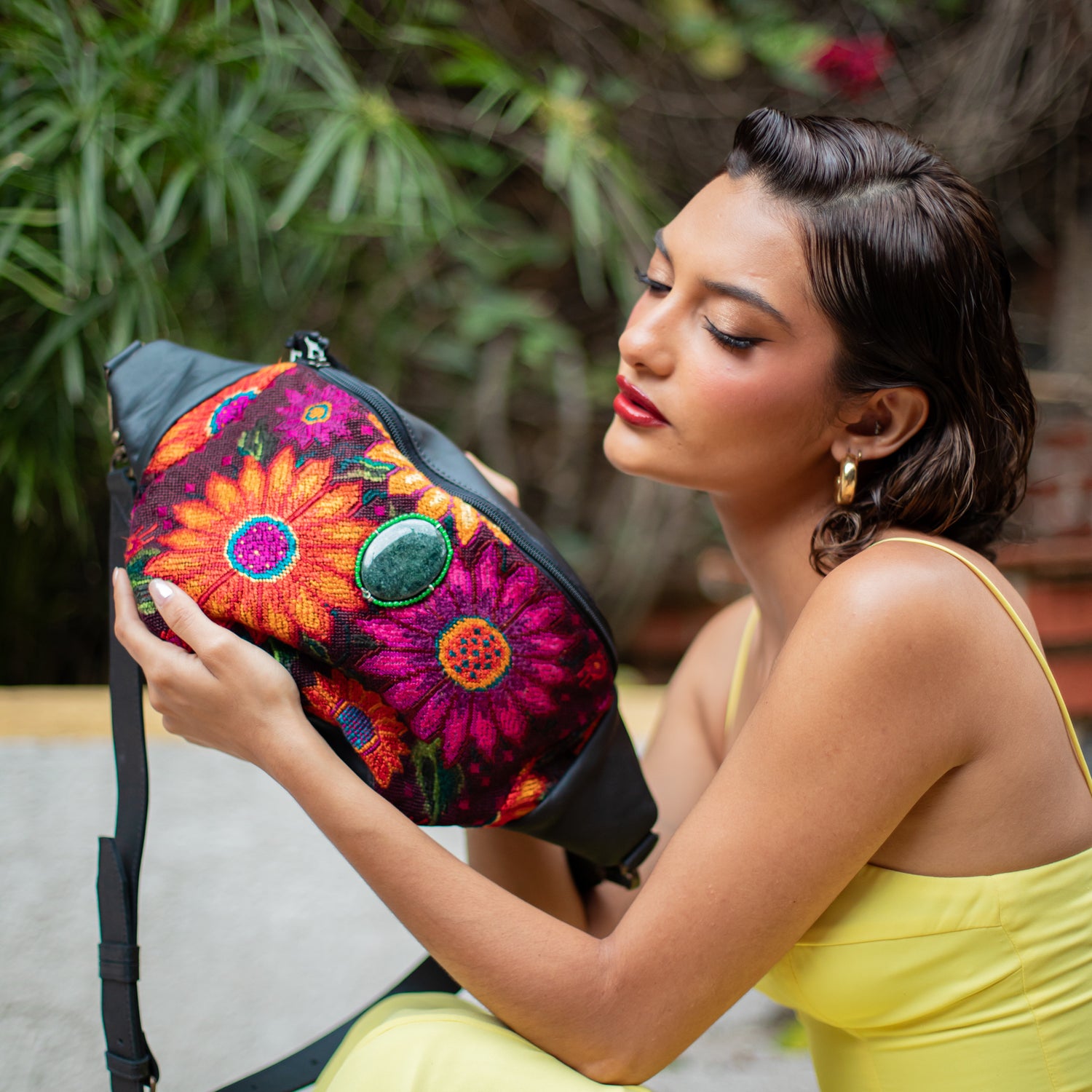 Many unique Maya symbols can be found in our One of a Kind Collection. The fabric we use for this collection is made from upcycled vintage huipiles (traditional attire worn by women in Guatemala) that were handwoven by Artisans up to 10 years ago, and they have lived a full life before being incorporated into your leather bag!