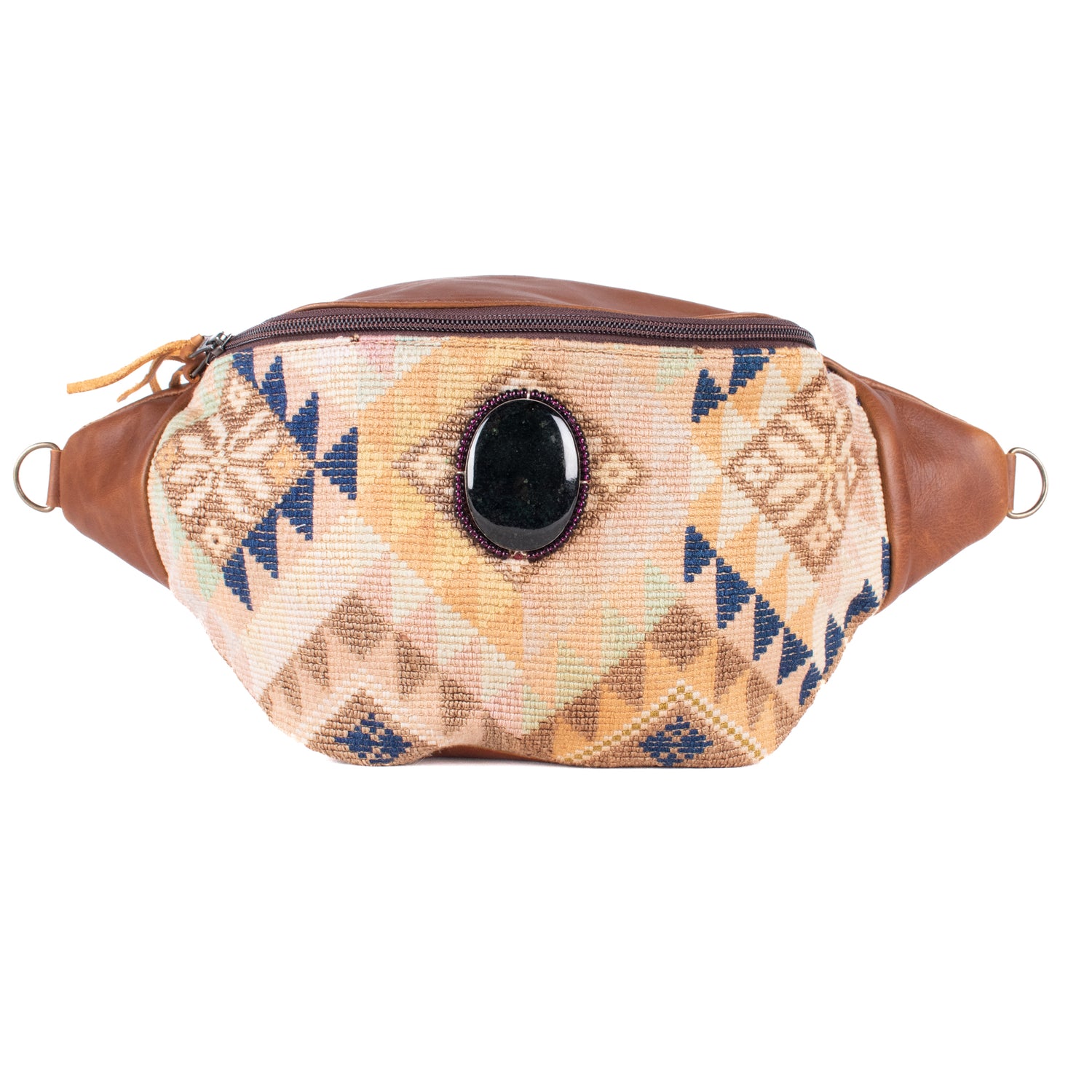 Many unique Maya symbols can be found in our One of a Kind Collection. The fabric we use for this collection is made from upcycled vintage huipiles (traditional attire worn by women in Guatemala) that were handwoven by Artisans up to 10 years ago, and they have lived a full life before being incorporated into your leather bag!
