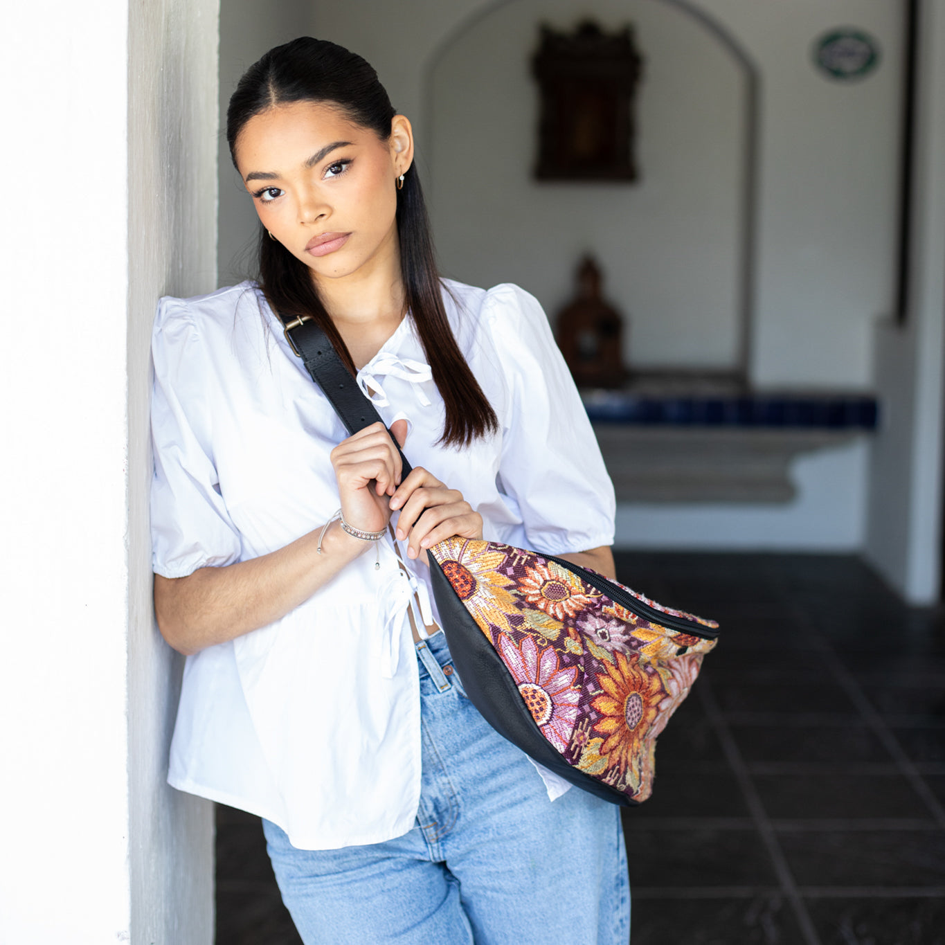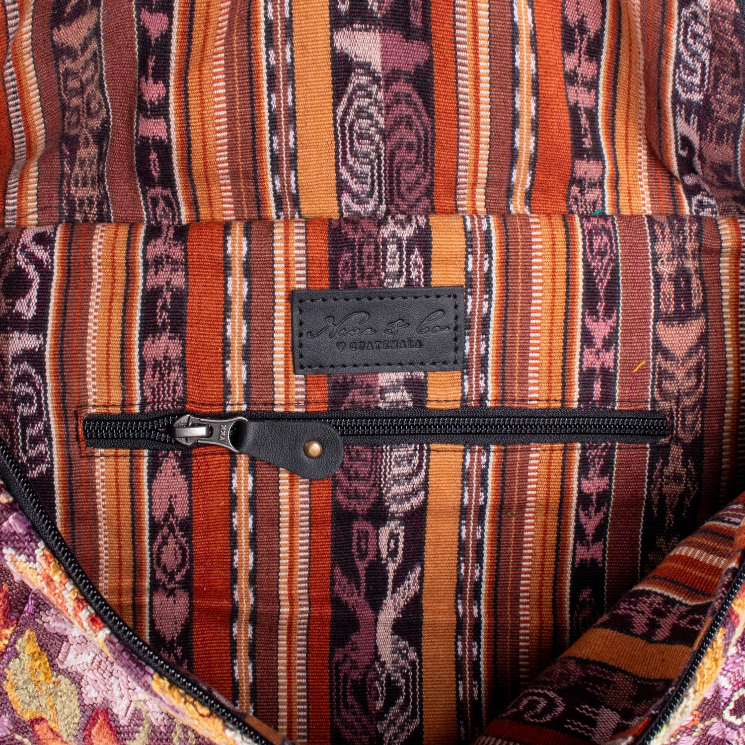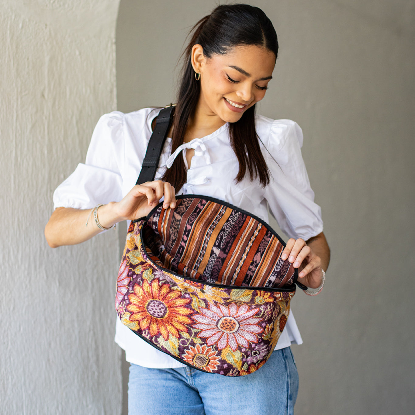 Many unique Maya symbols can be found in our One of a Kind Collection. The fabric we use for this collection is made from upcycled vintage huipiles (traditional attire worn by women in Guatemala) that were handwoven by Artisans up to 10 years ago, and they have lived a full life before being incorporated into your leather bag!