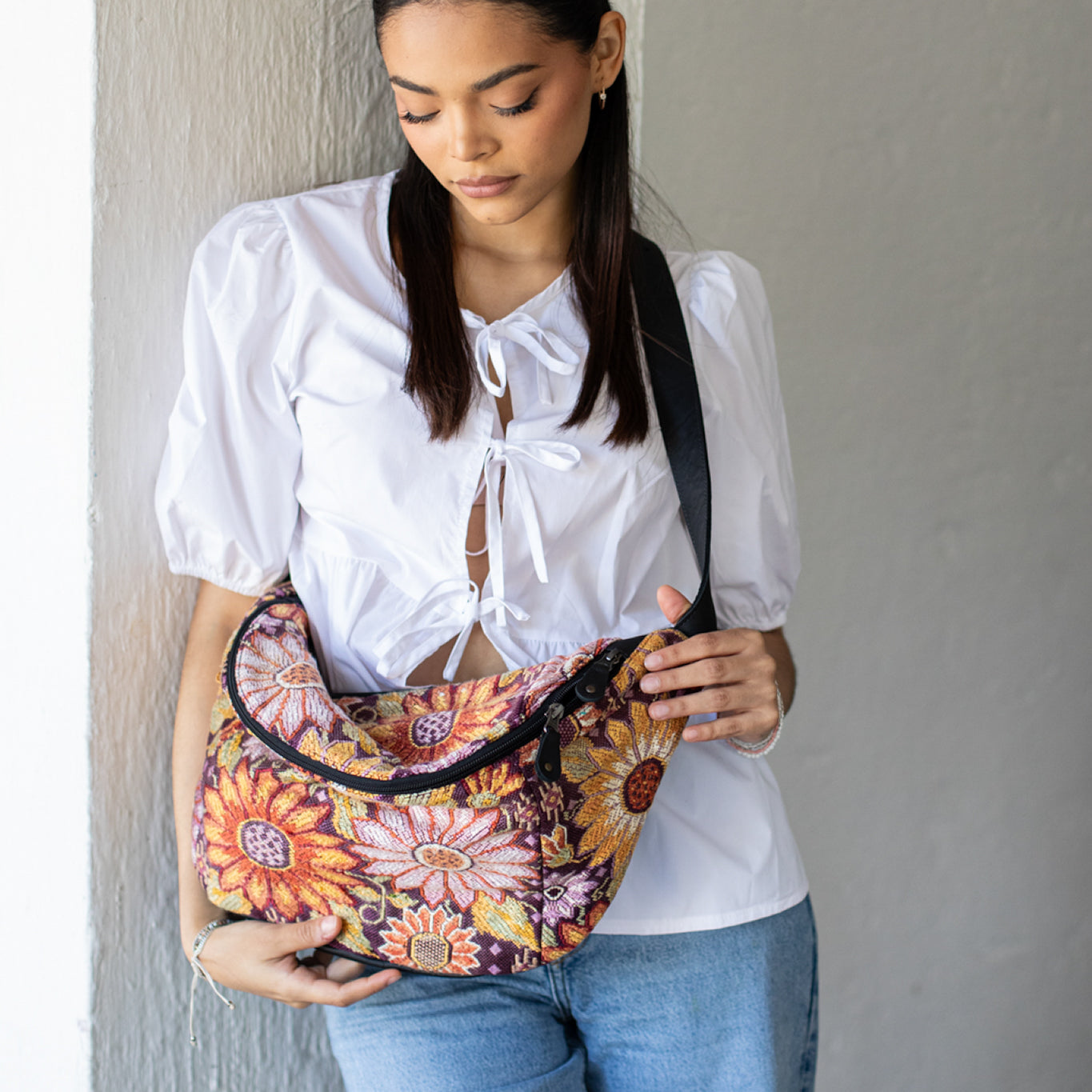 In Maya tradition, the Moon goddess Ixchel is the goddess of Womanhood. The Moon represents many aspects of womanhood, including the cycles of life, fertility, healing, and the textile arts. Appearing on a bag, the Moon means something different to every wearer, because no two women experience Womanhood the same way.