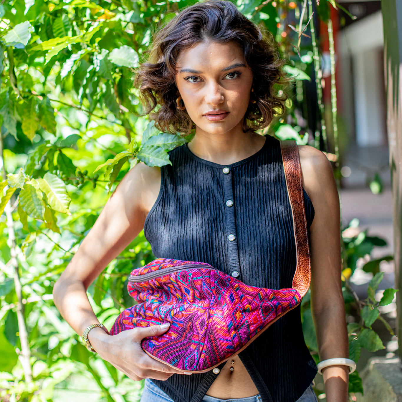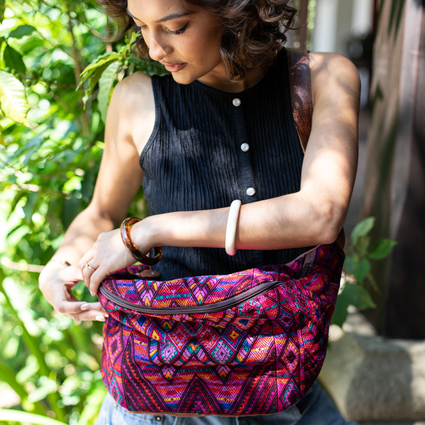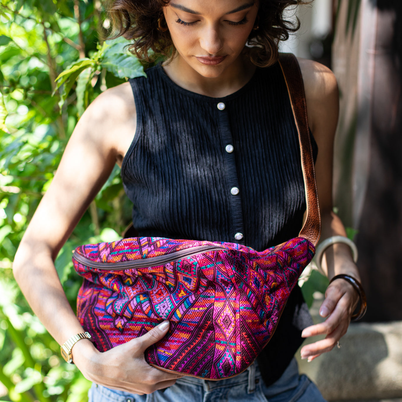 Many unique Maya symbols can be found in our One of a Kind Collection. The fabric we use for this collection is made from upcycled vintage huipiles (traditional attire worn by women in Guatemala) that were handwoven by Artisans up to 10 years ago, and they have lived a full life before being incorporated into your leather bag!