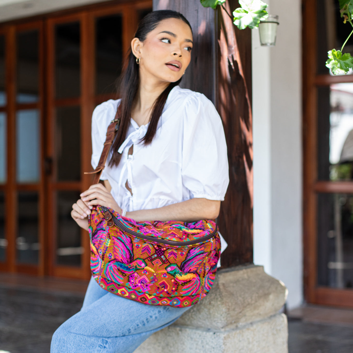Many unique Maya symbols can be found in our One of a Kind Collection. The fabric we use for this collection is made from upcycled vintage huipiles (traditional attire worn by women in Guatemala) that were handwoven by Artisans up to 10 years ago, and they have lived a full life before being incorporated into your leather bag!