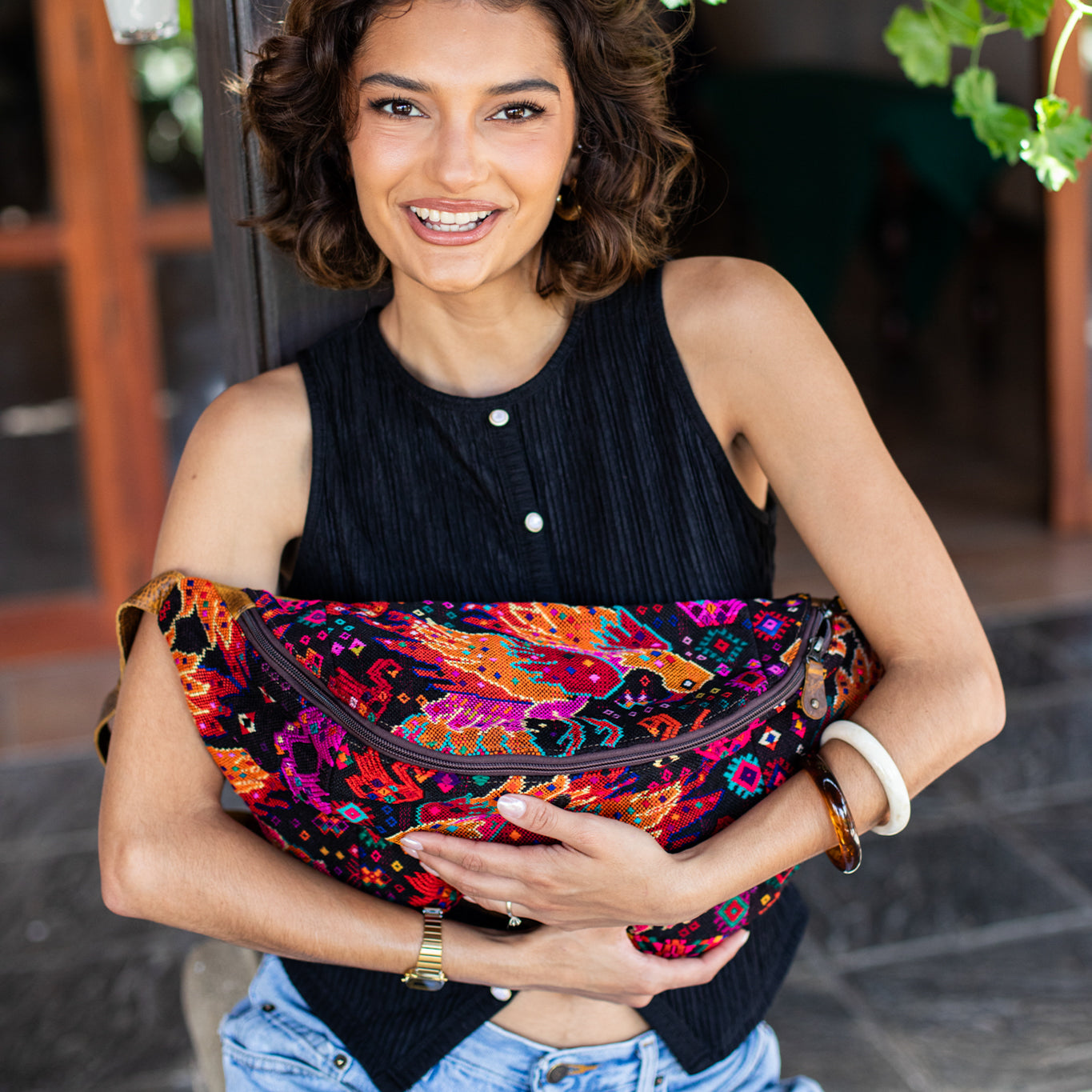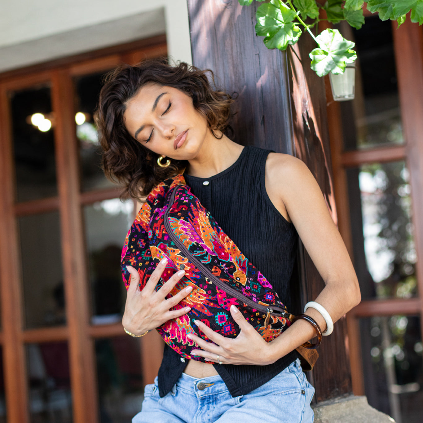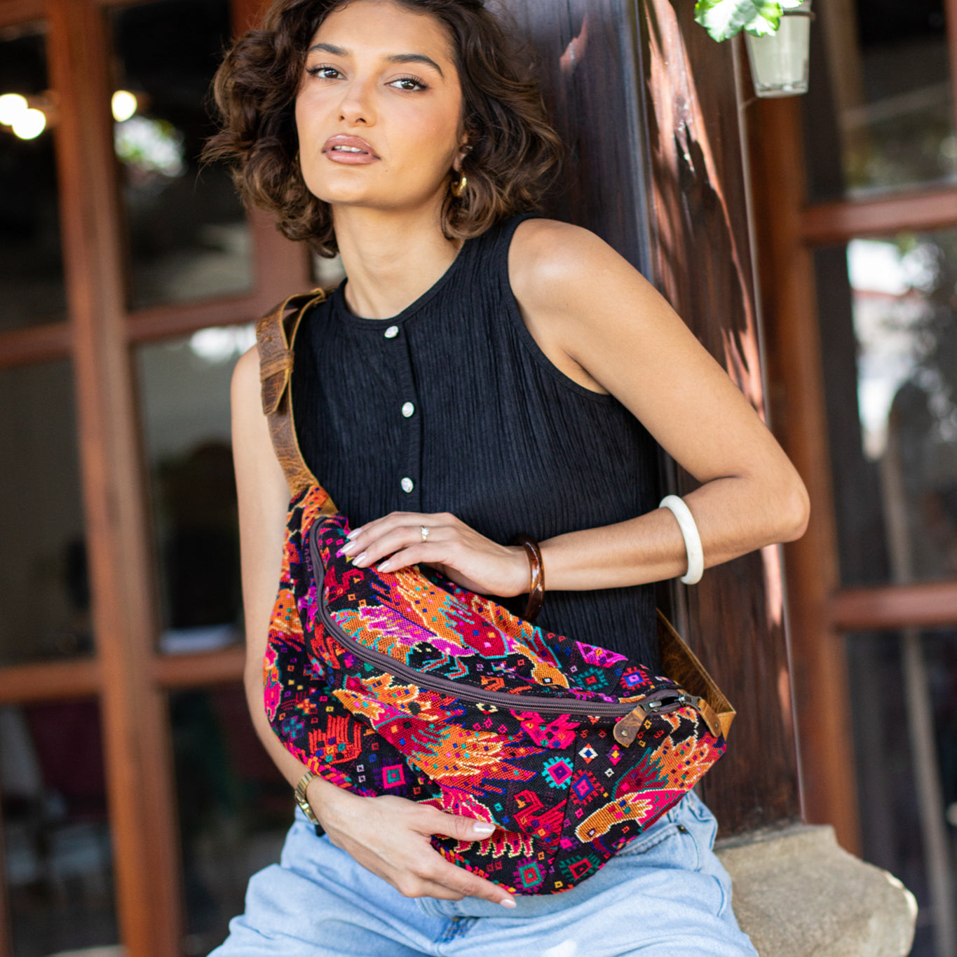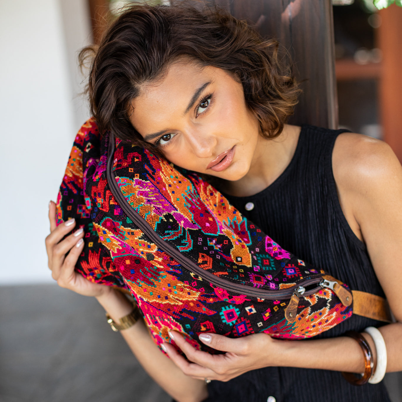 Many unique Maya symbols can be found in our One of a Kind Collection. The fabric we use for this collection is made from upcycled vintage huipiles (traditional attire worn by women in Guatemala) that were handwoven by Artisans up to 10 years ago, and they have lived a full life before being incorporated into your leather bag!