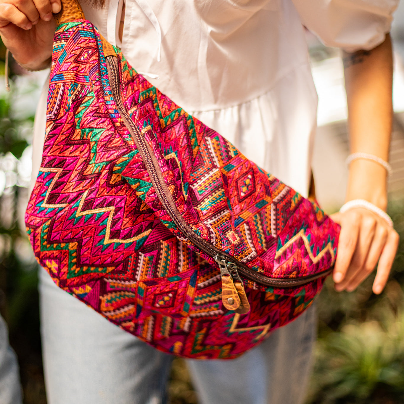 We make every effort to provide our customers with the best-handcrafted and high-quality bags. Please note that all our processes to make the bags are done by hand, from curing, cutting, and treating the leather to using up-cycled huipils. Our bags have natural characteristics and qualities that should not be considered as flaws or as damage because they do not interfere with the functionality of the bag. We up-cycle vintage Maya clothing to make beautiful one-of-a-kind products. Many times you will find snags in the pattern. This is normal. Should your patterned huipil snag you can snip the loose threads with scissors. Do not pull them.